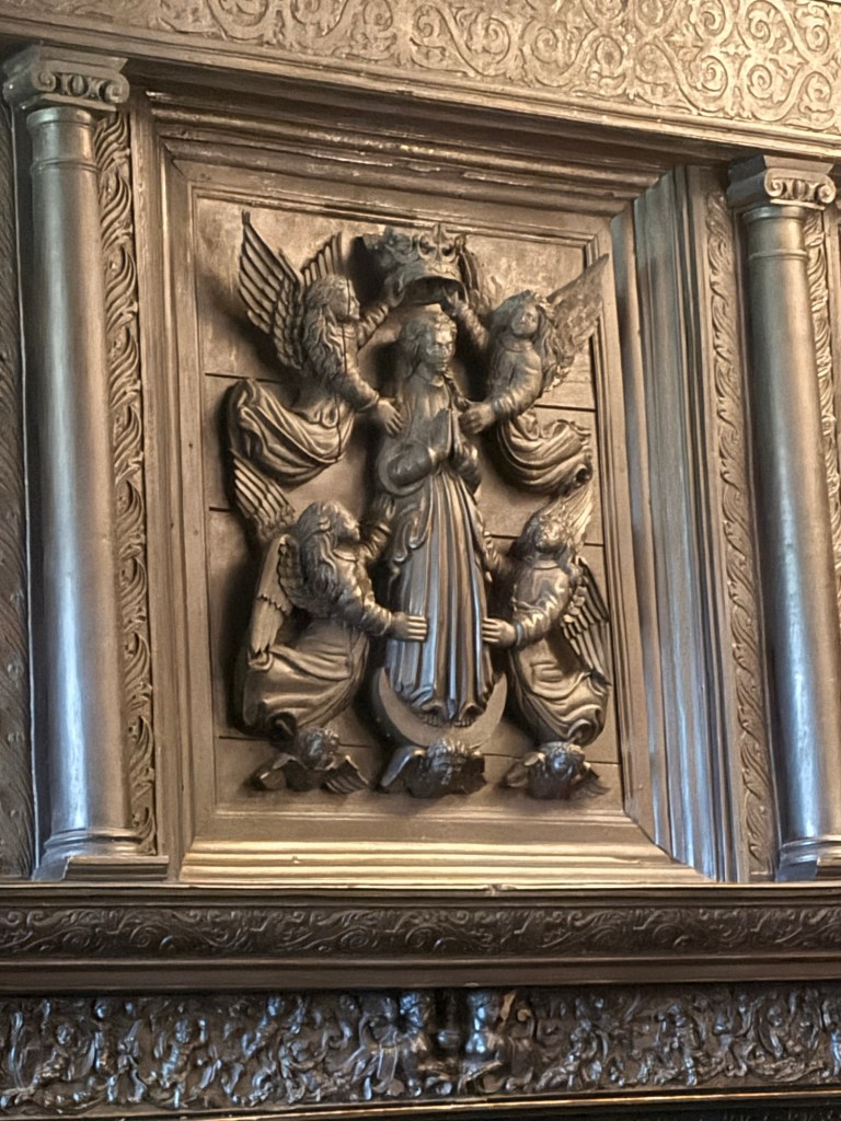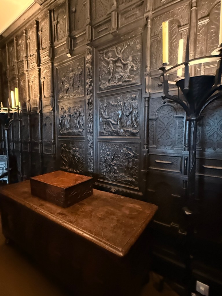 Old church The dark room is original14th century chairOnly religious carving of Virgin Mary left… is 500 years oldSecret door for Catholic priest to escape through. Italian marble around fireplaceLast Lord Talbot Talbots wife snd childrenScreen to protect the beeswax on the face of the women from melting from heat from fireplace. Supposed to be a ghost of woman that fell and diedBathtub had no drain so maids had to fill & empty itWhat a nice view to look at while having your morning tea Women had to leave after dinner to drawing room, then men drank more and smoked. JoWine cooler“Puck’s” (entertainer) way to get up to the stage above EntranceBroken windowMalahide Castle est 1066 AD