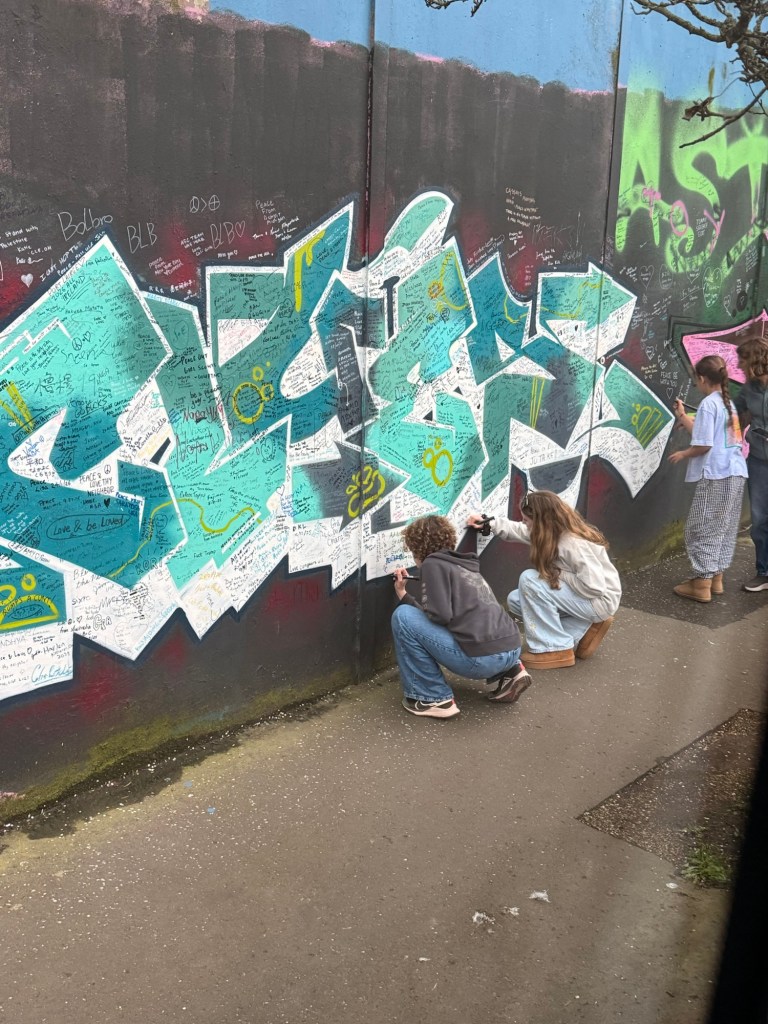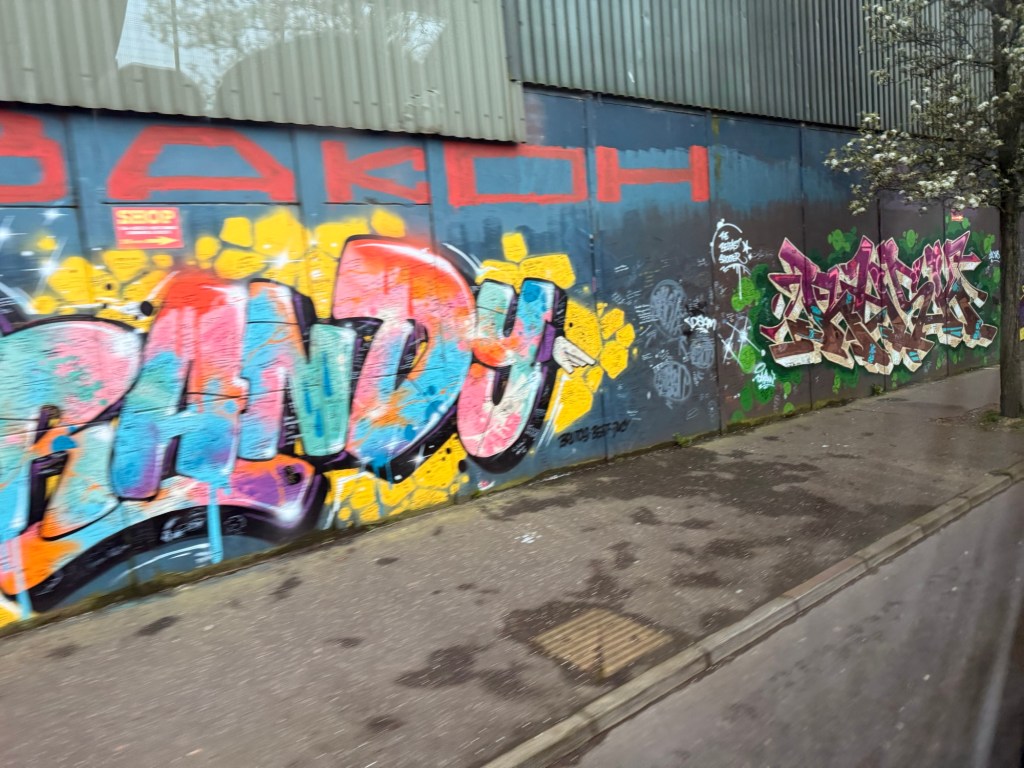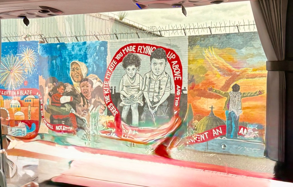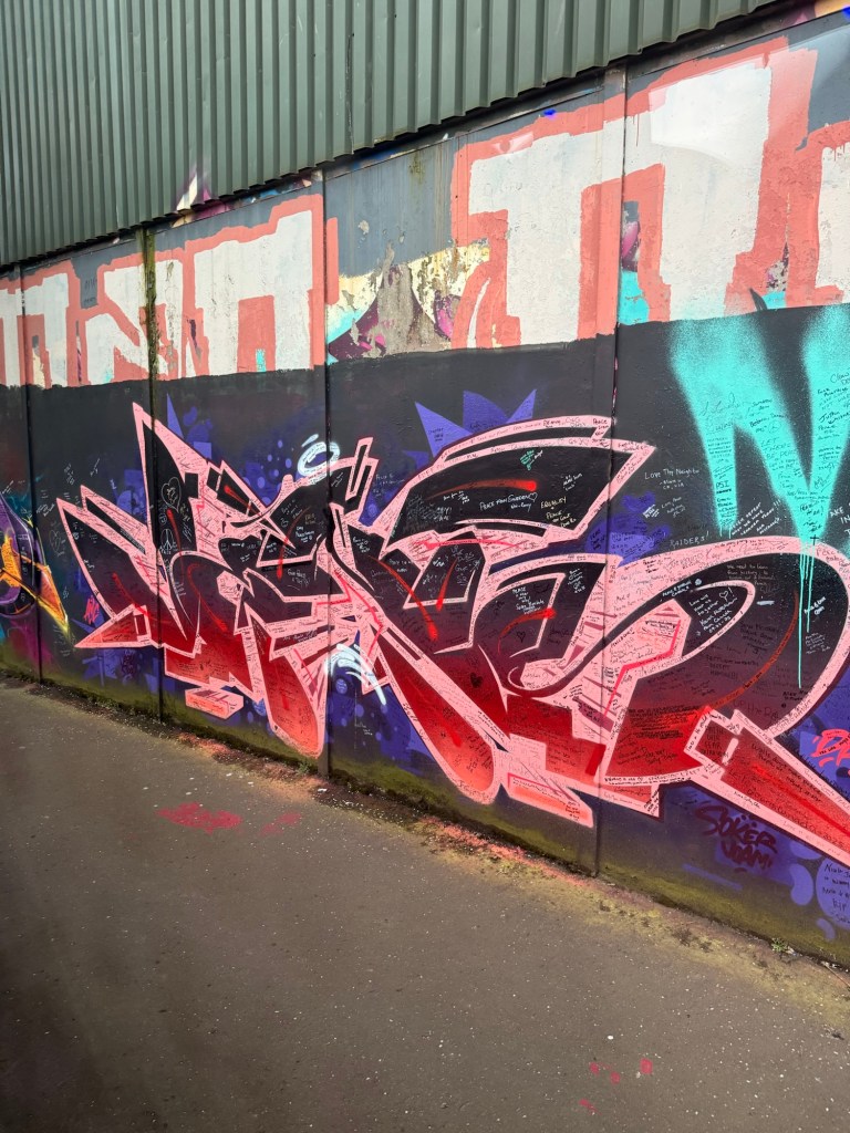 “Falls Road”… Peace Gate that is covered with graffiti and painting and lots of signatures. It was erected in 1998 in support.,, was decided to keep the wall for 20 years but the 2 sides are still divided and so it stays. On one side they want to leave N.I. and have Irish passports, are Catholics, Nationalist, support Palestinians, then the Unionist on other side of the street support Israelis, are Protestants and support the British. They were also called Loyalists.
