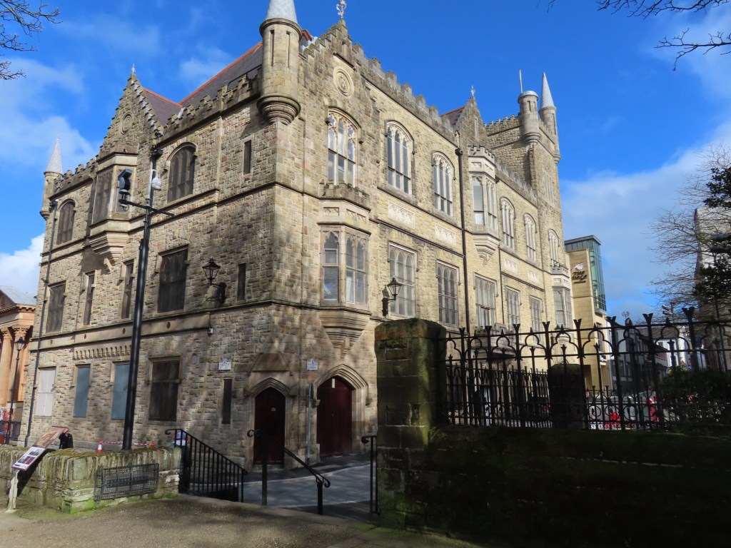 Interesting that some letters are obliterated…. Red light ddistrict nearby?Employment exchange turned City hallIsolde’s Tower Replica of Viking longship that had arrived in 795 AD.Windiest road in DublinWhere Handel wrote The Messiah