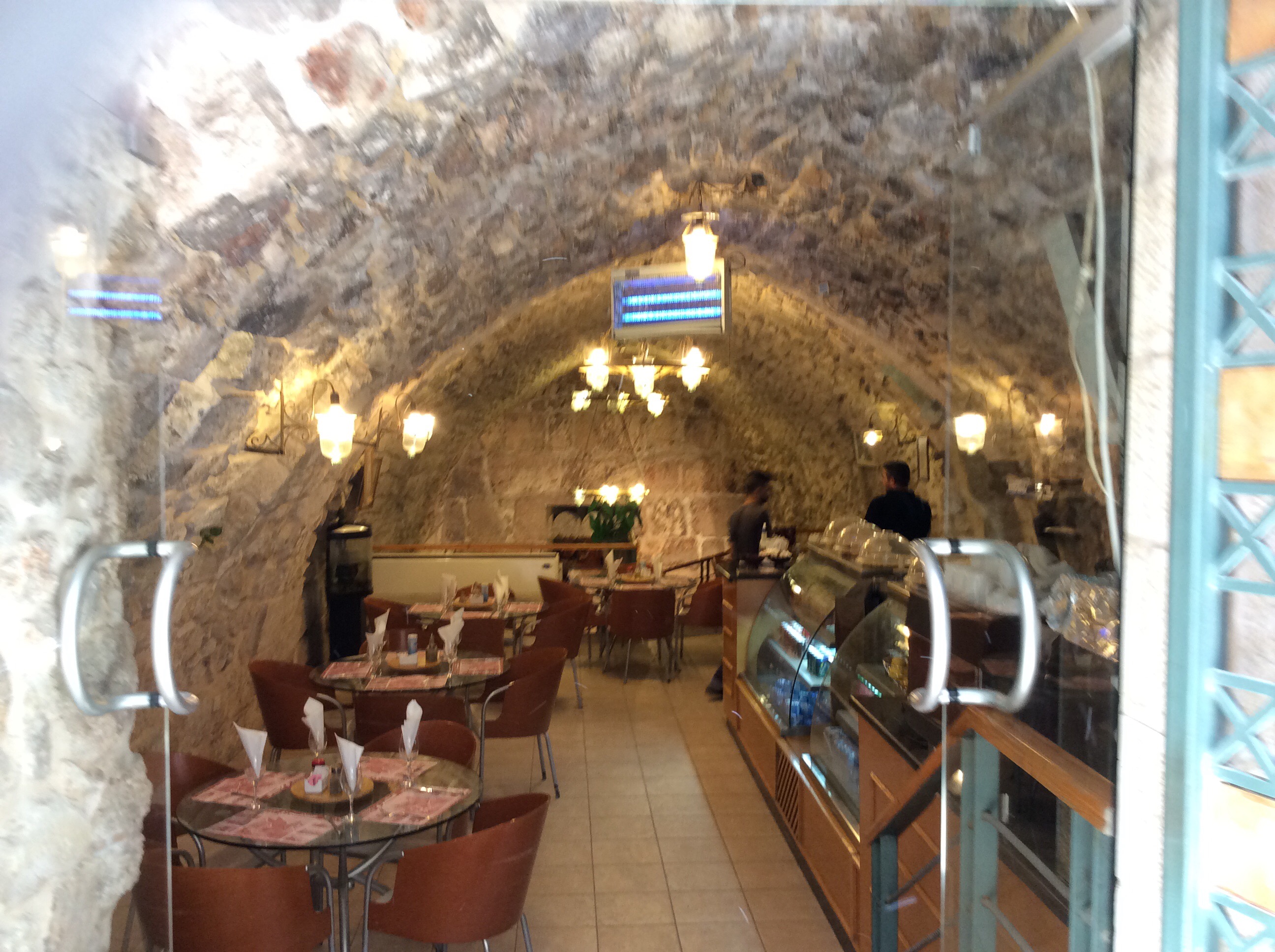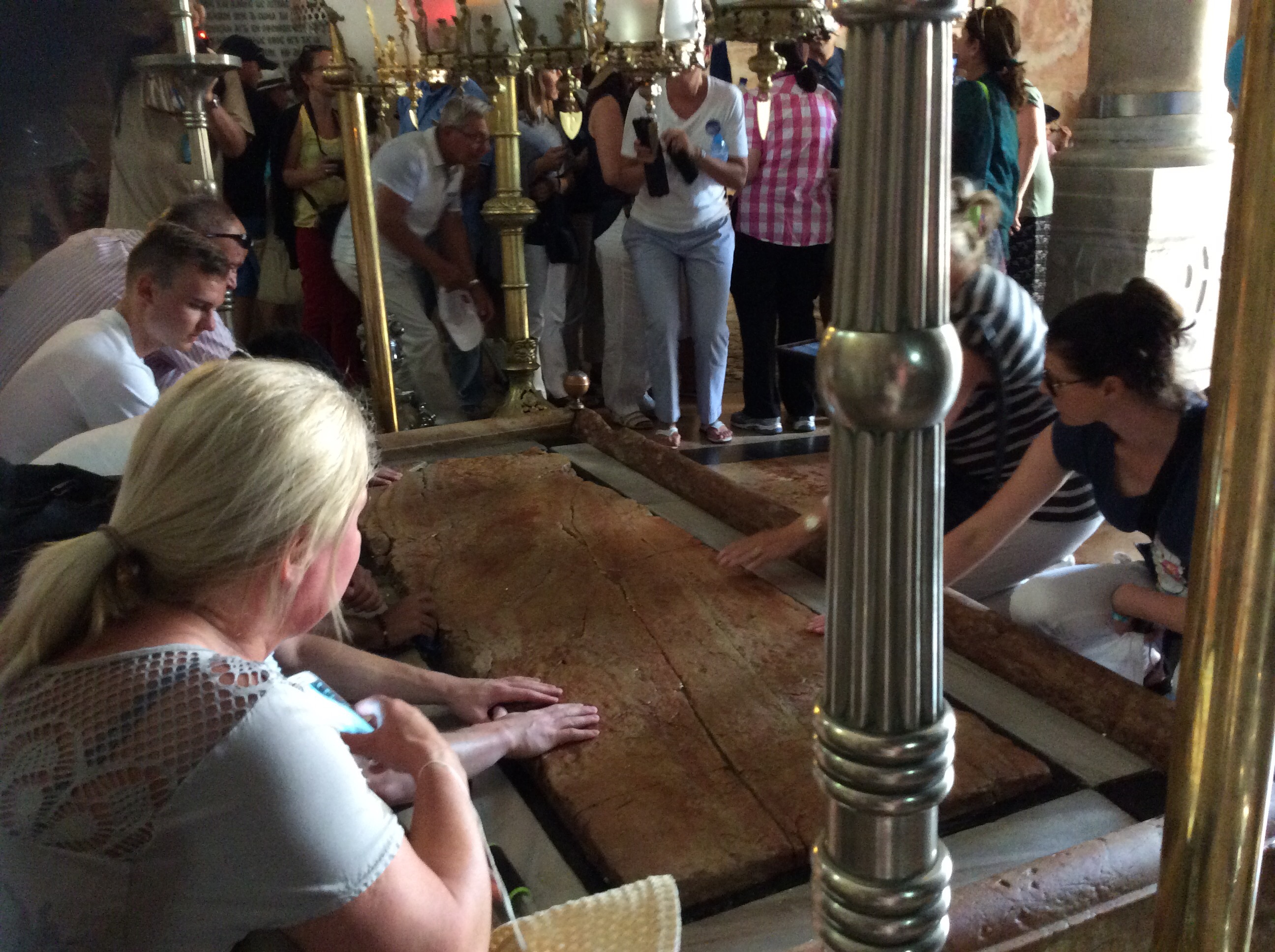 We entered Jerusalem at the Dung Gate. It is the lowest. First we walked to the Wailing Wall. People are sticking notes in the cracks in the wall and praying.  The day before some of the gals had said that people were wailing (of course it was the Sabbath.  That may explain the difference).  As we walk along the Via Dolorosa (too fast to buy anything from the vendors. We were annoyed that we couldn’t support the local economy), we pass the 7(?) stations, one place where Jesus is said to have leaned against the wall (it is indented from so many people over the centuries leaning against it as well). From there to the Church of the Holy Sepulchre. It is built over top of the rock where Jesus’ cross was installed (it’s encased in glass), the slab on which his body was placed, etc. then it was time to go for a beautiful buffet lunch at the Olive Tree Hotel, the crappy souvenir shop and head in back to the ship. Too short of a time to take it all in. We barely scratched the surface. We had gone through the Christian, Jewish and Muslim sections but did not go in any of the other religious places of worship.