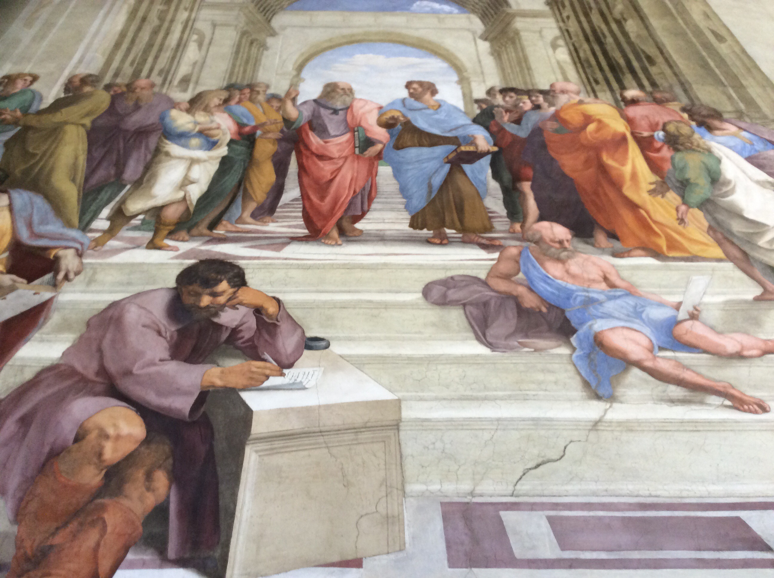 Raphael in competion with Michaelangelo, Raphael had helpers, M. did it all by himself.