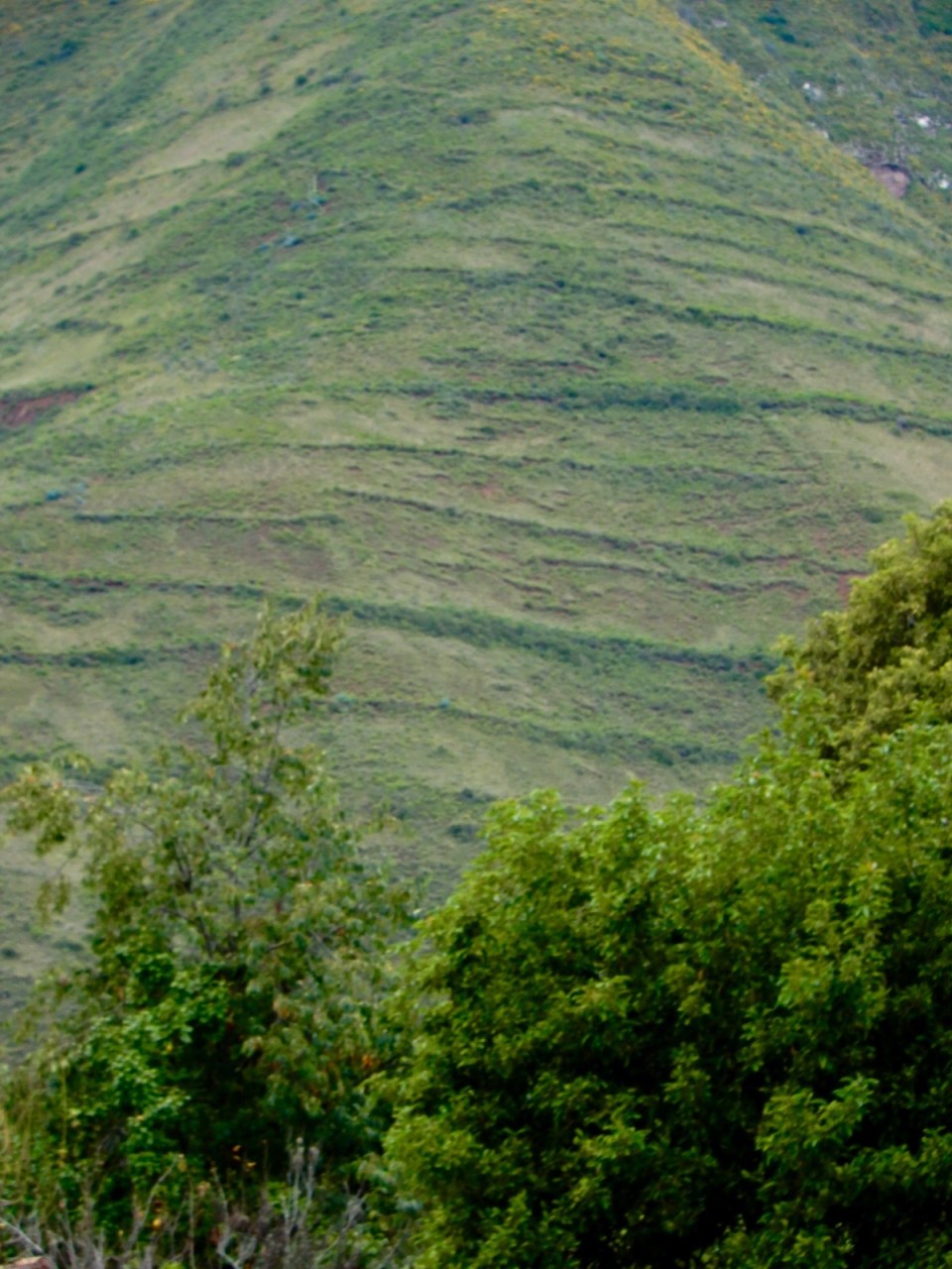 On top of huge terraced tract is a temple but was incomplete because Spaniard came in 1530s. Some of the terraces were built pre-Inca. They moved 40-50-70 ton granite boulders by using pebbles and logs because they didn’t have the wheel.