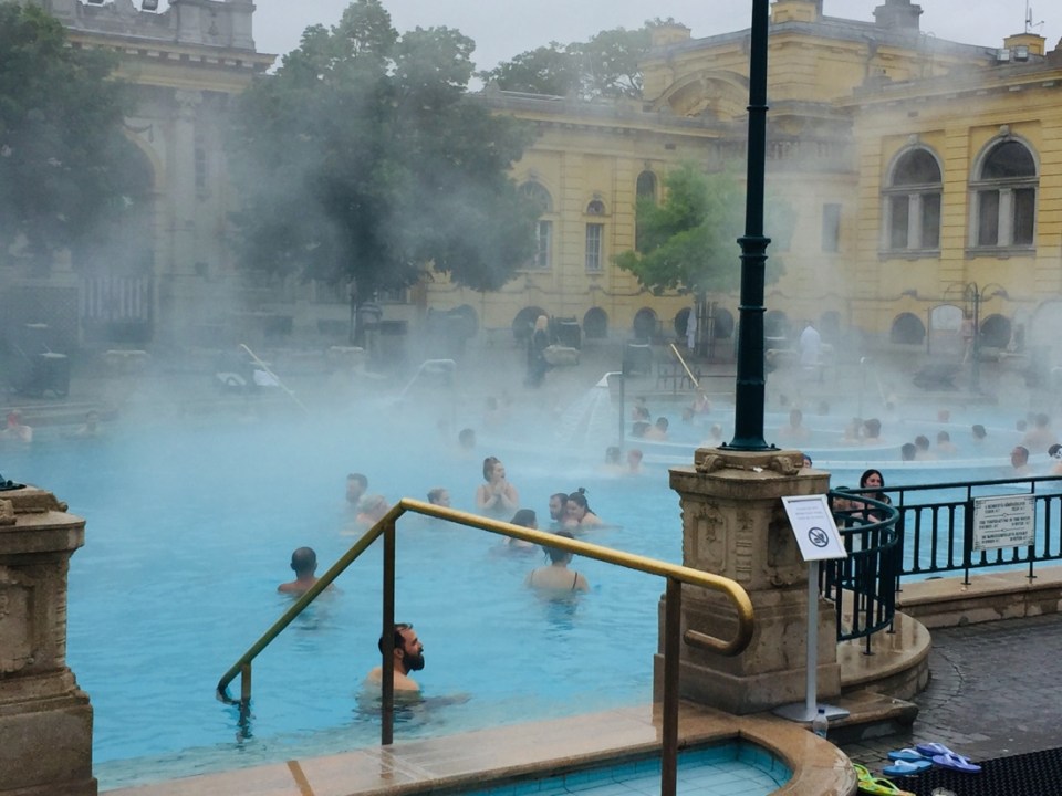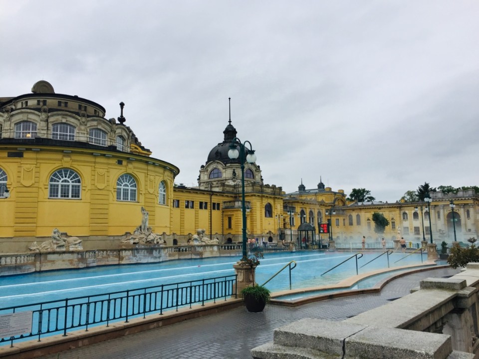One of the highlights of our stay in Budapest was going to the thermal baths at Szechenyi. It is a huge facility. There are 3 pools outside of varying temperatures and depths. Inside there are 15 smaller baths.