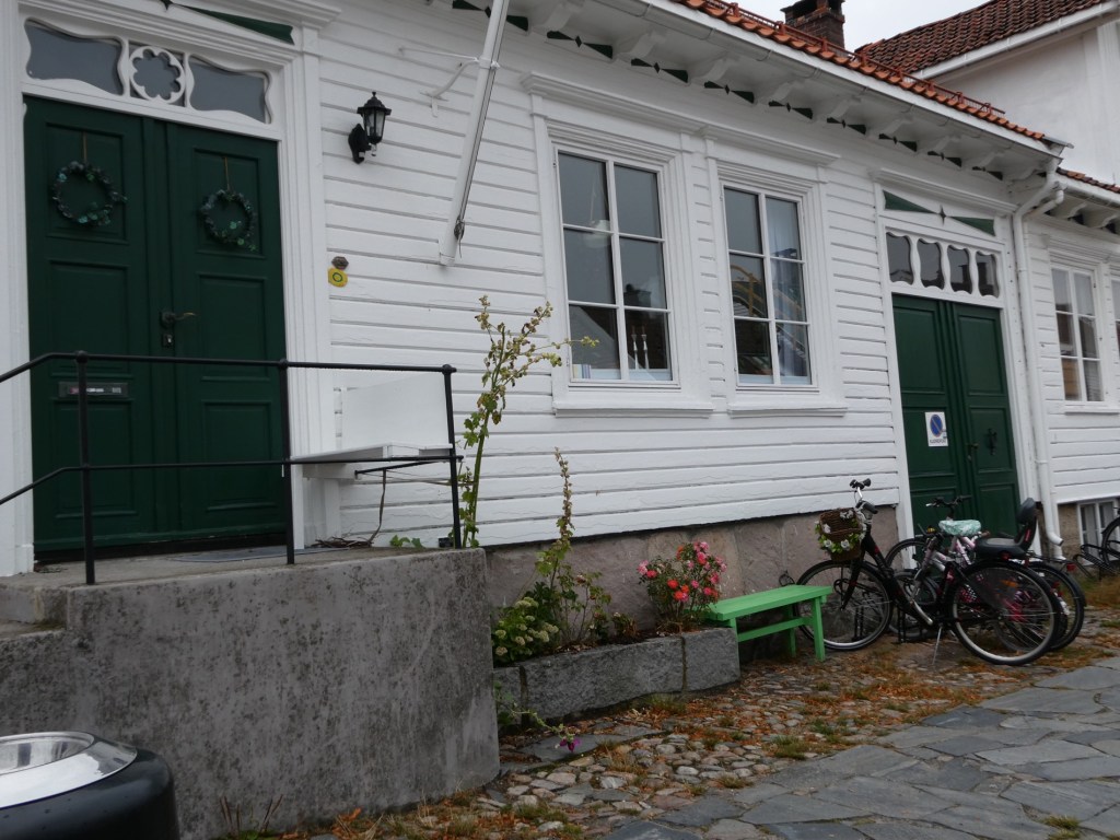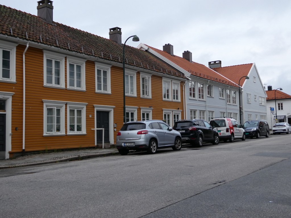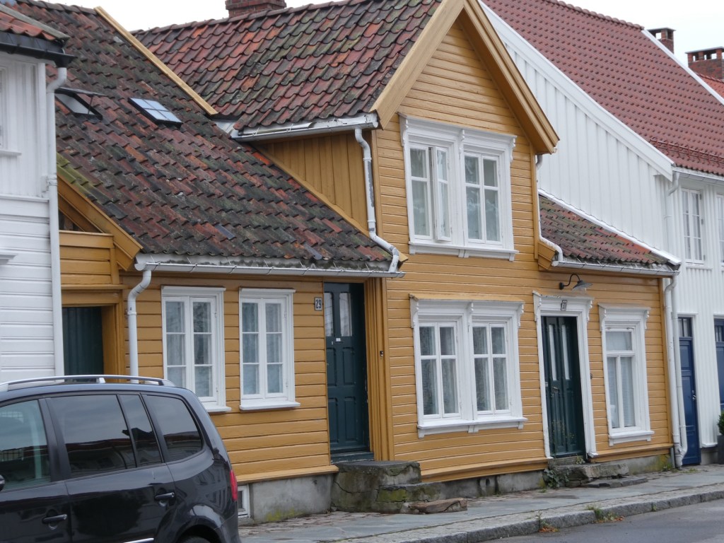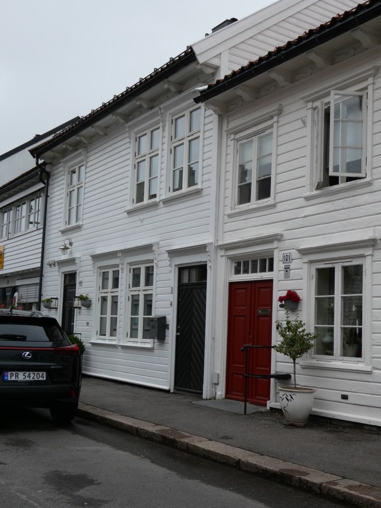 Poorer people lived in the old part (Posebyen) section with the wealthy nearer to the water. Apparently the insides of these buildings are modern even if they are old on exterior. All harbours in Norway are ice free. Homes built on the west coast have horizontal planking and those on the east coast are vertical. It has to do with the climate and rain. White paint shows more wealth. Sign on outside says wet paint and thing on left of is m so fire department can get in if a fire without you not necessarily being home. We have that at home but only on apartment/condo buildings.