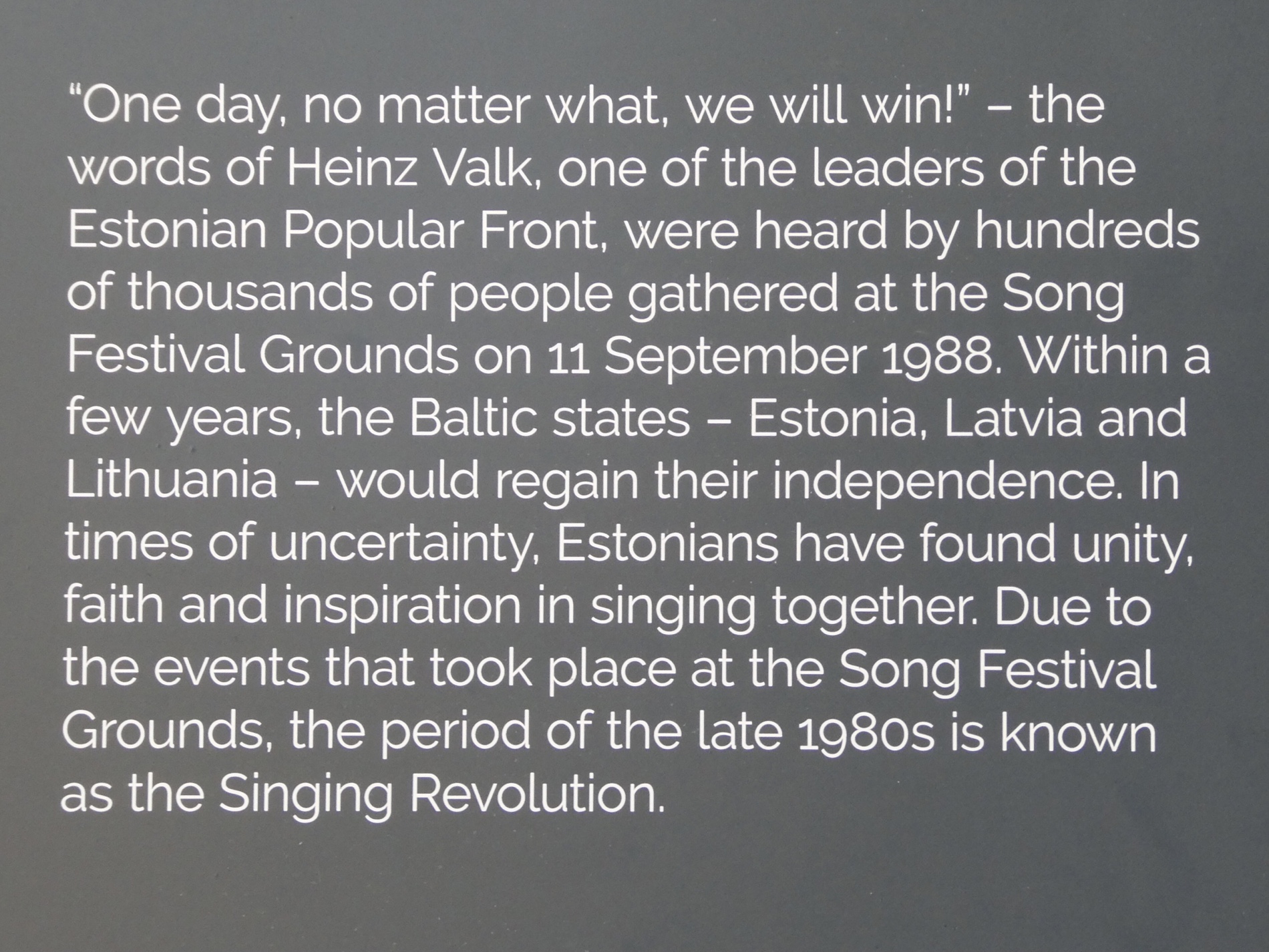 34,000 sang together … love songs. There was a reawakening in mid 1990s at culture song festival centre. 1988 Gorbachev made it easier. With the 1991 coupe in Russia, Estonia also said they wanted out.