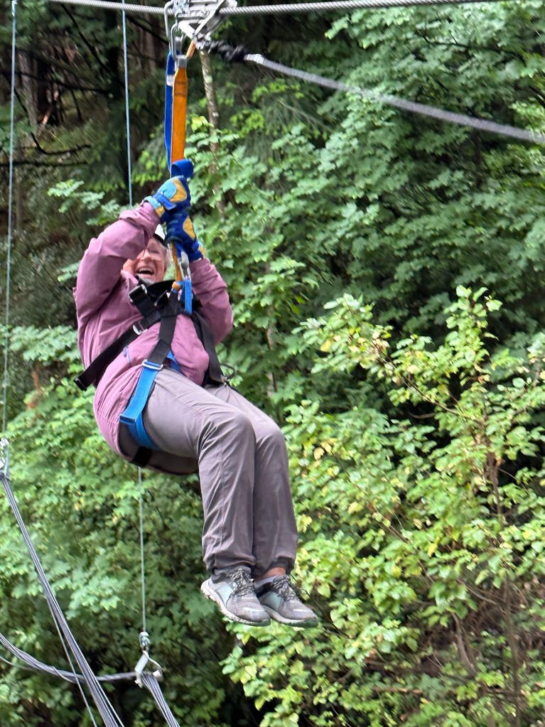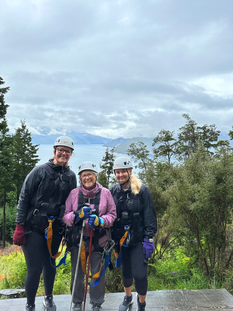So many other activities cancelled but Brianna, Jess and I went up on the gondola but couldn’t see a thing up top….. it was socked in. Then the three of us went on Ziptrek, the steepest zip line in the world. It descend 30 storeys at speeds of up to 70kmh …. comprised of six lines.