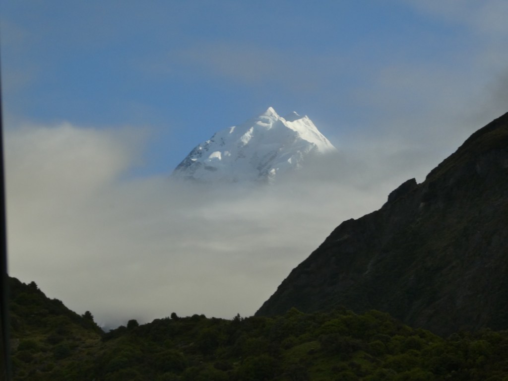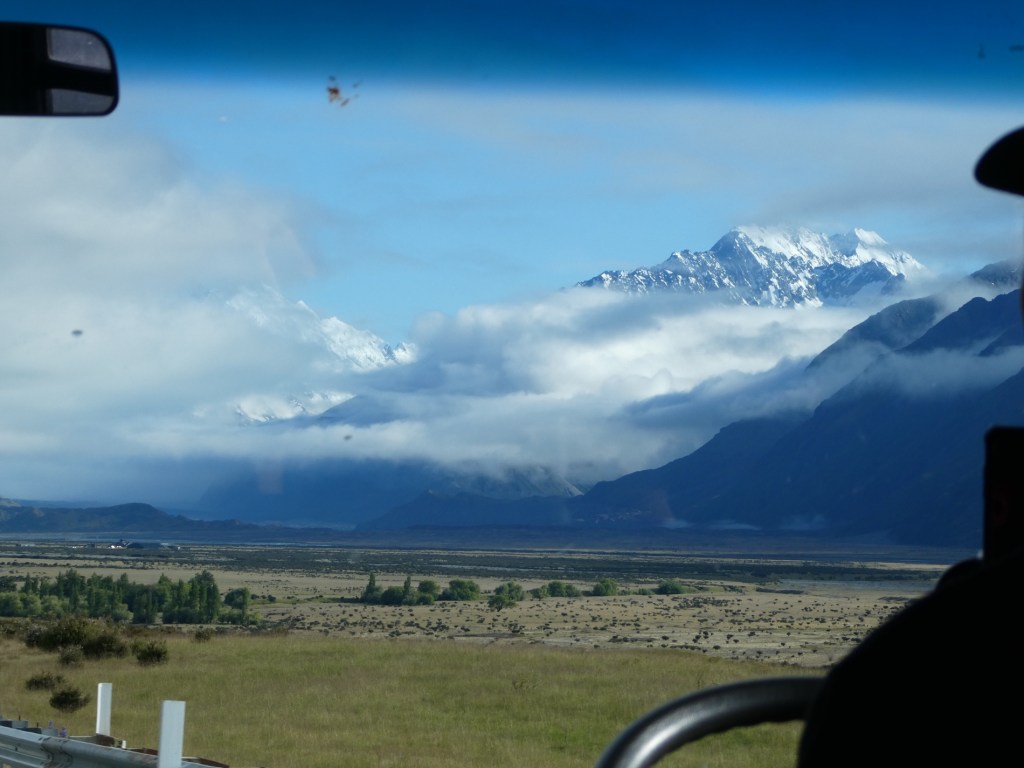 As I previously mentioned, we hopefully changed our plans so that we are able to see Mt Cook and Lake Tekapo. We are heading that way but it does not look good. But then ….. it cleared. We could see Aoraki/Mt. Cook in the distance.
