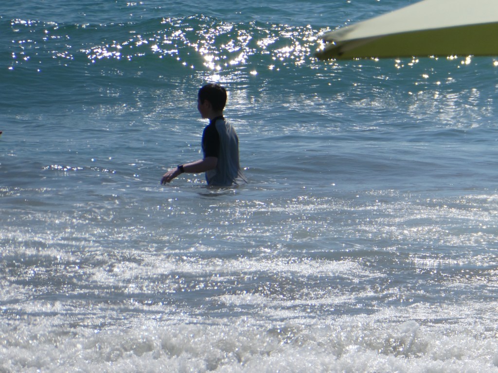 After arriving at this lovely little hotel…. (actually the same one we had stayed at 4 years ago), we all travelled by local bus to a public beach near Manuel Antonio Park. The roads are incredible going up and over the hills… so steep and narrow and windy although I never felt that we could fall off a cliff like some other places I’ve been. Anyway, rented lounge chairs for $5 US each…. Under a canopy. Thank God. The heat was so, so very hot, a person could get third degree burns from walking on the sand so you run like hell from one shaded spot to another. The beach was gorgeous. Jax loved playing in the surf… actually trying out boogie boarding.
