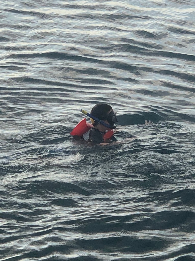 And then we went on a humongous catamaran. Jaxon went down the slide and went snorkelling with a lady from the group. She is a stronger swimmer than me while I watched. (My shoulder is not feeling very good). We had fruit snacks, dinner and drinks included. We stayed out long enough to watch the sun go down…. Beautiful!!!