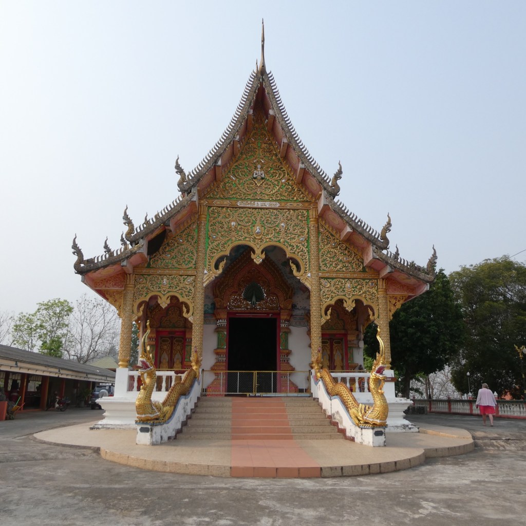 First stop is Wat Phra That Jomjang…..a temple that is 400 years old built in style of lanna… different than we have seem. It is the northern Thailand style. Many in the area are in style of Myanmar because close proximity to the border and consequently influence. I asked about the different style of Buddhas particularly most here are slim but occasionally we see a fat one. The fat one is Chinese style. It’s called “Happy Buddha” for happy, healthy & wealthy.