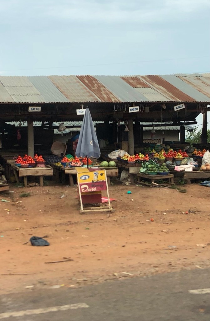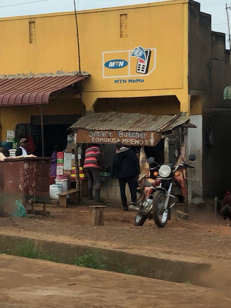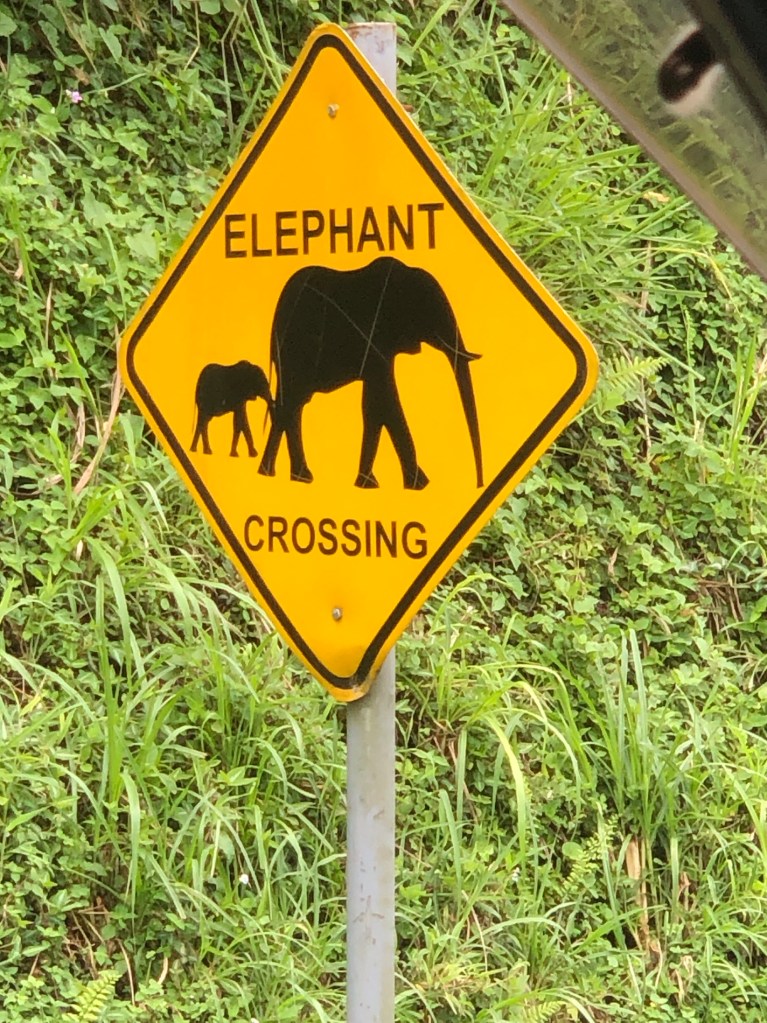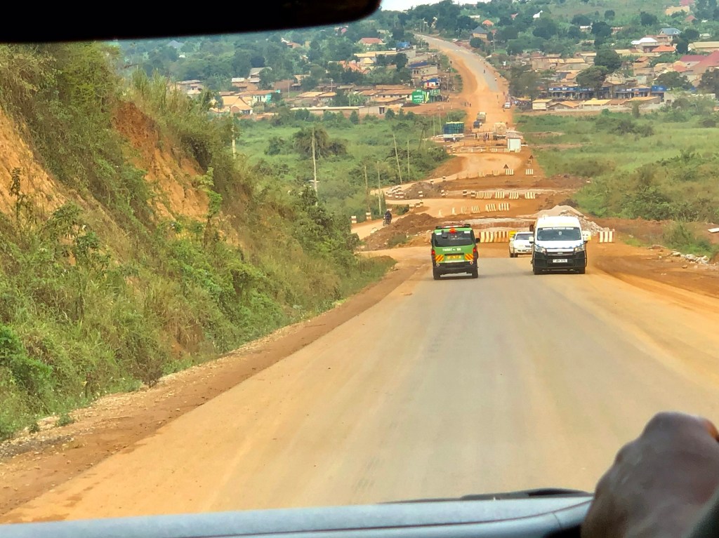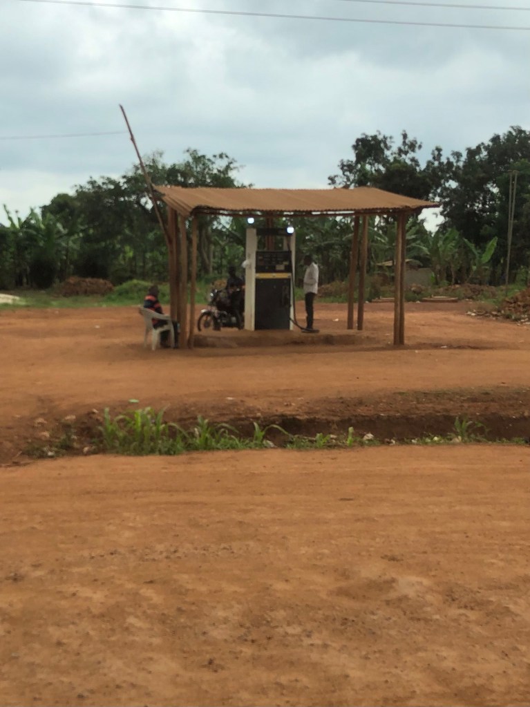 Hordes of peopleWoodworking shop?A nurseryMatok bananasStone tilesBed framesMetal doorsHanging meat….no refrigeration but only there for theMarching band followed by teachers and all the studentsFresh veggiesRoad construction…bridge buildingGas stationJust a bit of rain!This truck had an issue…. Parts all over the road.Chickens for saleKing of Tooro Kingdom. Father died when he was 3…but became king at 18Chimpanzee crossingSelf explanatory Tea plantationHuge…..Staghorn ferns One of the two (see below) armed guys looking after the parking lot of this restaurant