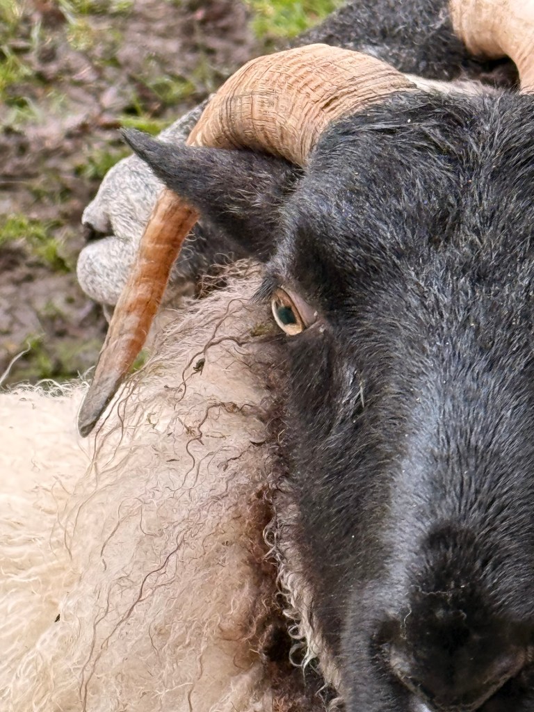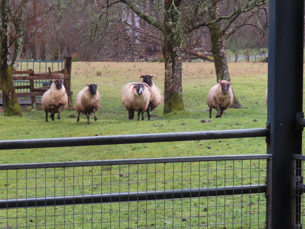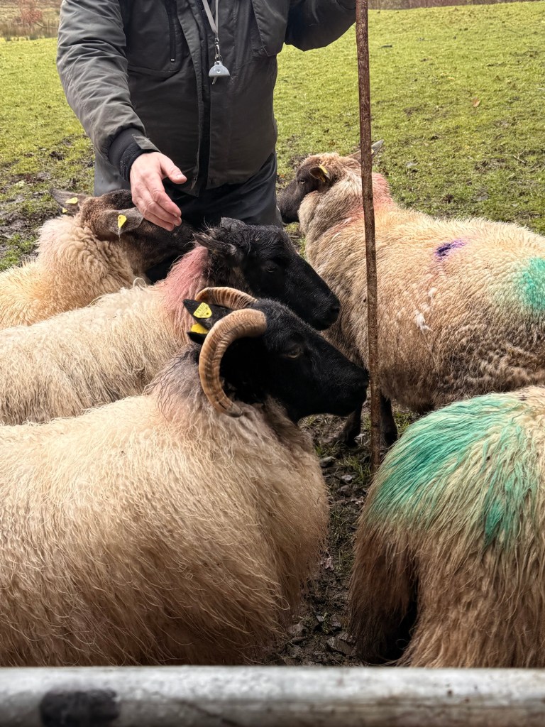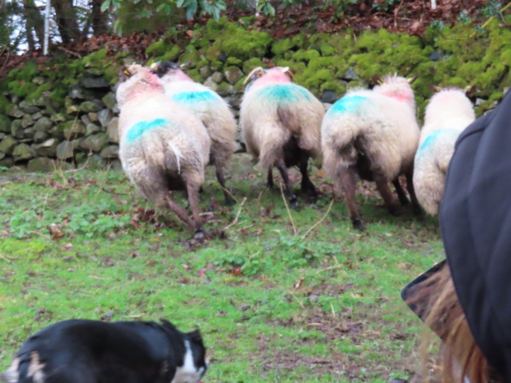 In October the males breed. In winter they are brought in to check how many babies each ewe is carrying…. Colour of paint on the sides determine the number each sheep is bearing.