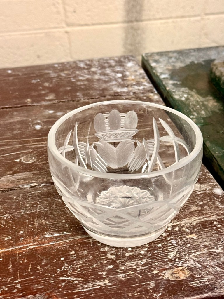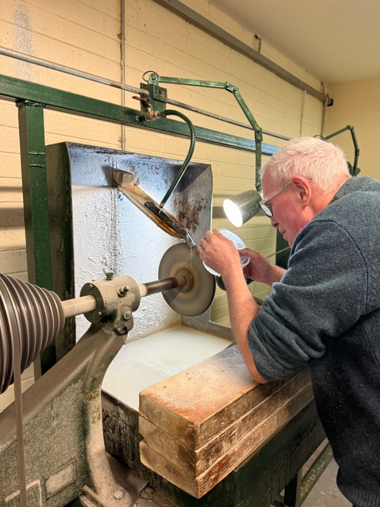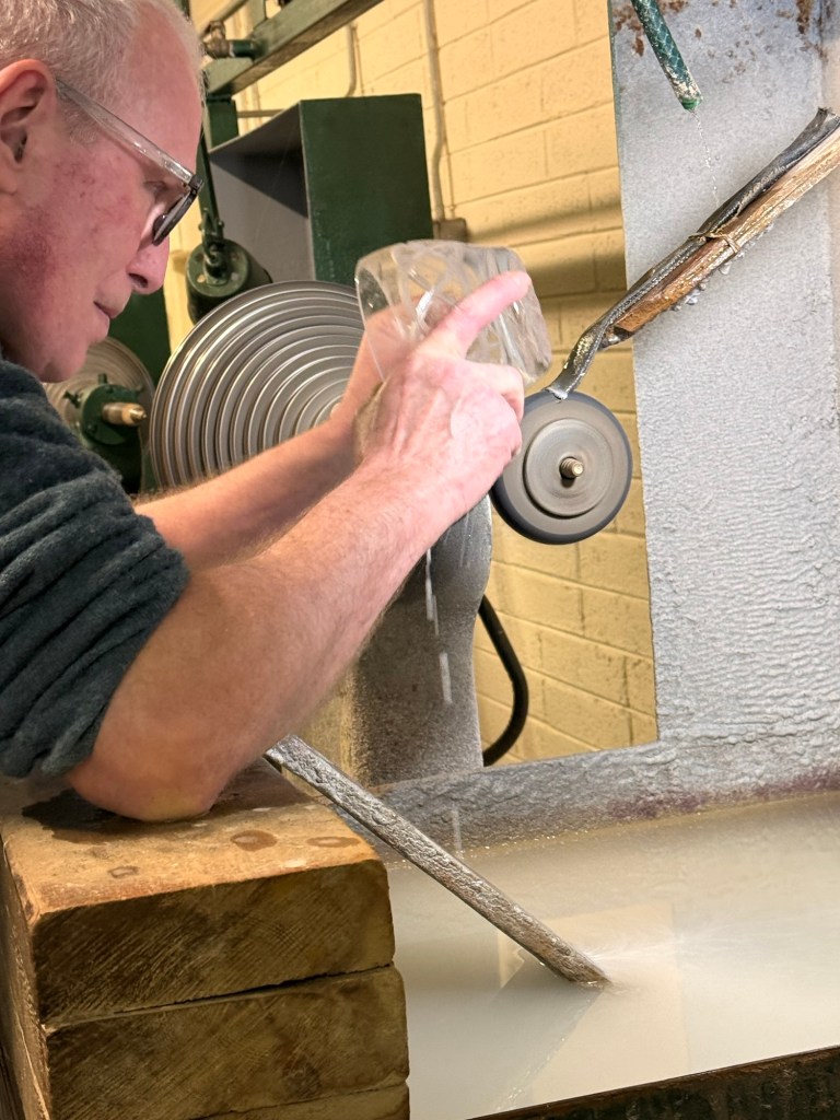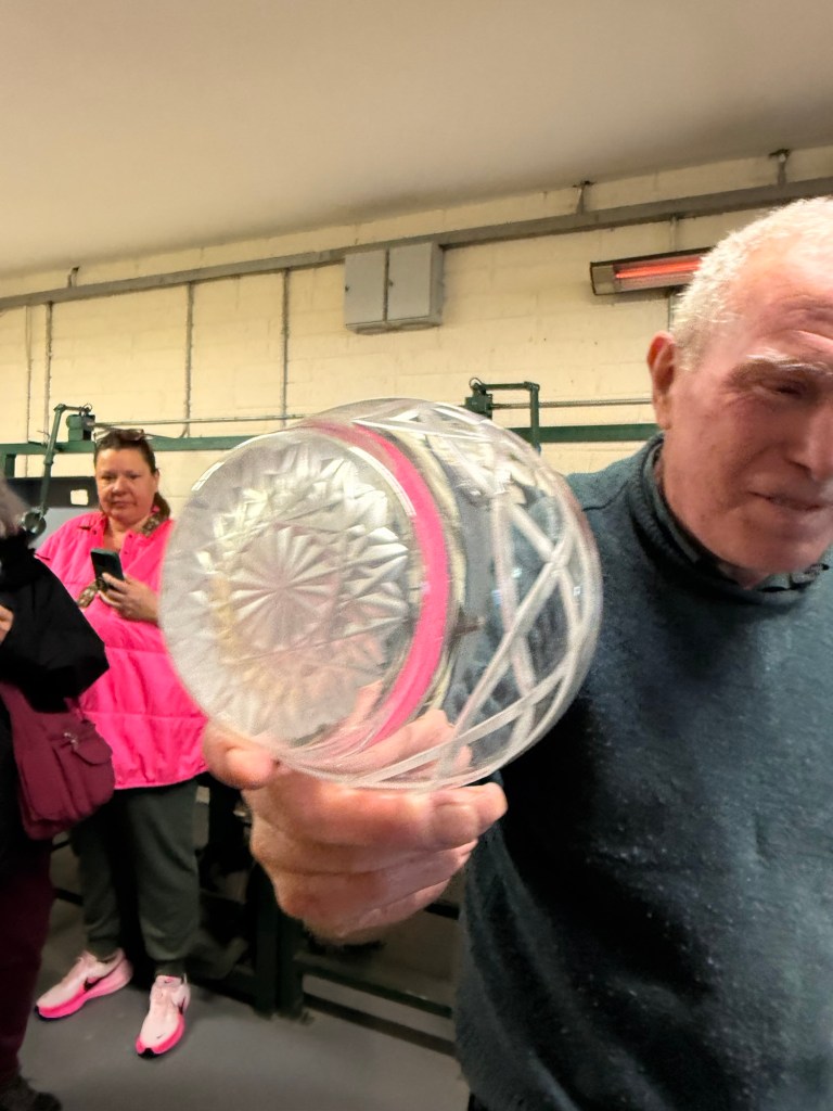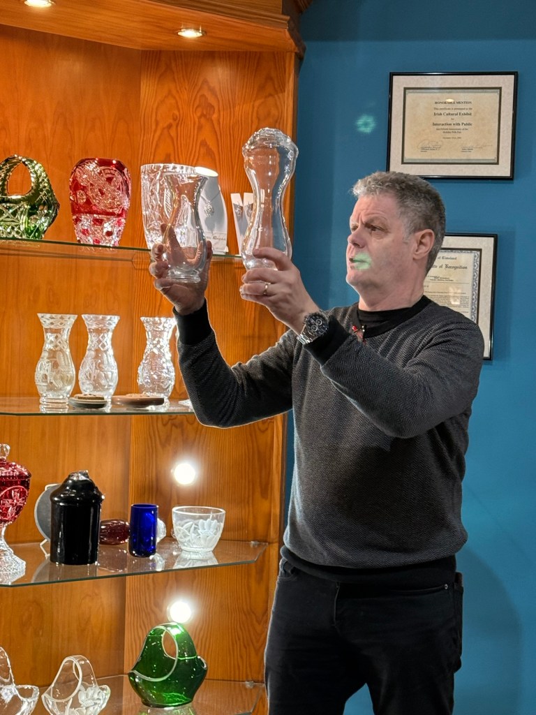 We stop by the Connemara Celtic Crystal….. the only “real” crystal crystal place left in Ireland. To be hired here, after gotten a degree in arts or graphics…each one serves an apprenticeship of 5+ 3 years.   Each tradesperson does 3 design requirements, not just one. They use only sandstone, no diamond grinders. They do 2 coats of glass for each. The 2nd is when colour is added.