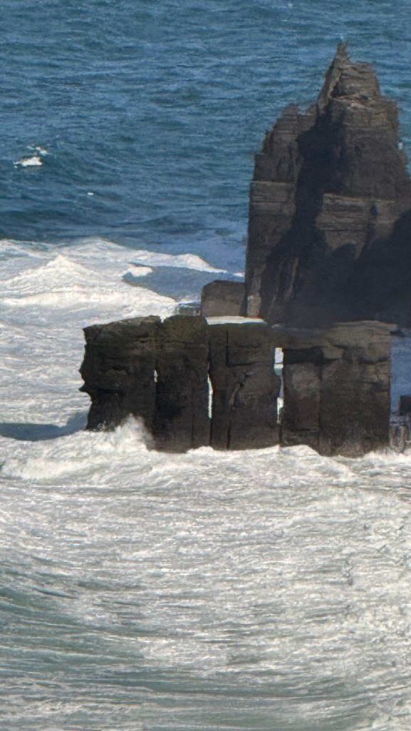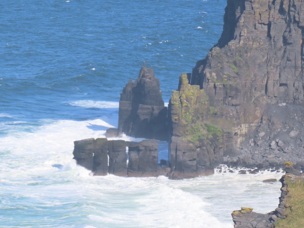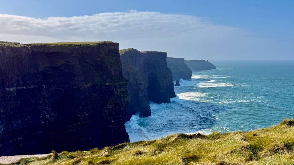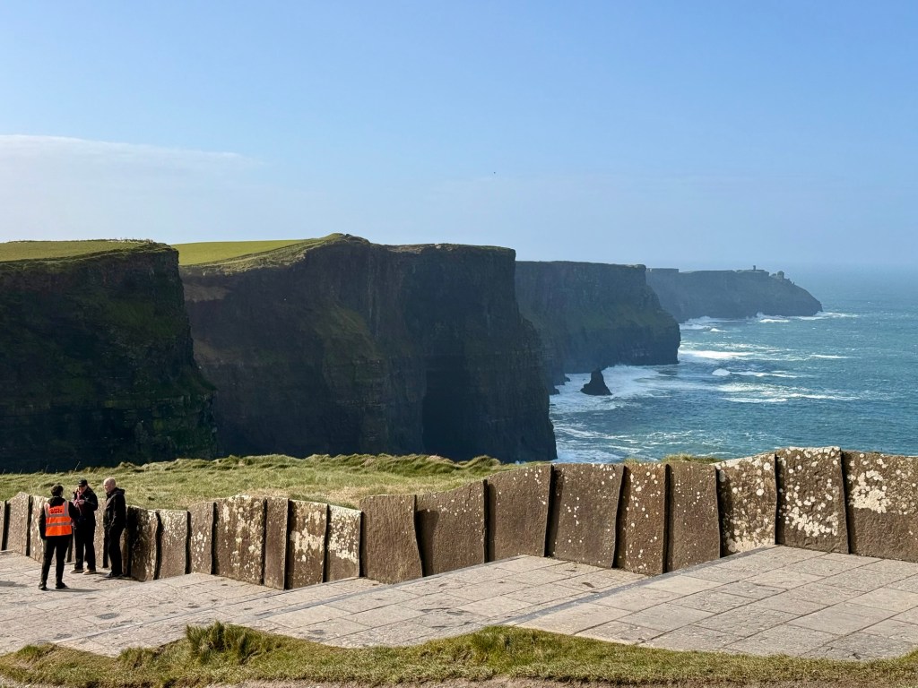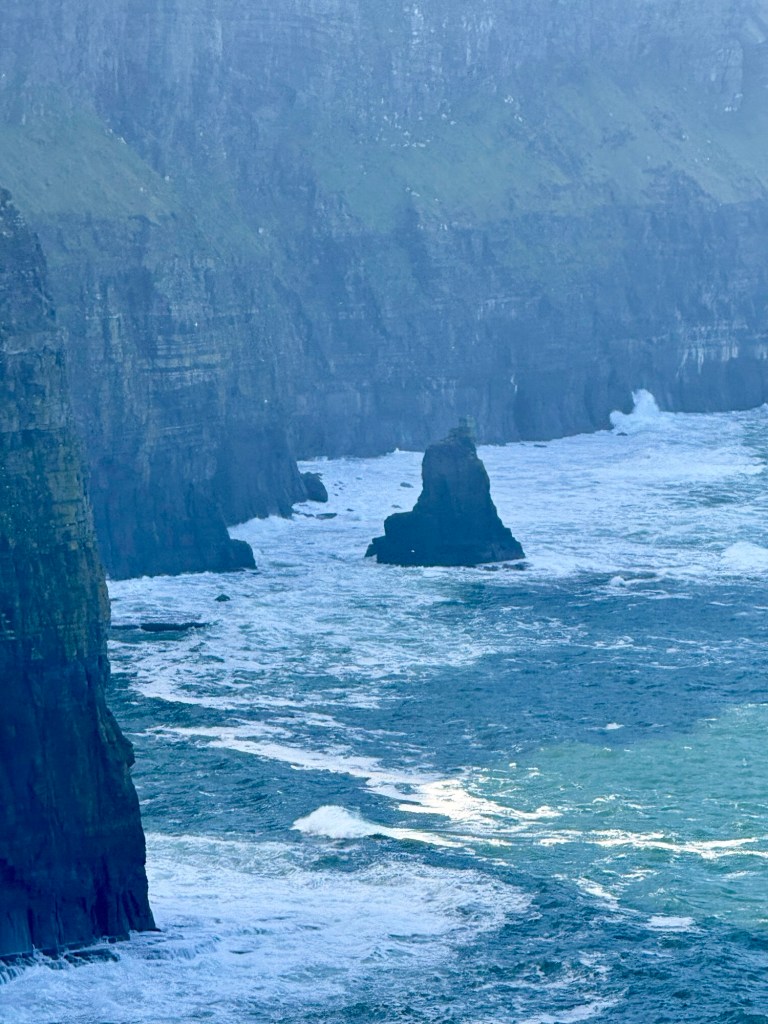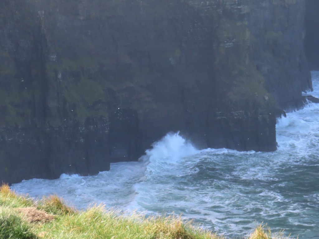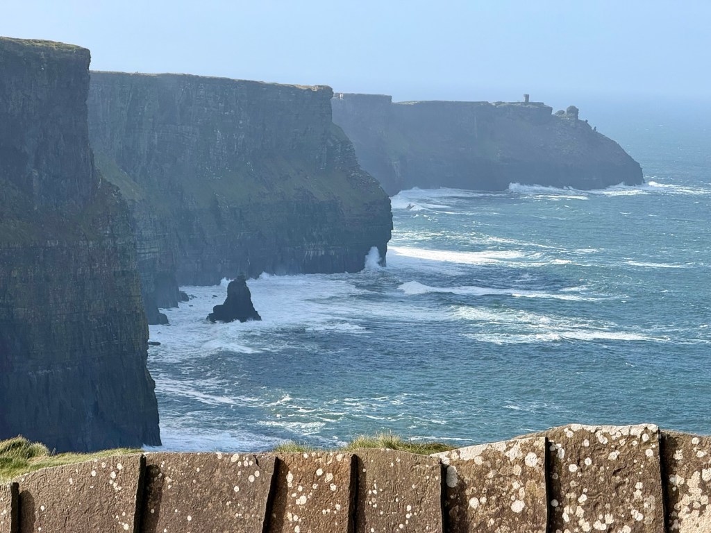 Cliffs of Moher go for more than 8 miles…. almost 13 kms. The Cliffs of Moher are sea cliffs at the southwestern edge of the Burren region in County Clare, Ireland. At their southern end, they rise 120 metres above the Atlantic Ocean at Hag’s Head. Absolutely spectacular. It was so windy that tiny droplets from the waves, pelted us in the face at the top….. wow!