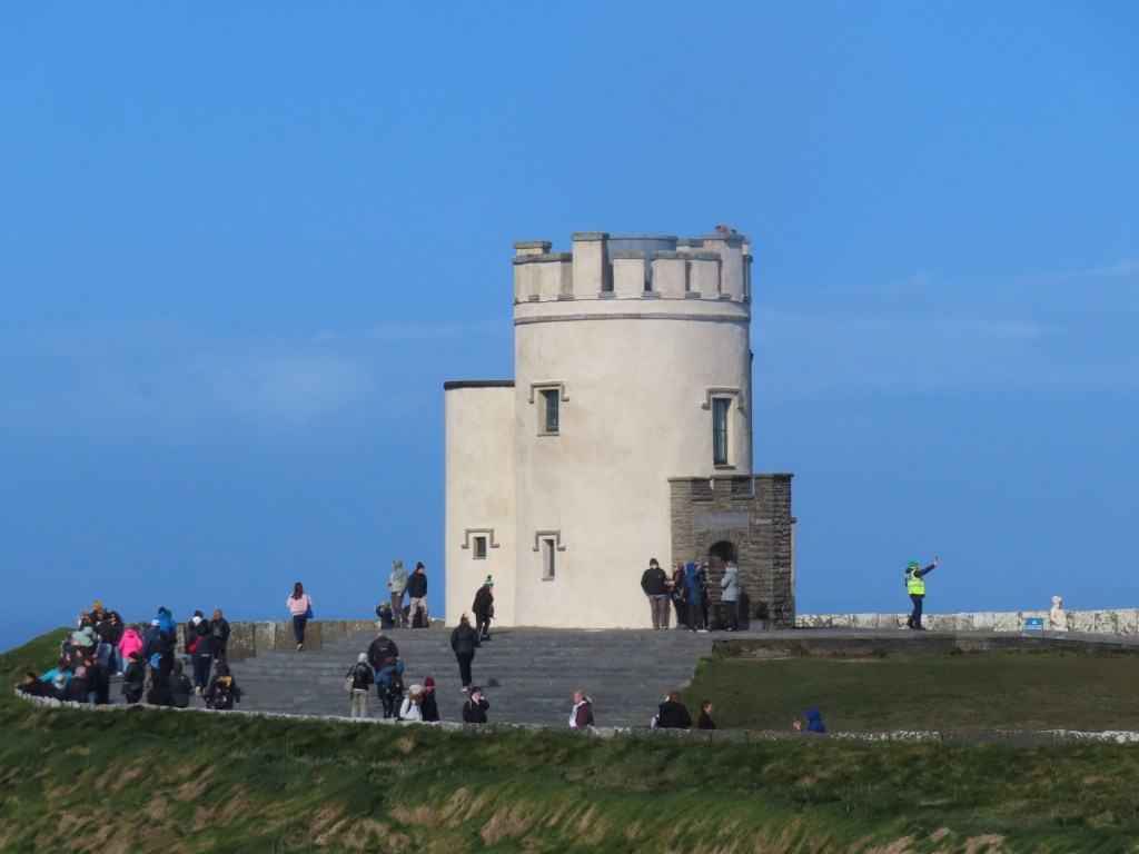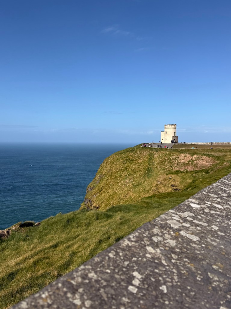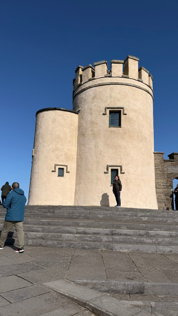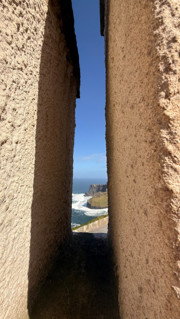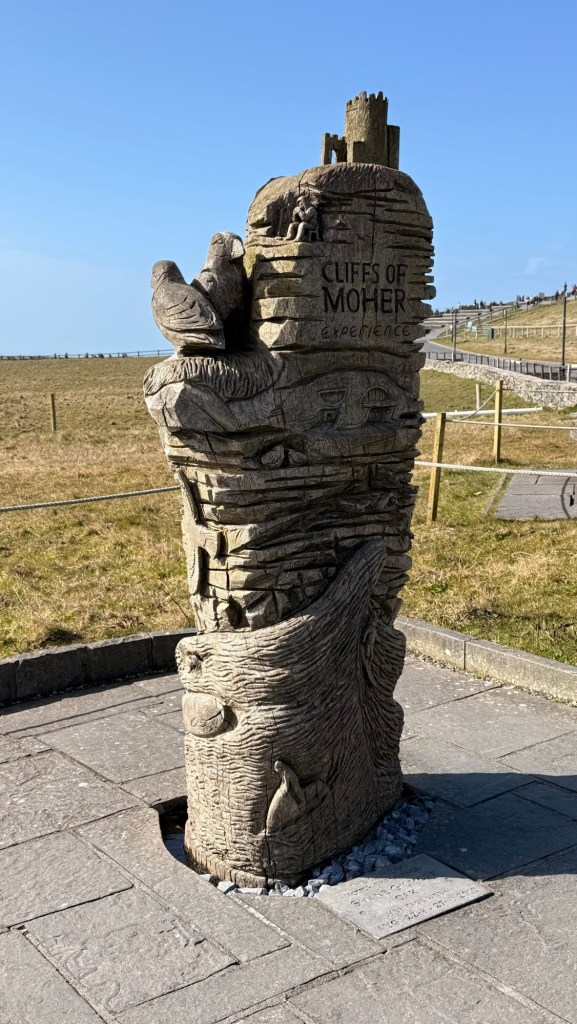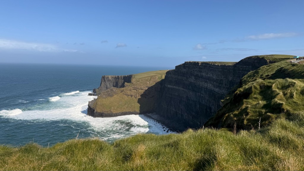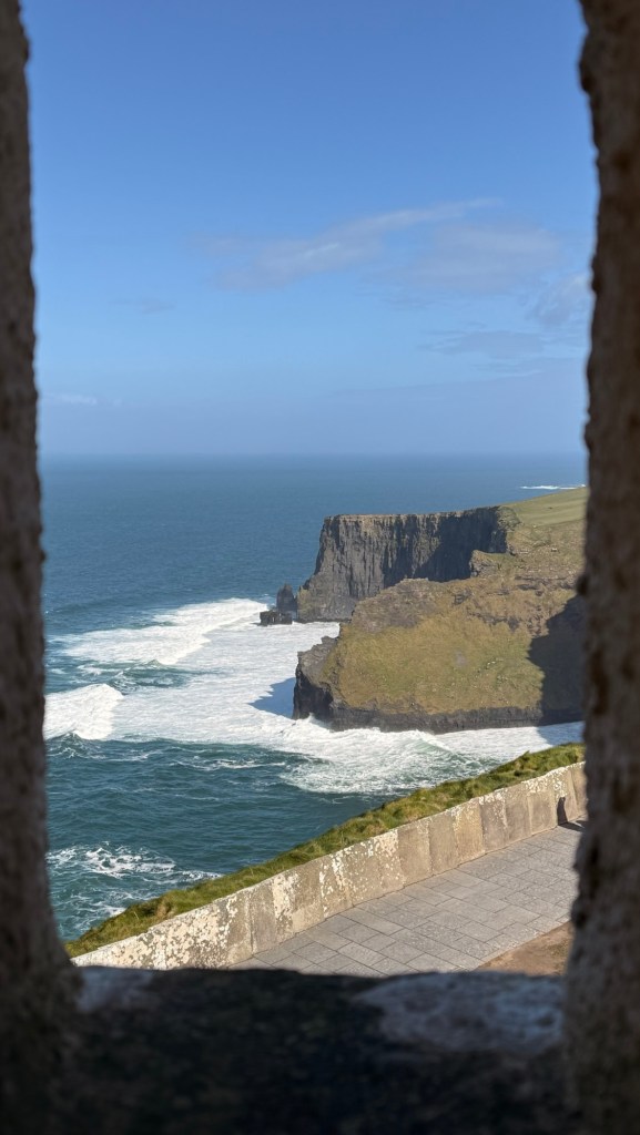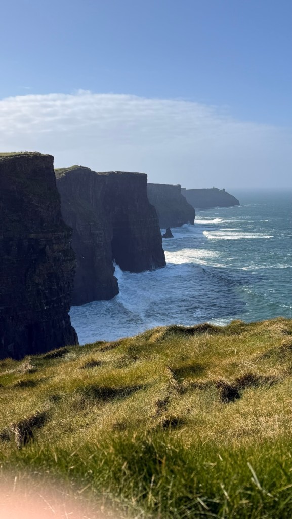 Cliffs of Moher go for more than 8 miles…. almost 13 kms. The Cliffs of Moher are sea cliffs at the southwestern edge of the Burren region in County Clare, Ireland. At their southern end, they rise 120 metres above the Atlantic Ocean at Hag’s Head. Absolutely spectacular. It was so windy that tiny droplets from the waves, pelted us in the face at the top….. wow!