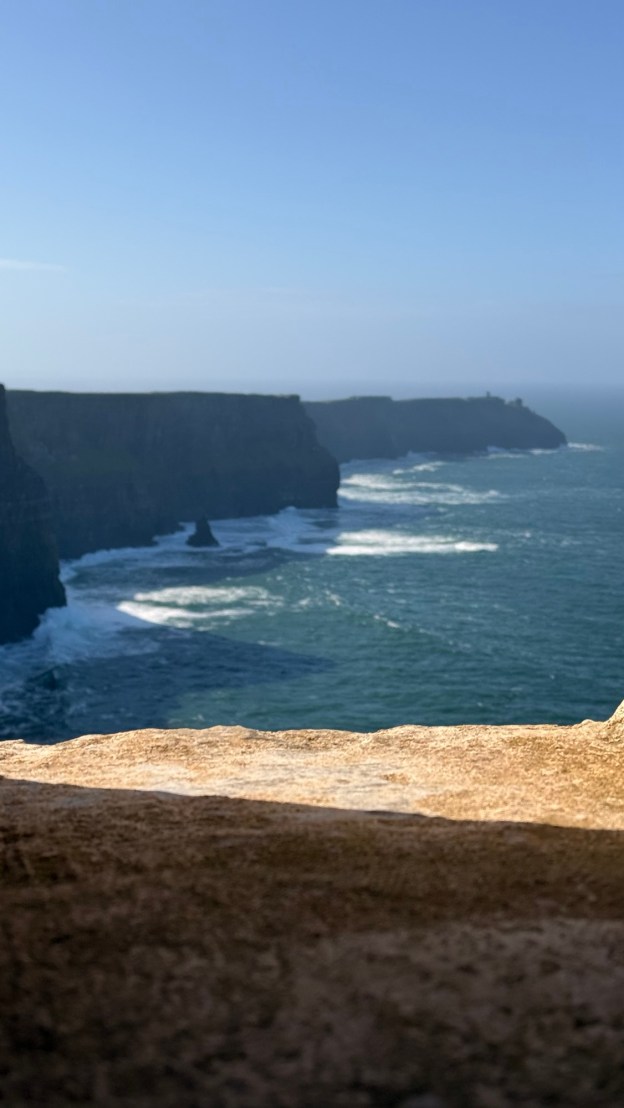 Cliffs of Moher go for more than 8 miles…. almost 13 kms. The Cliffs of Moher are sea cliffs at the southwestern edge of the Burren region in County Clare, Ireland. At their southern end, they rise 120 metres above the Atlantic Ocean at Hag’s Head. Absolutely spectacular. It was so windy that tiny droplets from the waves, pelted us in the face at the top….. wow!