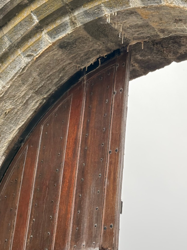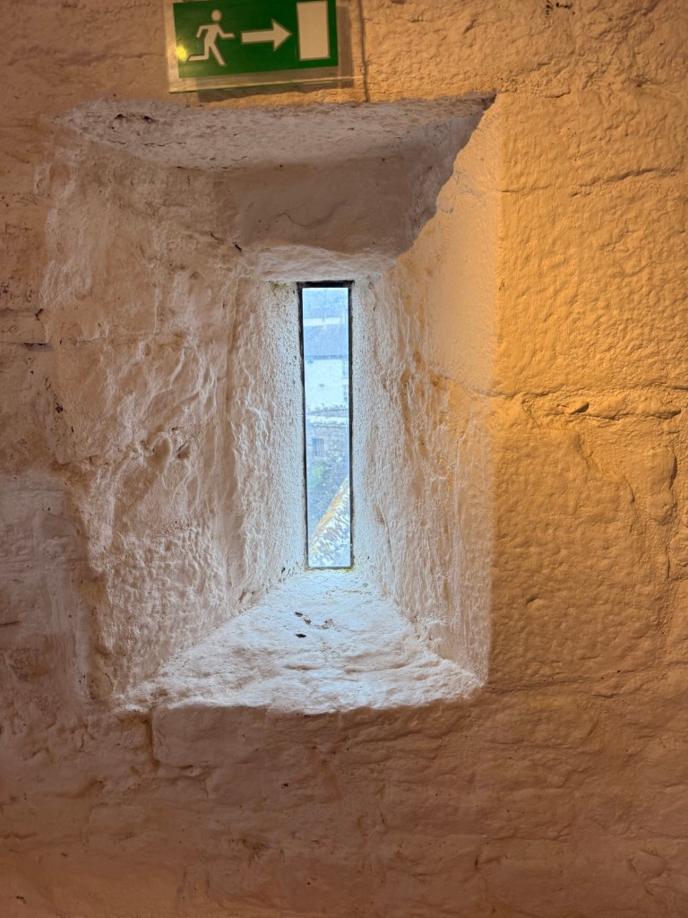 Holes in wall were where the beams were used for the living space above and the floor for the animals below (which helped to keep the people warm). At one spot pointed out to us, that there was the Michicolation— murder hole…. Where if the invaders made it through the rest of the defences, had boiling fat poured over them to slow them down. Ouch!!!