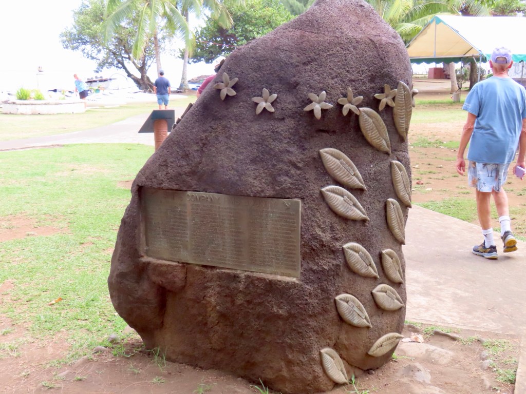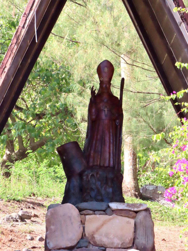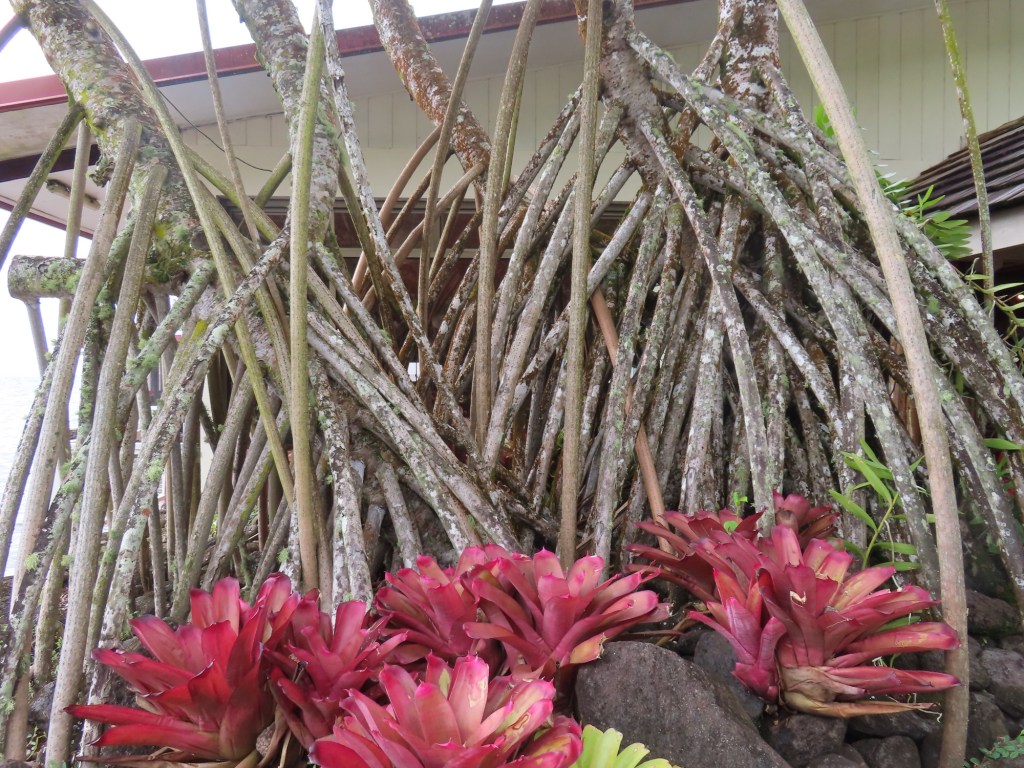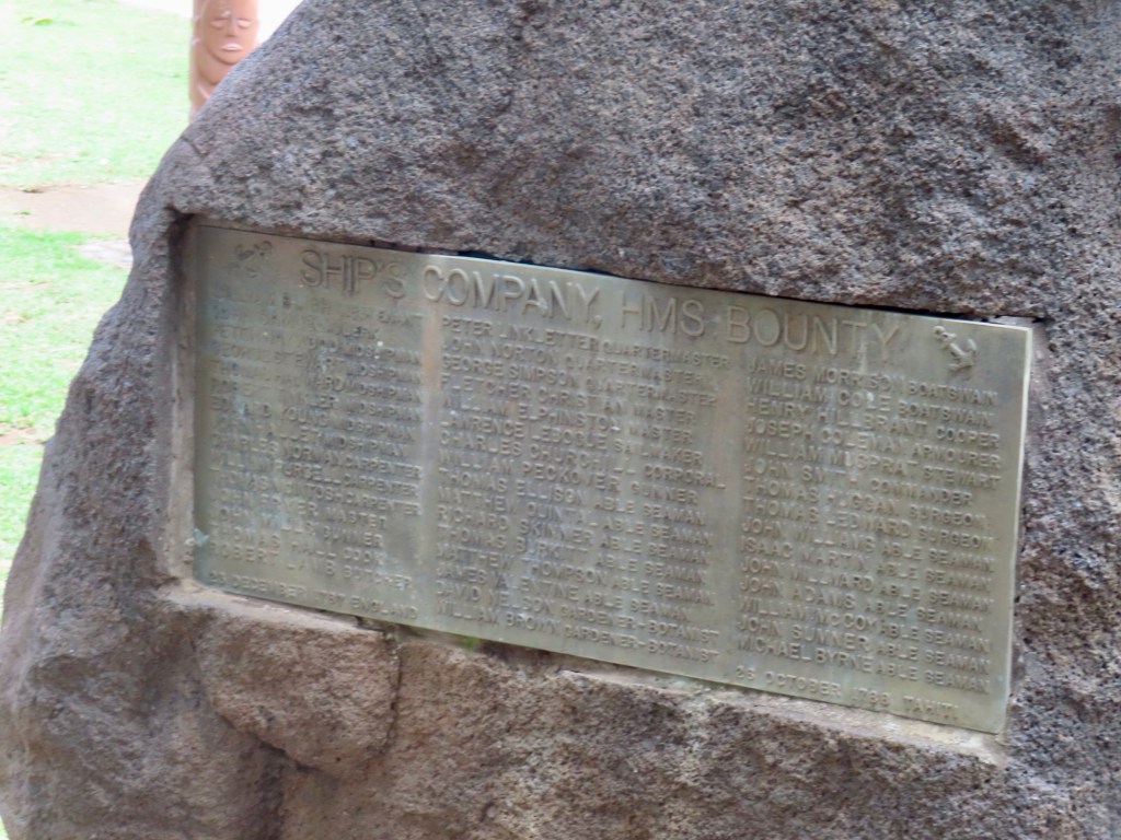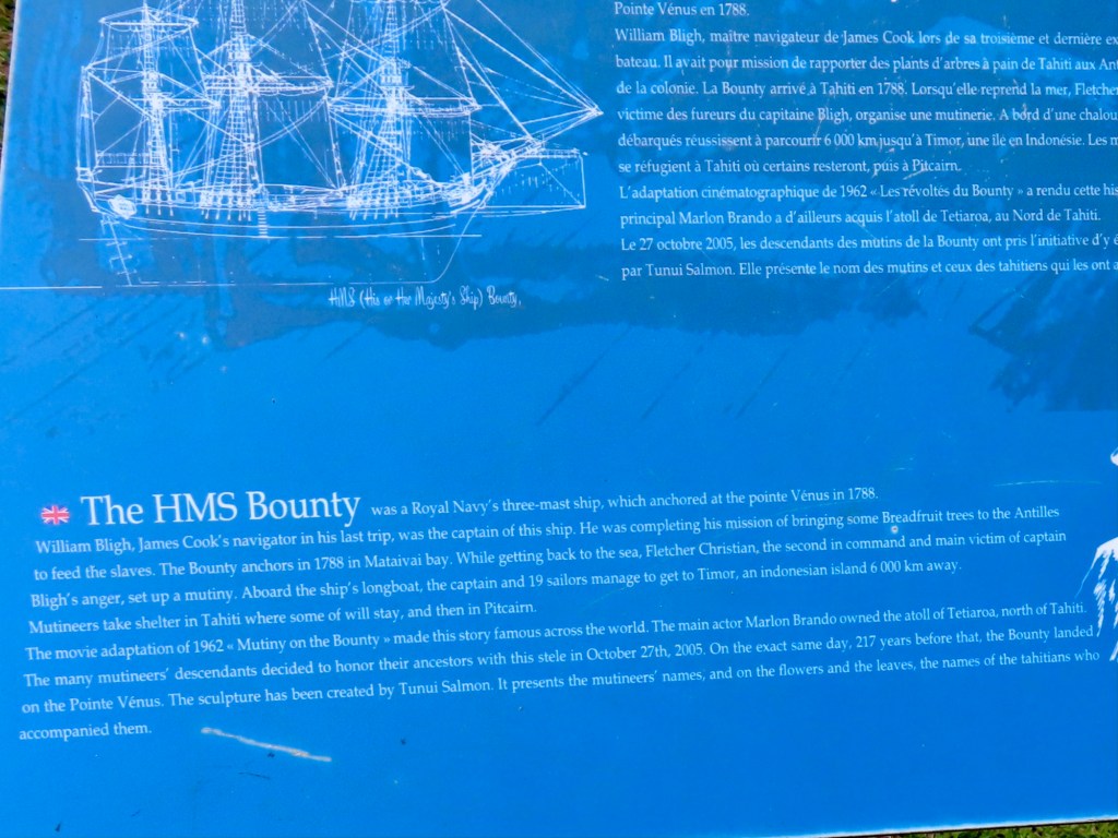 At Point Guinness (?)…in 1768, Bougainville anchored on the reef but lost 6 in 9 days. When he left he took a local man Ahuturo to France….the first Tahitian to travel the world. Ahuturo died in 1771 in Madagascar, from smallpox.  Anchor and plaque at side of road near bridge at Hitiaa