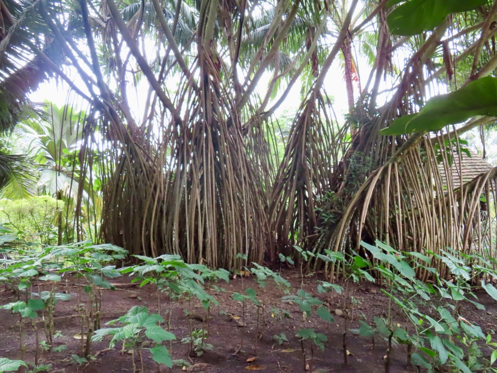 Each tree produces 60-80 coconuts per year. They are used mostly to make coconut oil.  Metal ring around the trunks are to prevent the rats (besides crabs that we heard about before) from climbing the trees and getting the fragile baby coconuts.