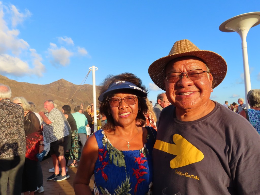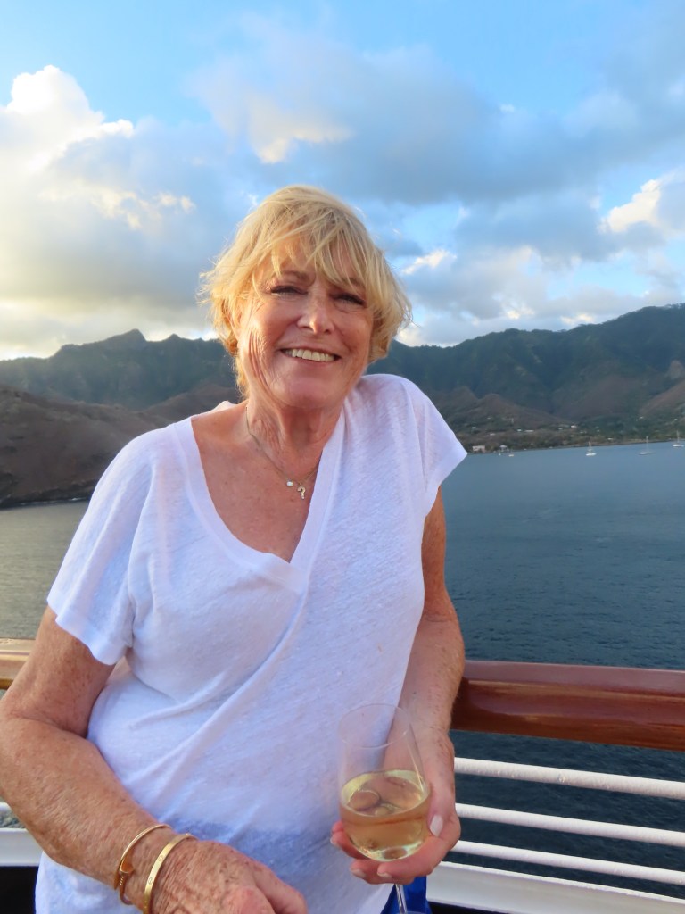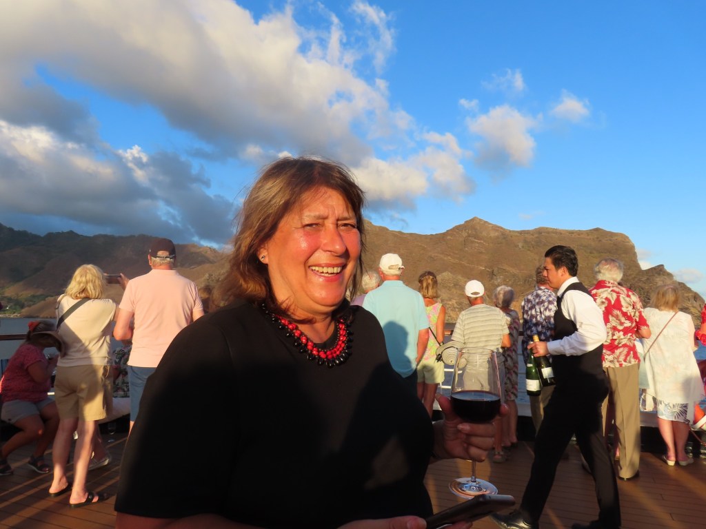 The last days at sea since we left Nuku Hiva, although it hasn’t exactly been stormy, has been quite difficult to walk.  I am not going to even try to dance today. It is probably worse today than any other day. The captain just told us that the seas are 3.5-4 metres and are low ones making it the worst. Thank God I don’t get sea sick.  They have left out in the elevator areas, “barf bags”.  There seems to be less today than originally were.  They have not taken off the netting in the pools, I guess because it is too dangerous.  I keep trying to take videos of the waves sloshing but never seem to get the good ones….timing is everything.  It seems to be an endless job on the pool decks, to squeegee the water off.  Anyway I am quite ready to be home although not exactly ready for the colder temperatures.  Presently it is 17C with force 4 winds from the north making it quite cool….quite a drop but not as cold as home. We are still 285 nautical miles SW of San Diego travelling at 15 knots….slower than we had been for a lot of of the last few days.