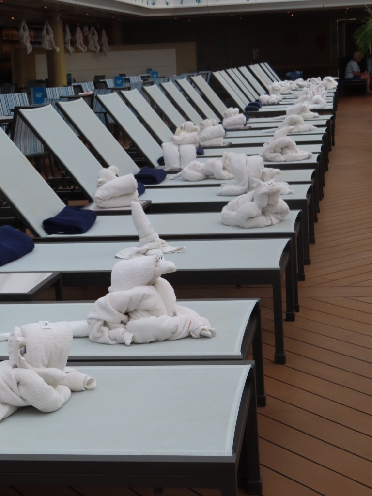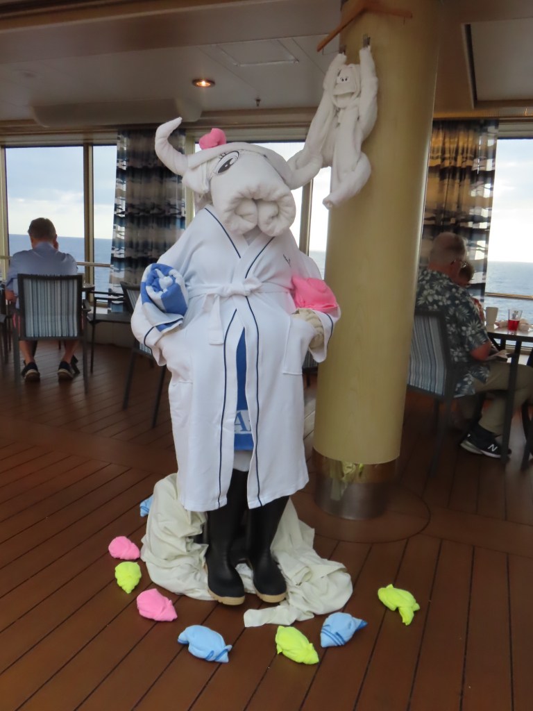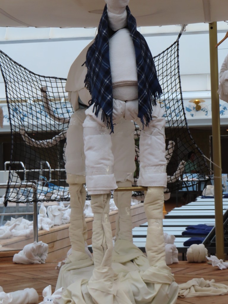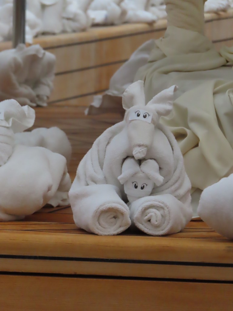 The ships crew have been trying to keep us all amused. Yesterday, everywhere we went (especially around the Lido pool, were towel animal…..absolutely mind blowing.