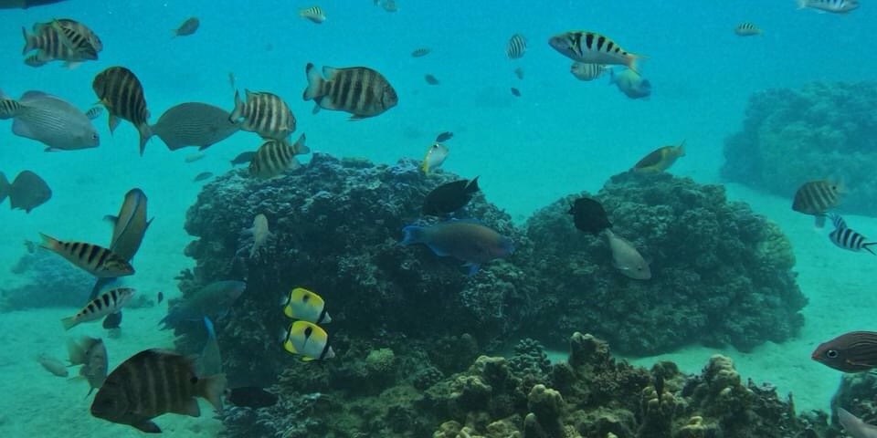 No reef on this side of island …waves come in from ocean…used to train for surfing.  Lots of black sand beaches.