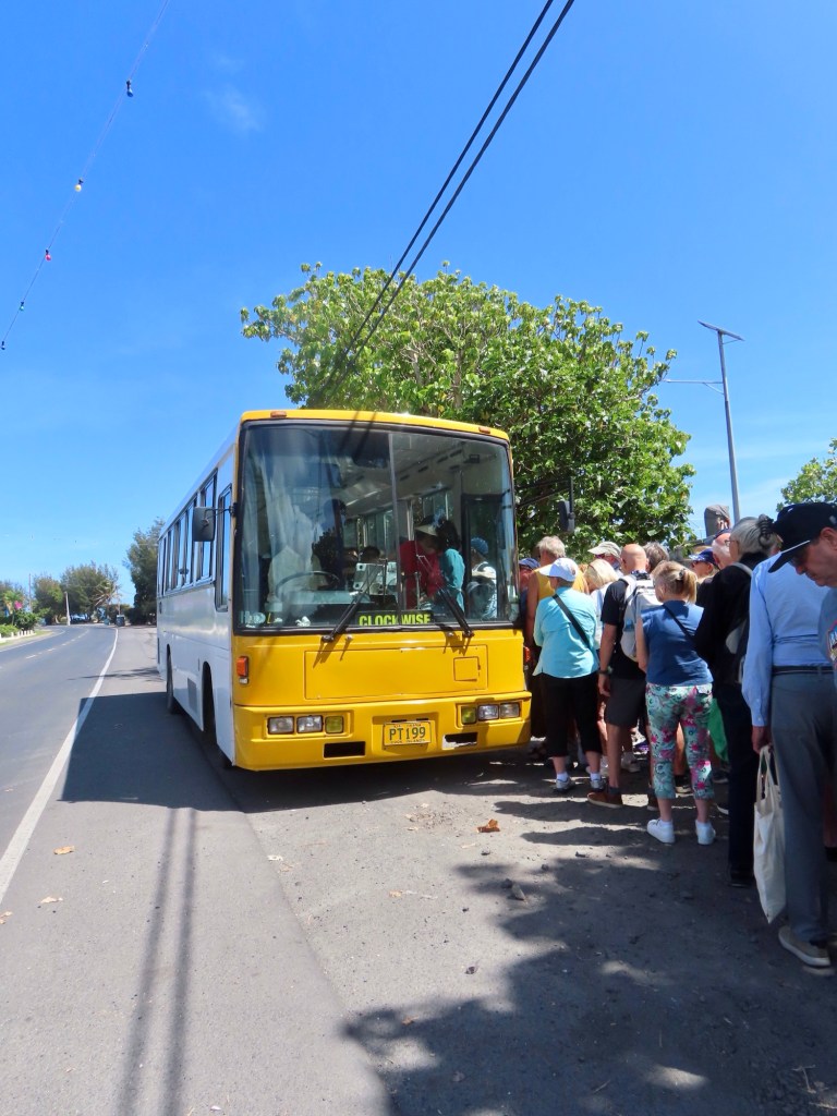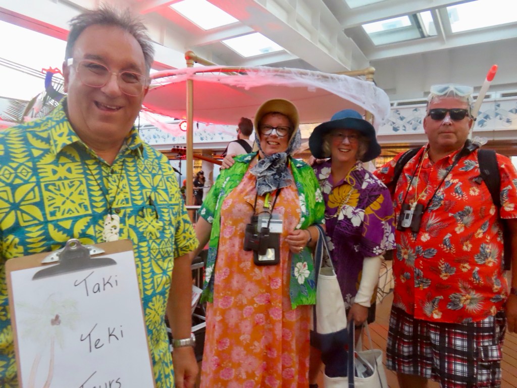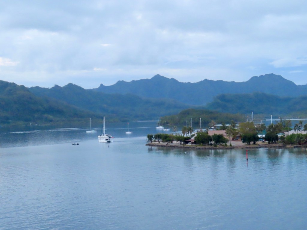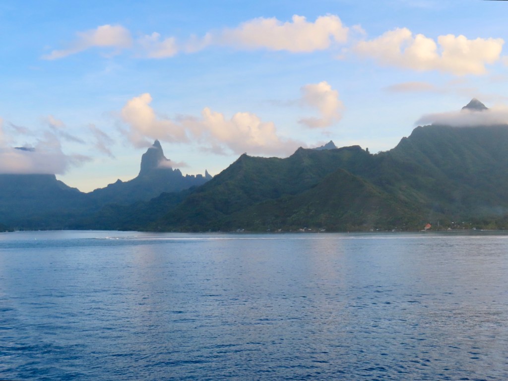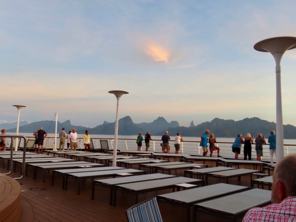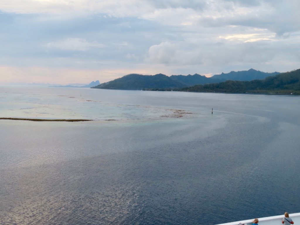Port talk the night before:-In port from7-4:30, bugs spray needed and sun protection. Partly cloudy, 15% chance of rain, 74% humidity and temperature around 28C. 17,000 population, drive on the right. It is tender port….15-20 minute ride in…in Opunohu Bay. There is a craft market, food stands at pier…..not much else. Too long walk to get anywhere. Public bus only 5/day, taxis are expensive. Scooters for rent nearby (Coco rider.com). Mo’orea is like Bora Bora but better. More hotels here than other Polynesian islands ….lots of beaches. Ring road…60 kms around. Timae Beach near airport on east side. Eco museum…aquarium, golf course in timae., zip line (3600 francs)..tiki park, hikes…3 Coconut Tree Pass, Mt Mou’aputa…extremely difficult , plus another….take 6-9 hours to complete, horseback riding.