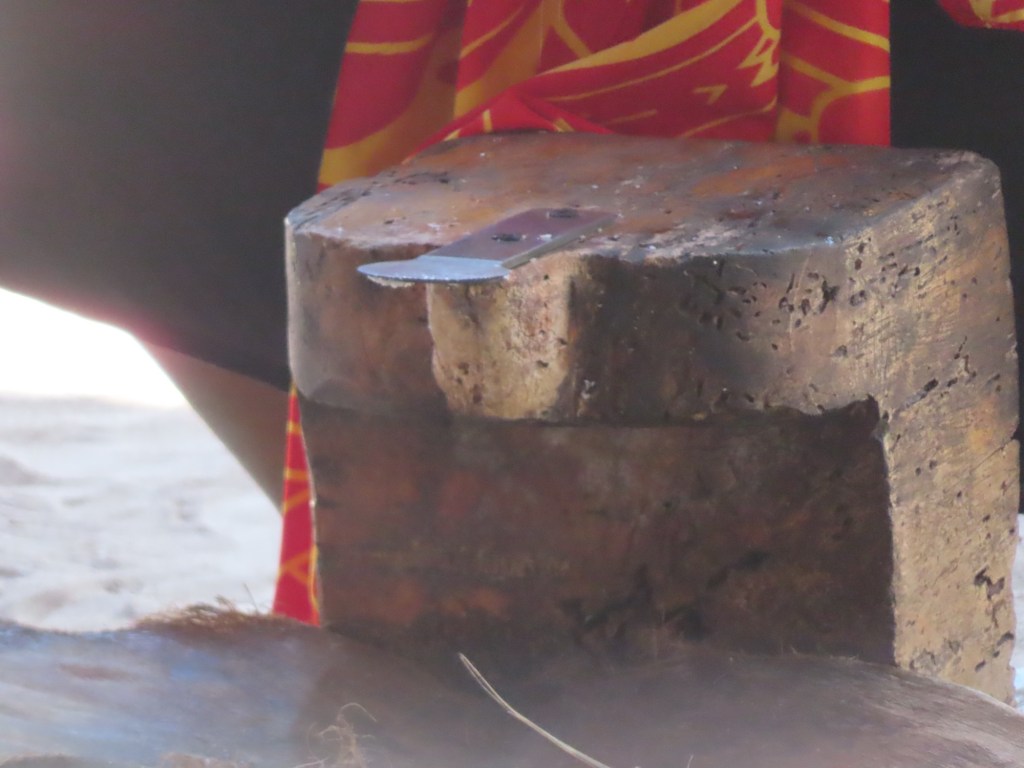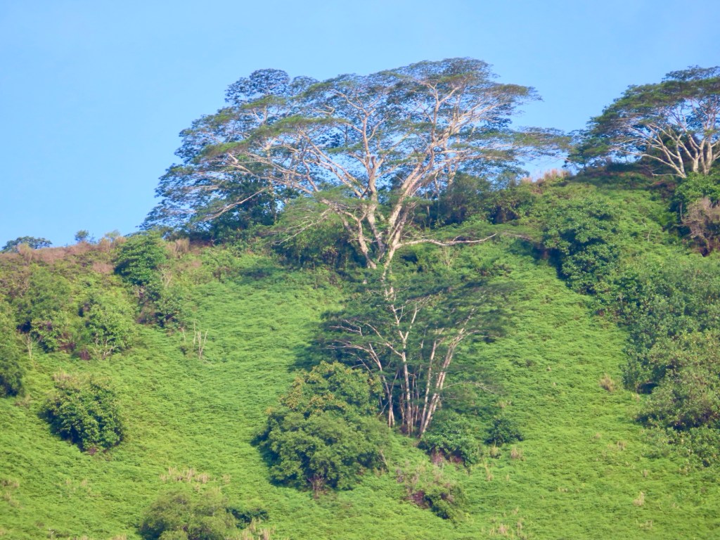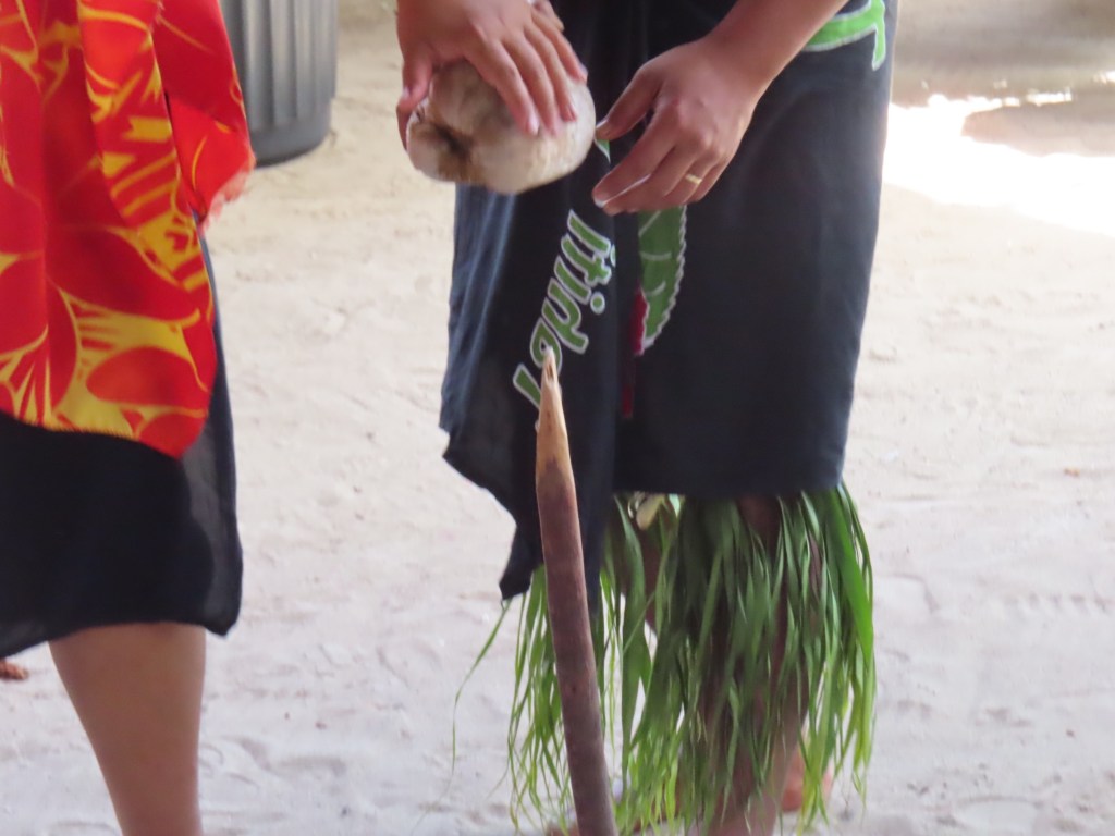 Aluminum bands on the coconut trees are to prevent red crab from climbing the tree to attack fragile young coconuts.