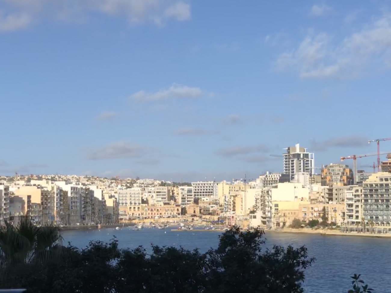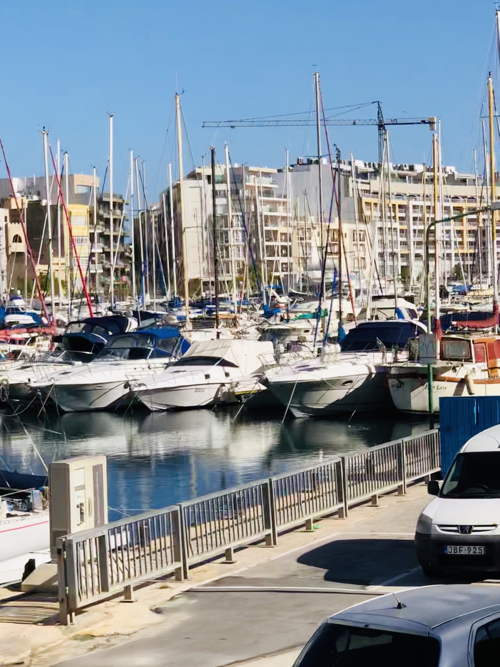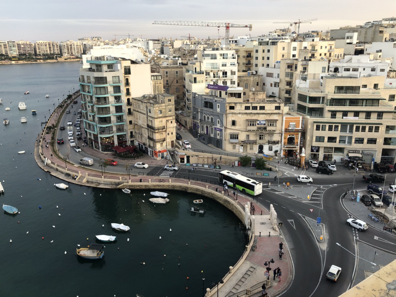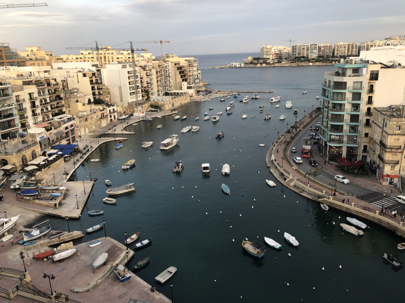 We got a taxi from the airport to our hotel …the Juliani Boutique Hotel on St. Julian’s Bay. Interesting thing….the taxi is not metered but you are charged a flat rate to the specific areas you are travelling to….and collected at the place of origin. Unfortunately the driver took us to the wrong hotel and we ended up walking and dragging our suitcases along the very narrow ( unlike Barcelona’s) to the correct one. The hotel was very lovely with a rooftop pool and deck that overlooks the bay…..nice! From the rooftop, Ron counted 30 hammerhead cranes…..amazing!