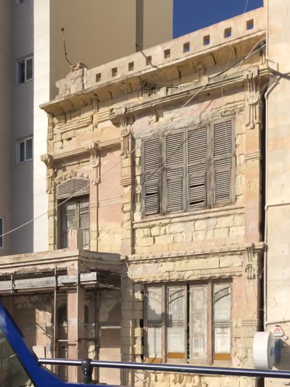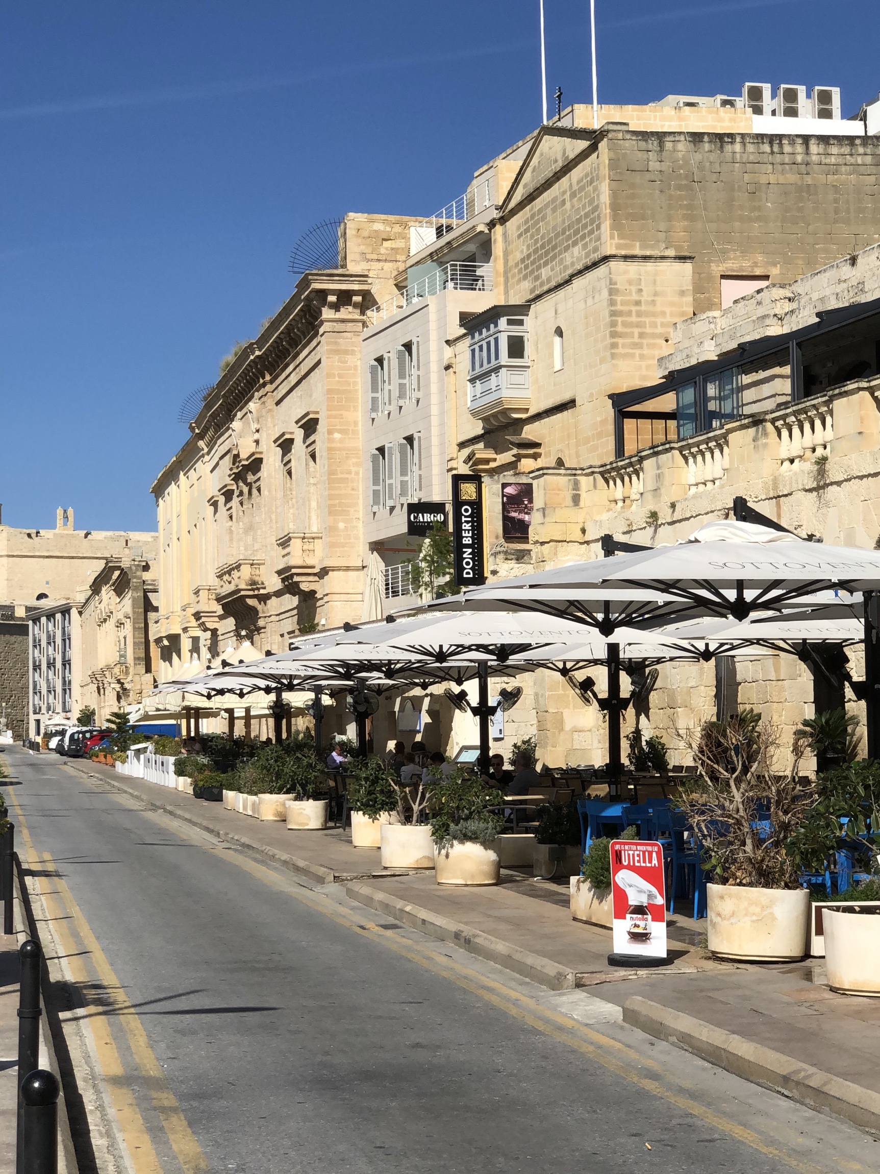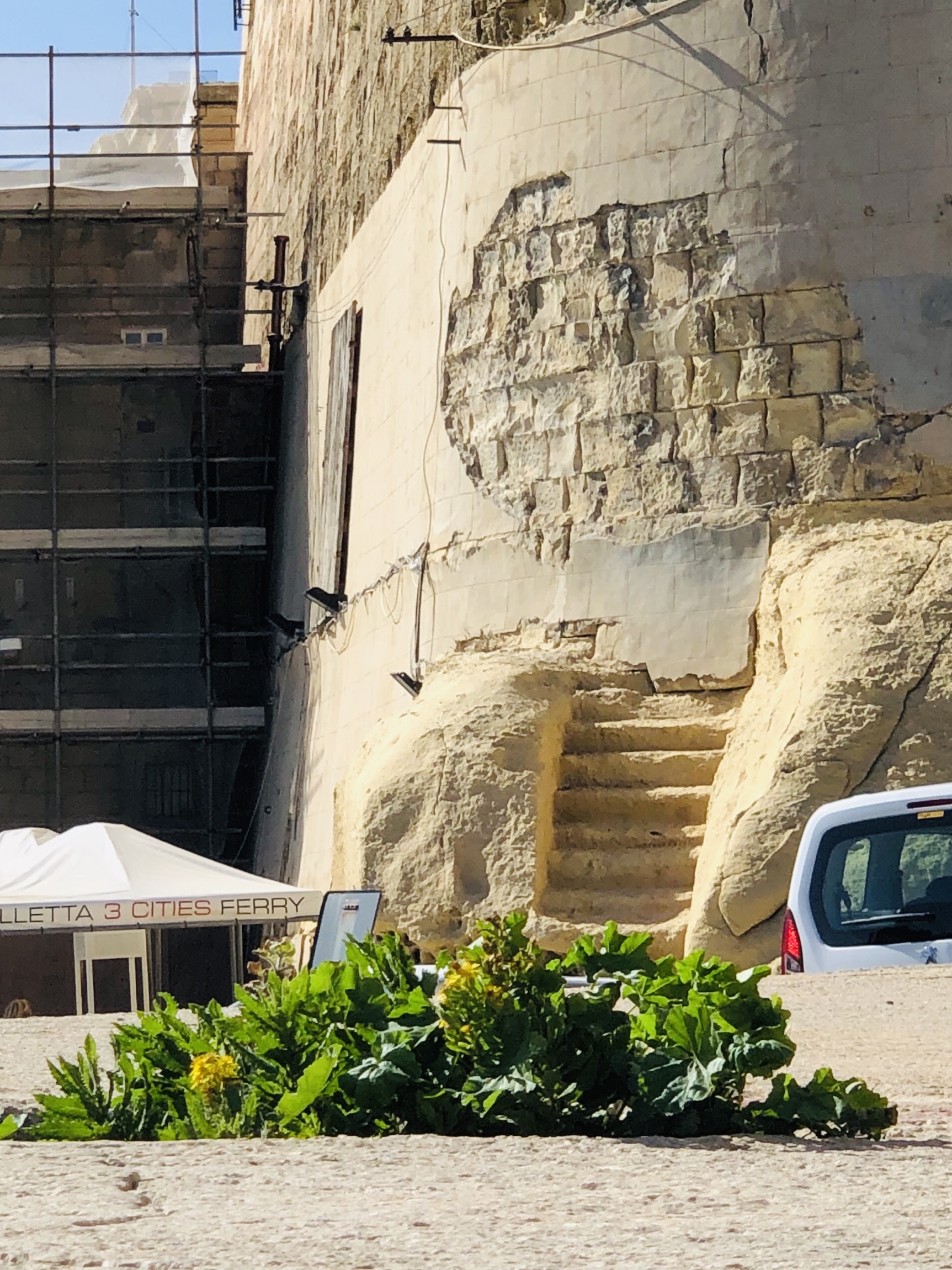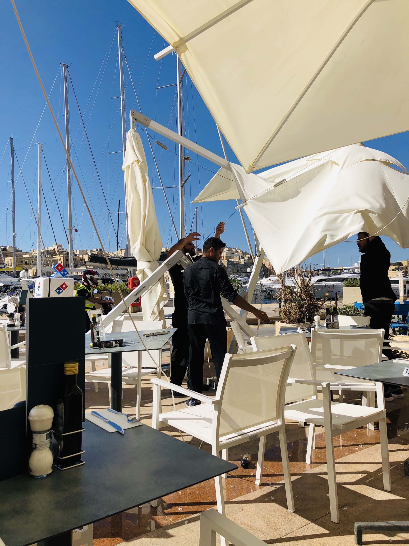 While sitting at a seaside eatery on opposite side of Valetta harbour, with umbrellas with the support off to one side set up to shade the customers. The granite support broke on one and the whole thing crashed down on the table but missing the two ladies sitting at it. Shocking!!!