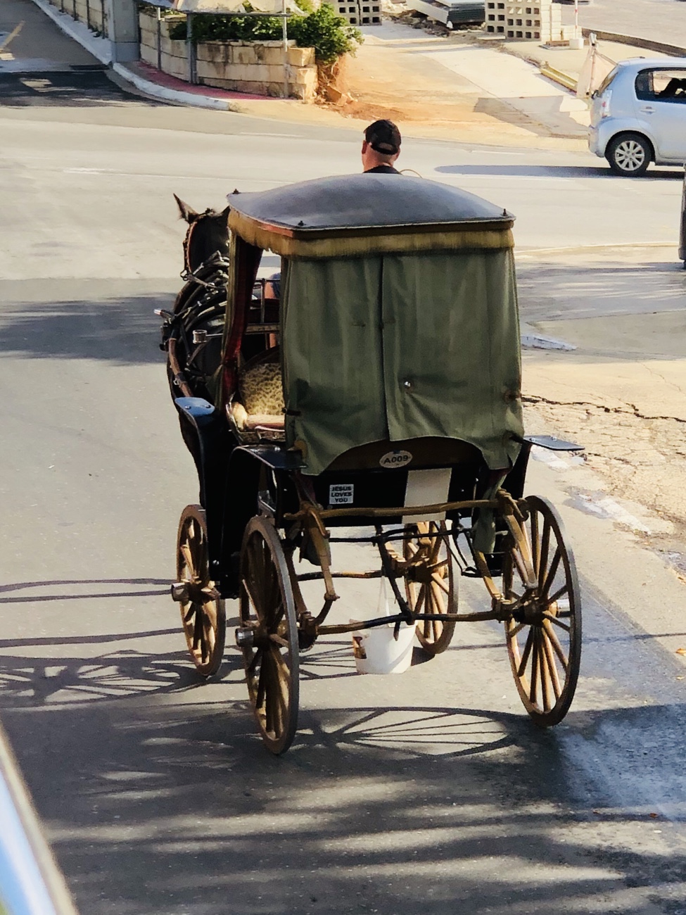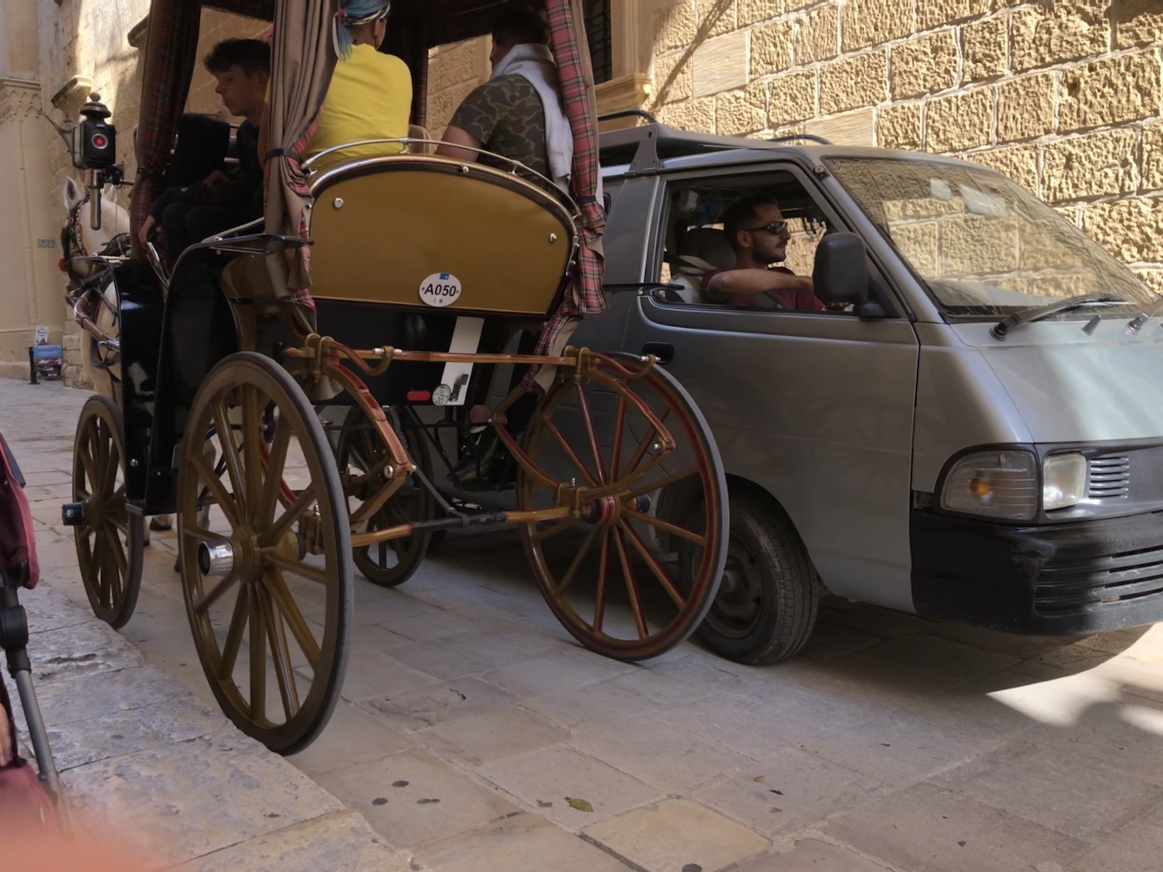 Talk about a tight squeeze… horse drawn carriage and a car passing each other on a decidedly narrow street to begin with.