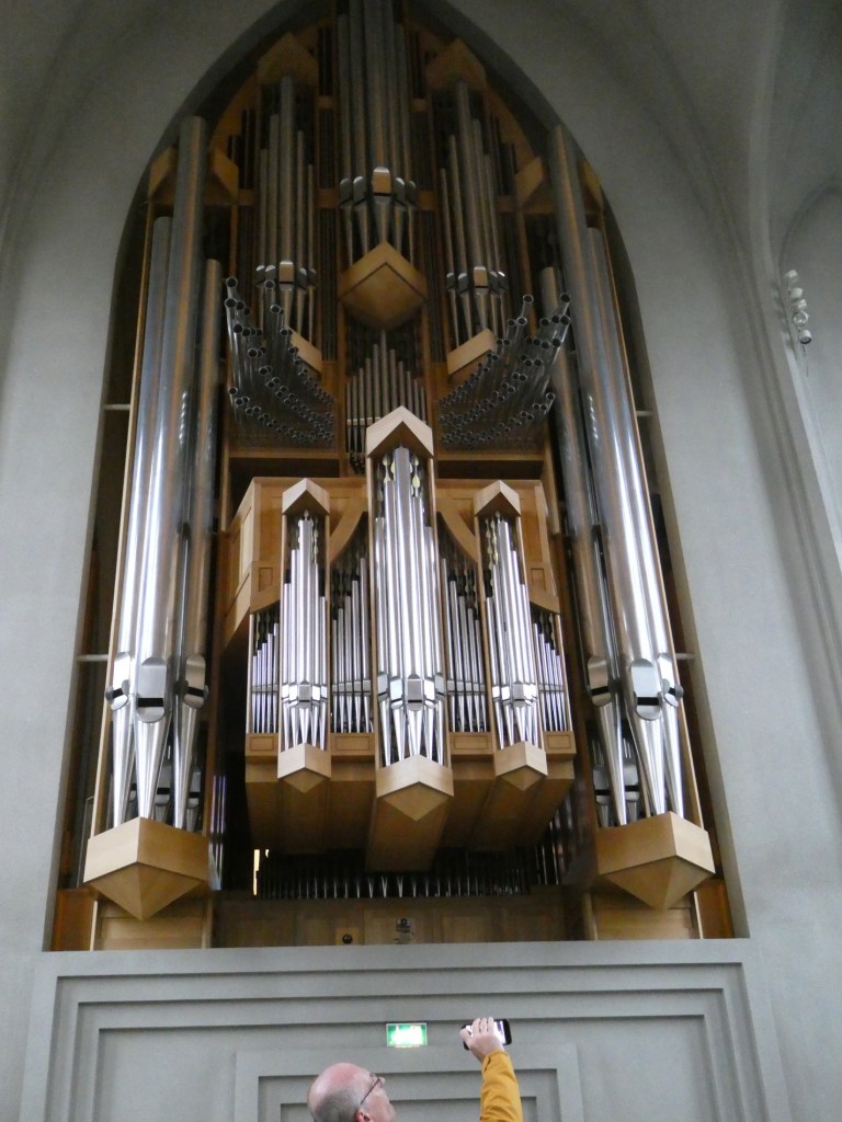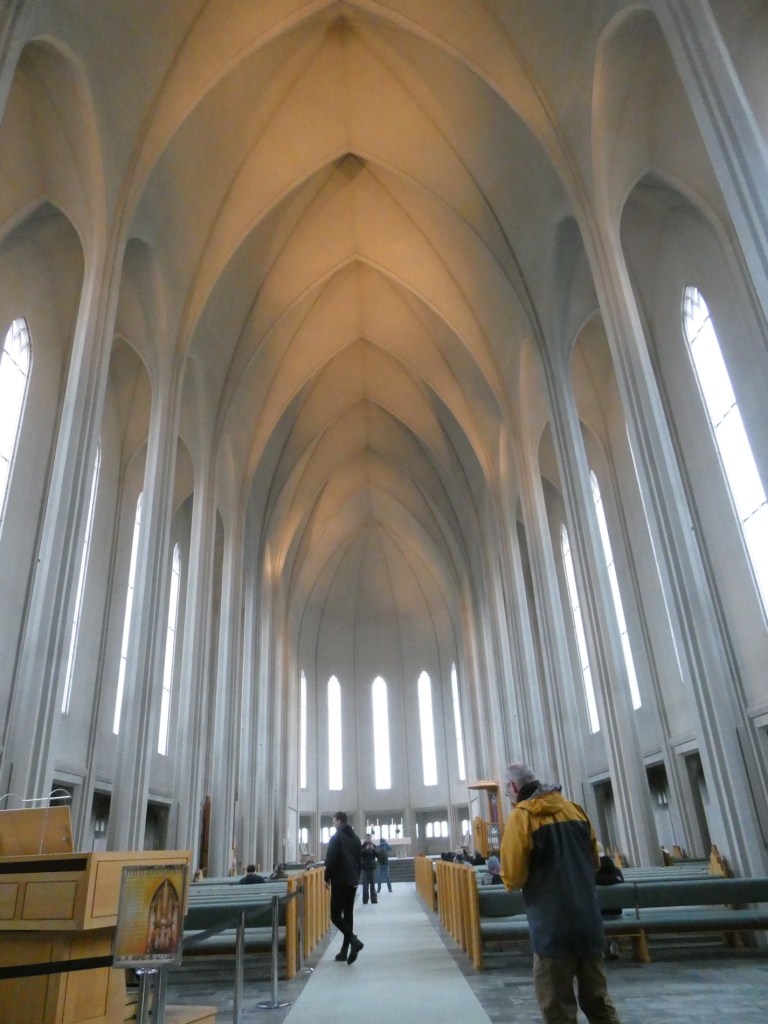 The weather, by the way, was about 10-11 C. and drizzling with low clouds. The terrain is so barren covered with long-ago dried up lava….not pretty! There are no trees to be seen anywhere other than that which has been planted. After a short nap (oh my we were exhausted), we took a walk to see the famous Lutheran church “Hallgrimskirkja”as well as to find a restaurant that served traditional “Icelandic” meals.