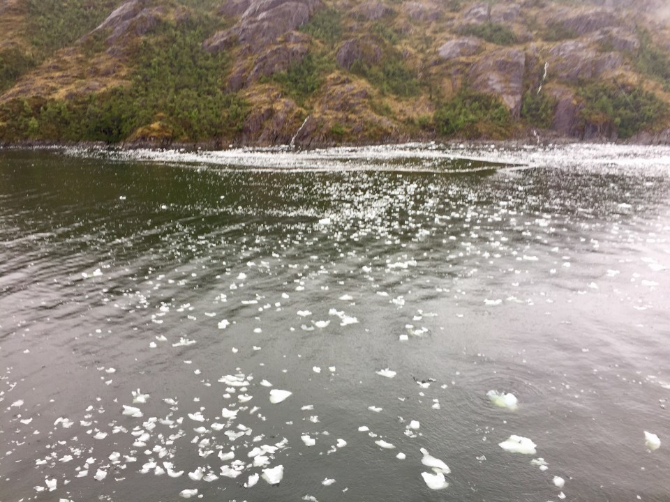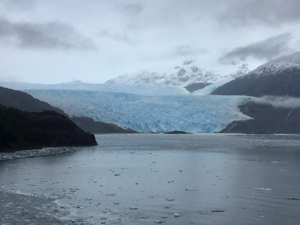 While travelling through more of the Chilean fiords, the Amalia Glacier, at first we couldn’t see because of clouds. But then it finally came into view. Amalia Glacier is about 3 kilometres wide. They lowered one of the boats into the sea to collect a “bergie” and hoisted it up for display in “Horizons”.