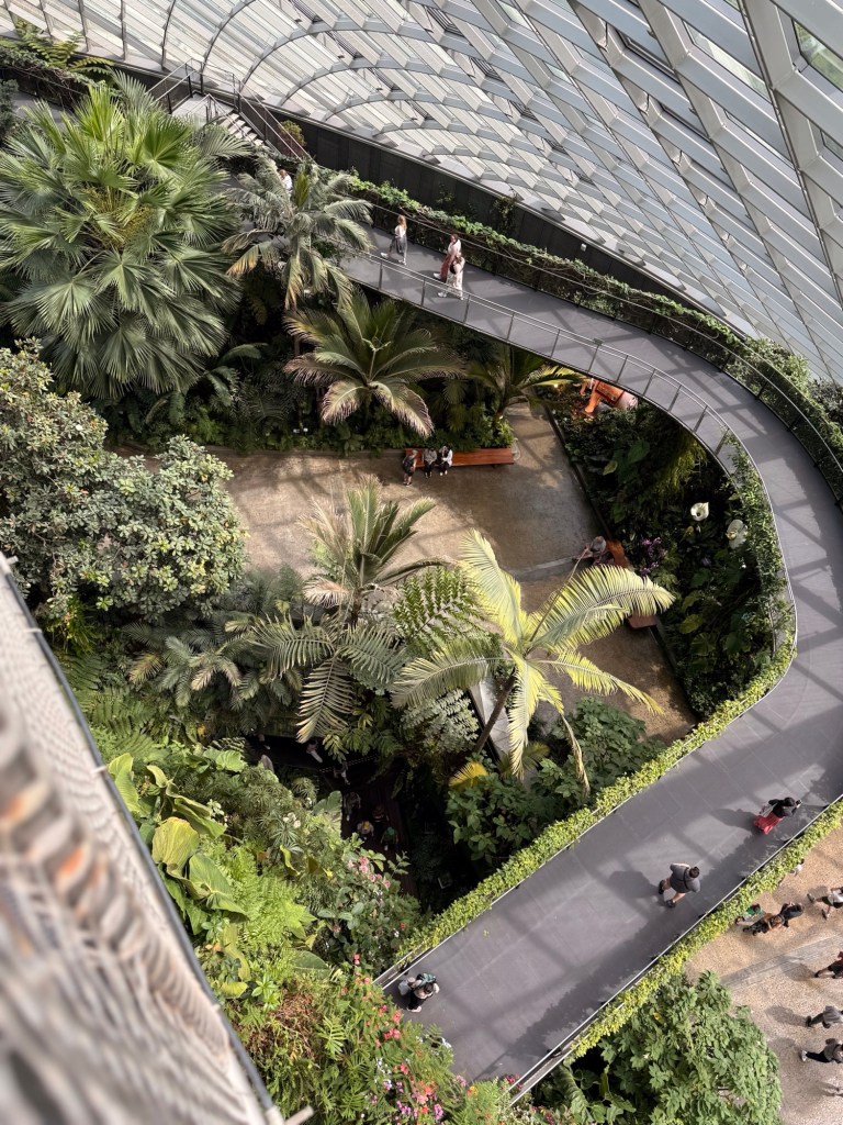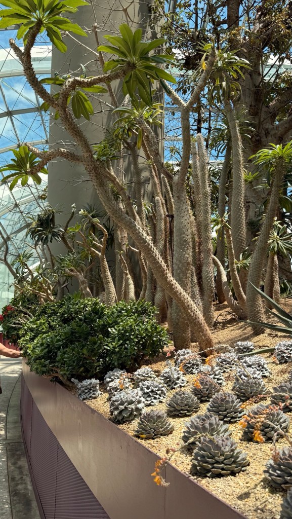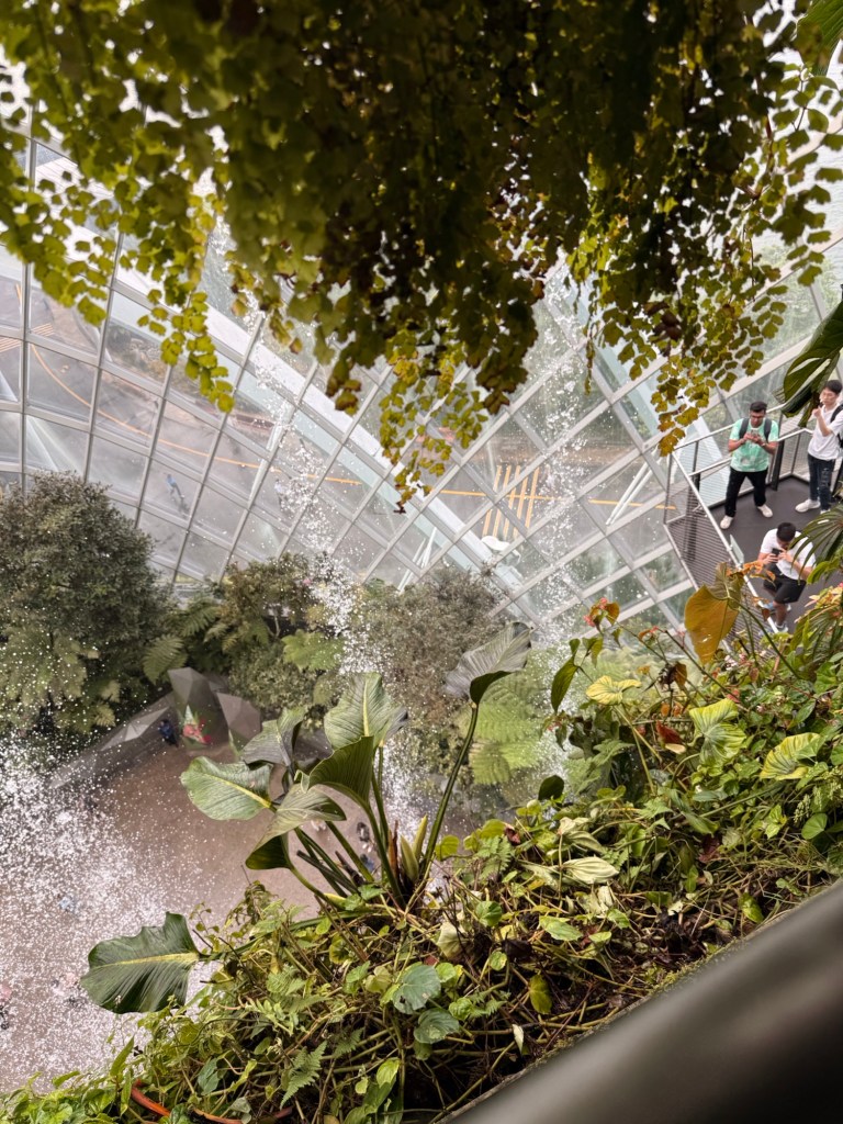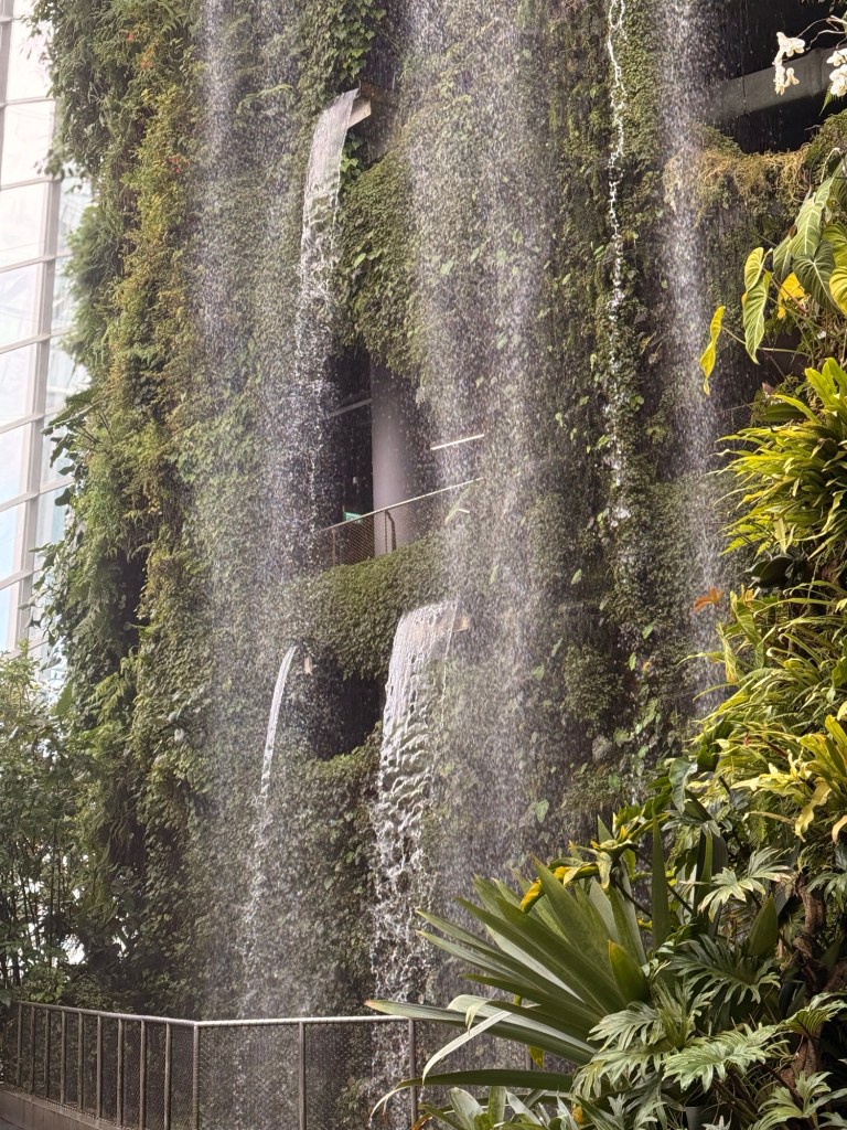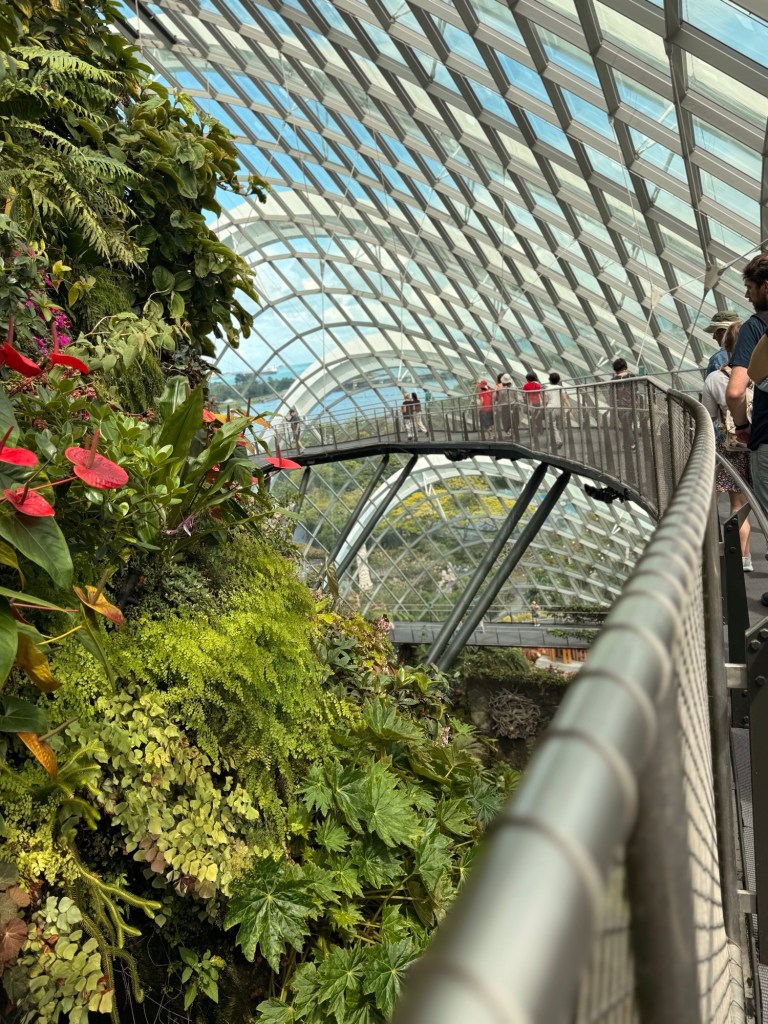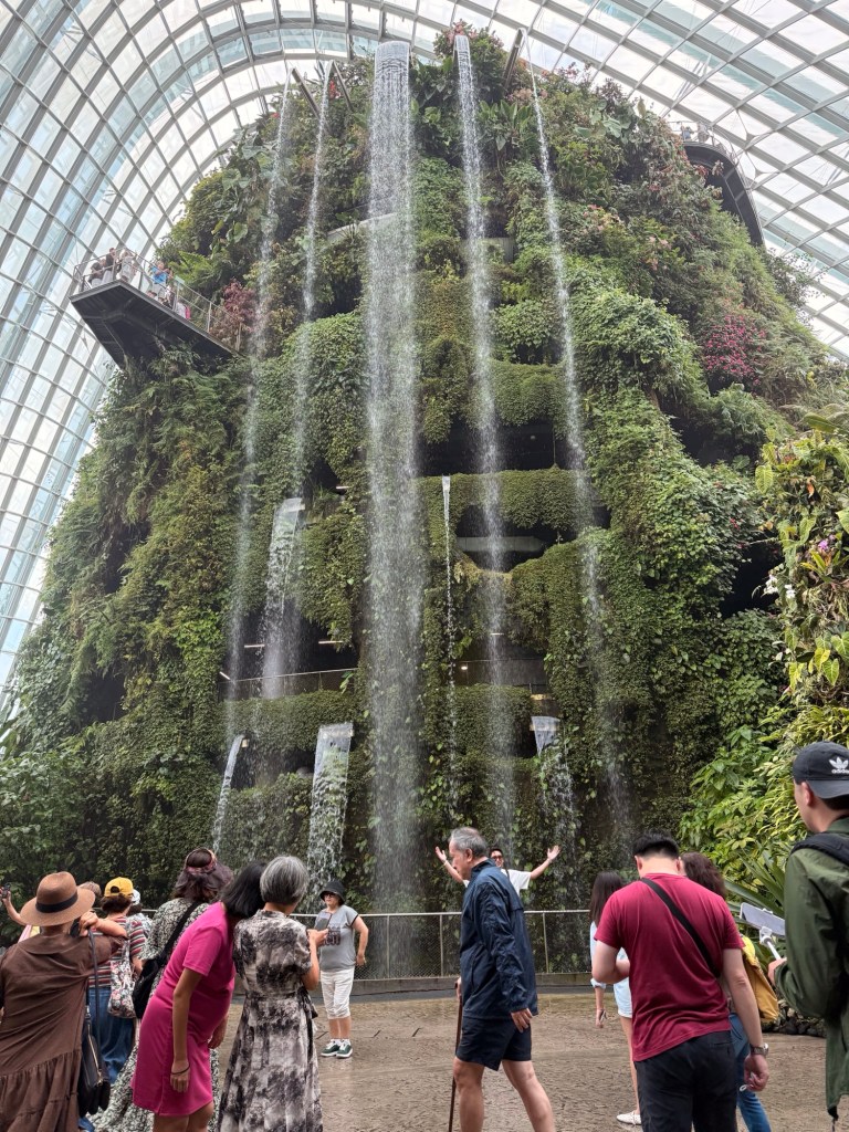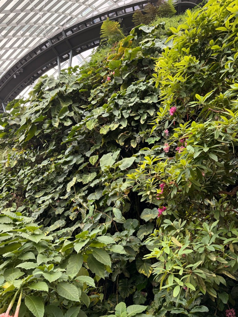 Another beautiful place we saw on the first day in Singapore…the Cloud Forest. It has one of the tallest inside waterfalls in the world. Again, this is inside a glass dome building with no support beams. The flowers/plants in this dome, are predominantly orchids but with some other tropical plants.