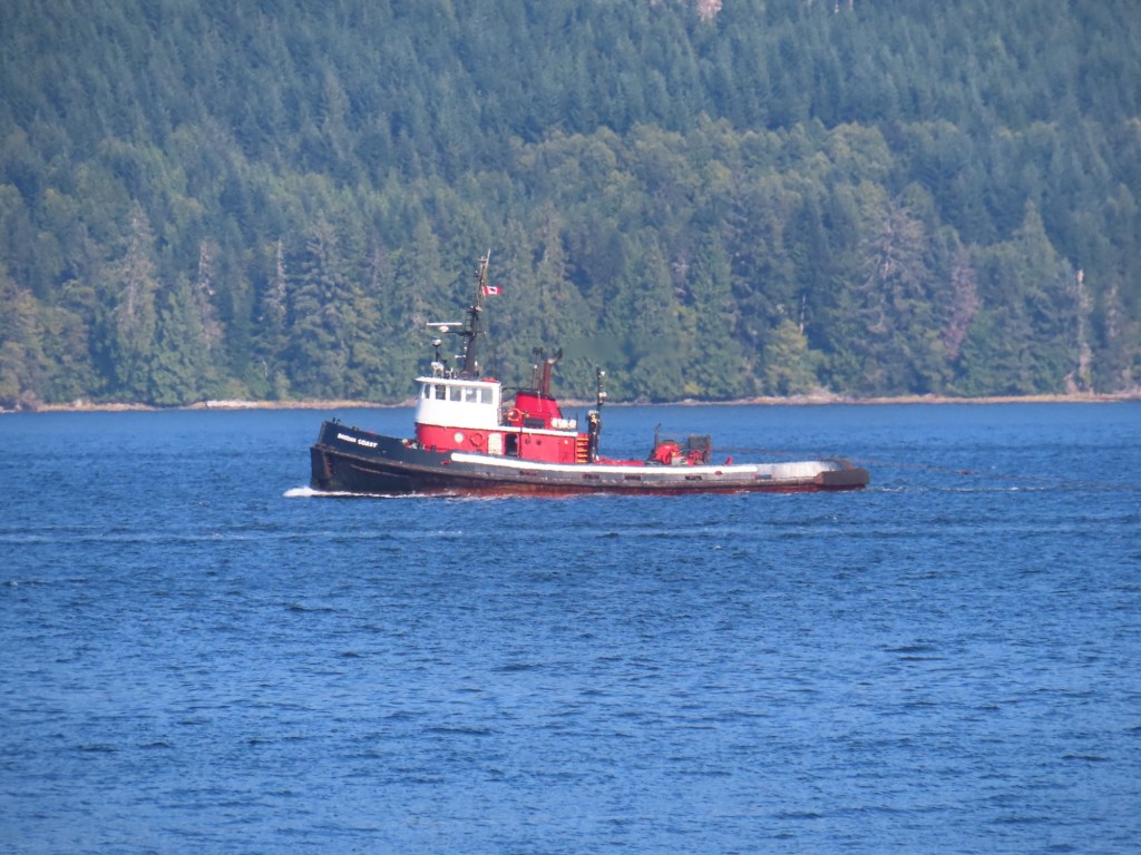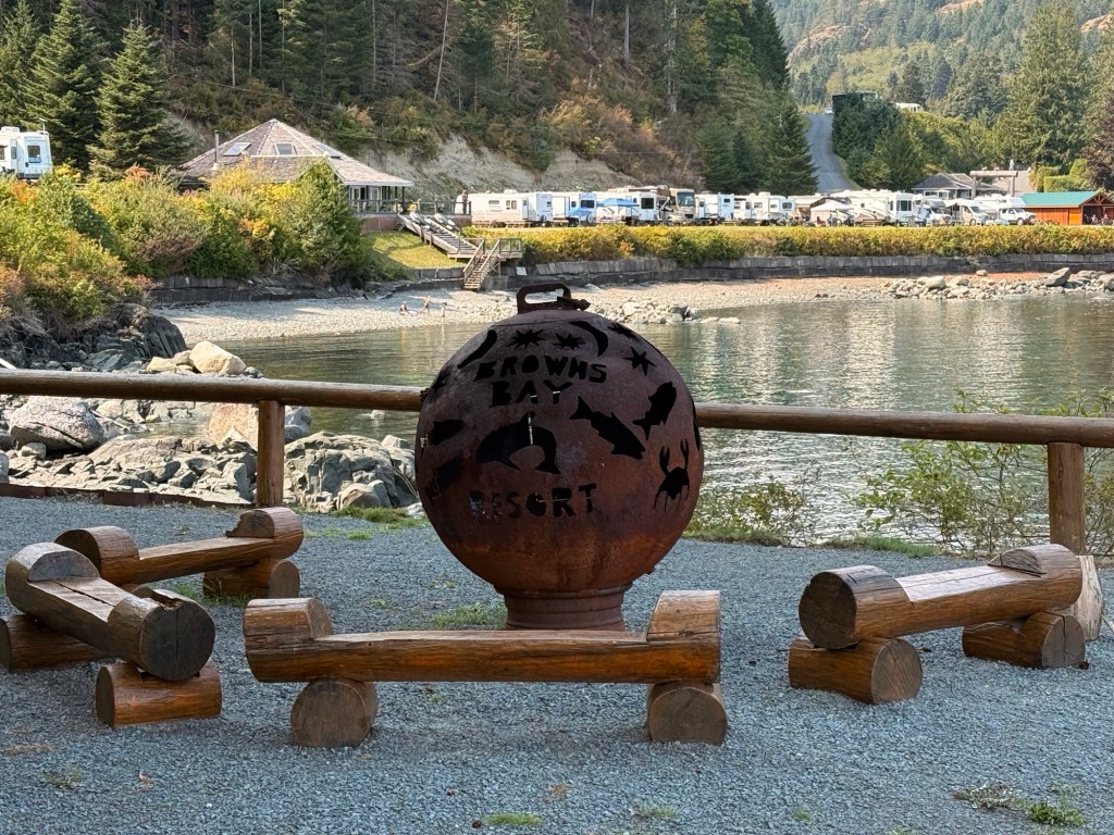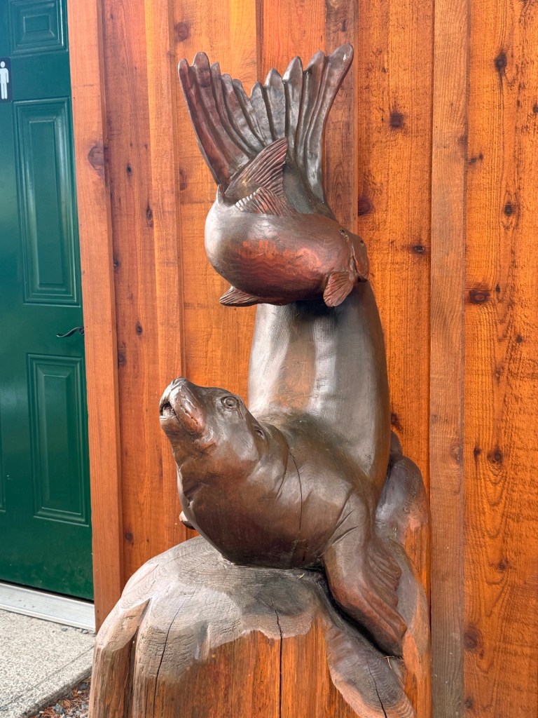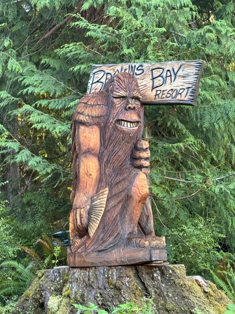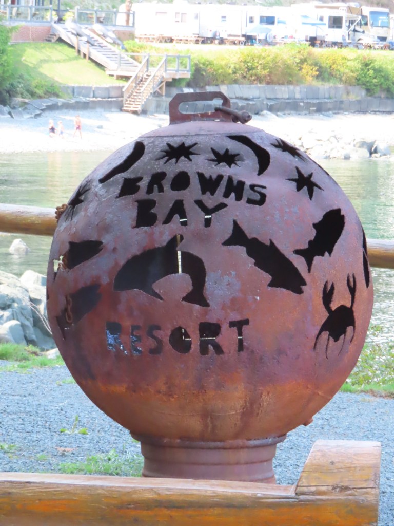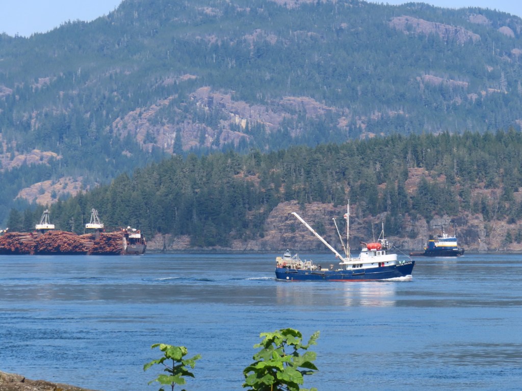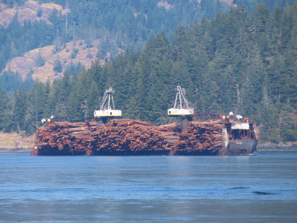 This is predominately an RV Park on the waters of Seymour Narrows. It is just north of the site of Ripple Rock where the world’s largest non-nuclear explosion happened in 1958. Because of that explosion and consequently the elimination of the major hazard to navigation, there are many ships of all different size and purposes, that travel up and down the coast using this route. Below are some of the ships that we saw pass through. Also included are scenes in the park including some very cool wood carvings. Besides being a RV park, it also has deep water docks and a very good restaurant (as well as a fish plant).