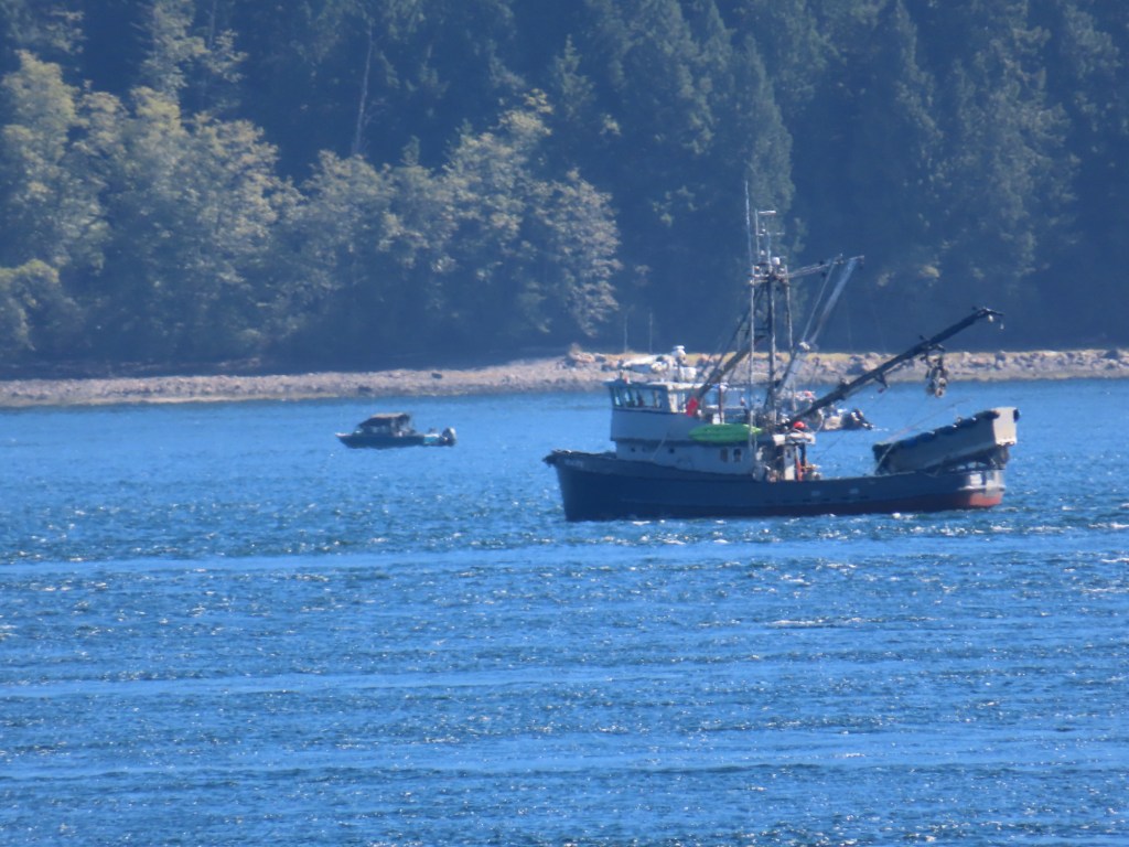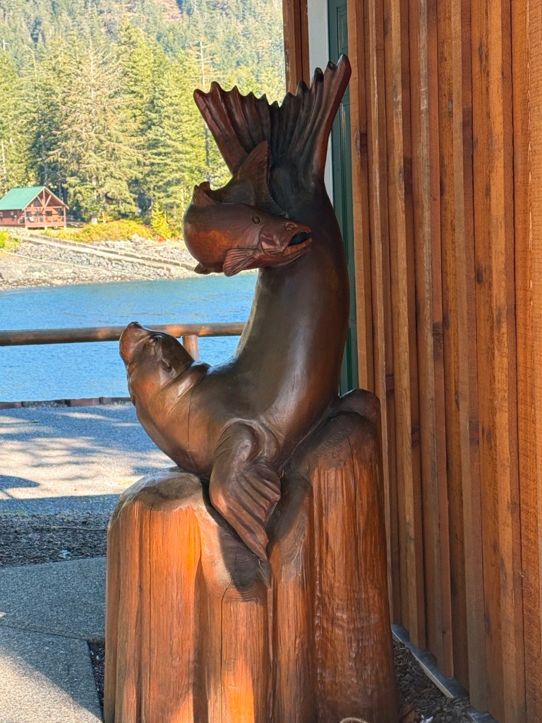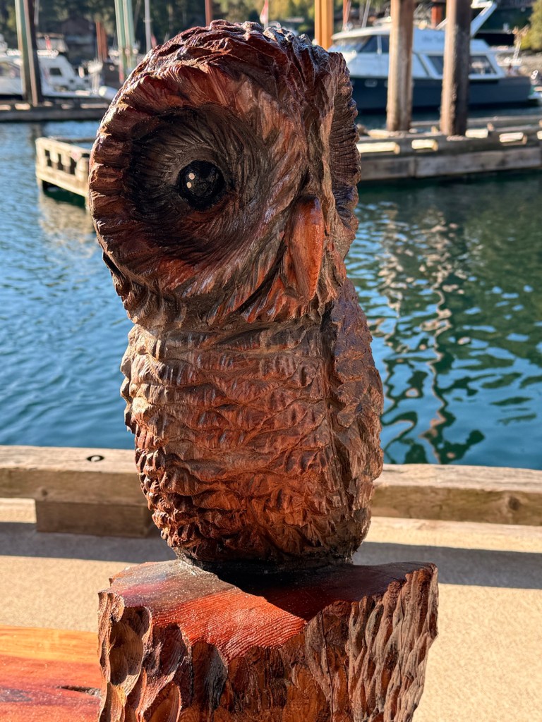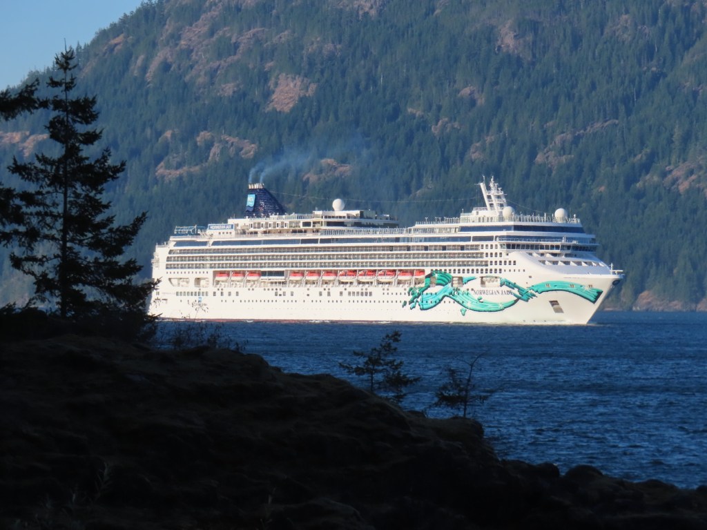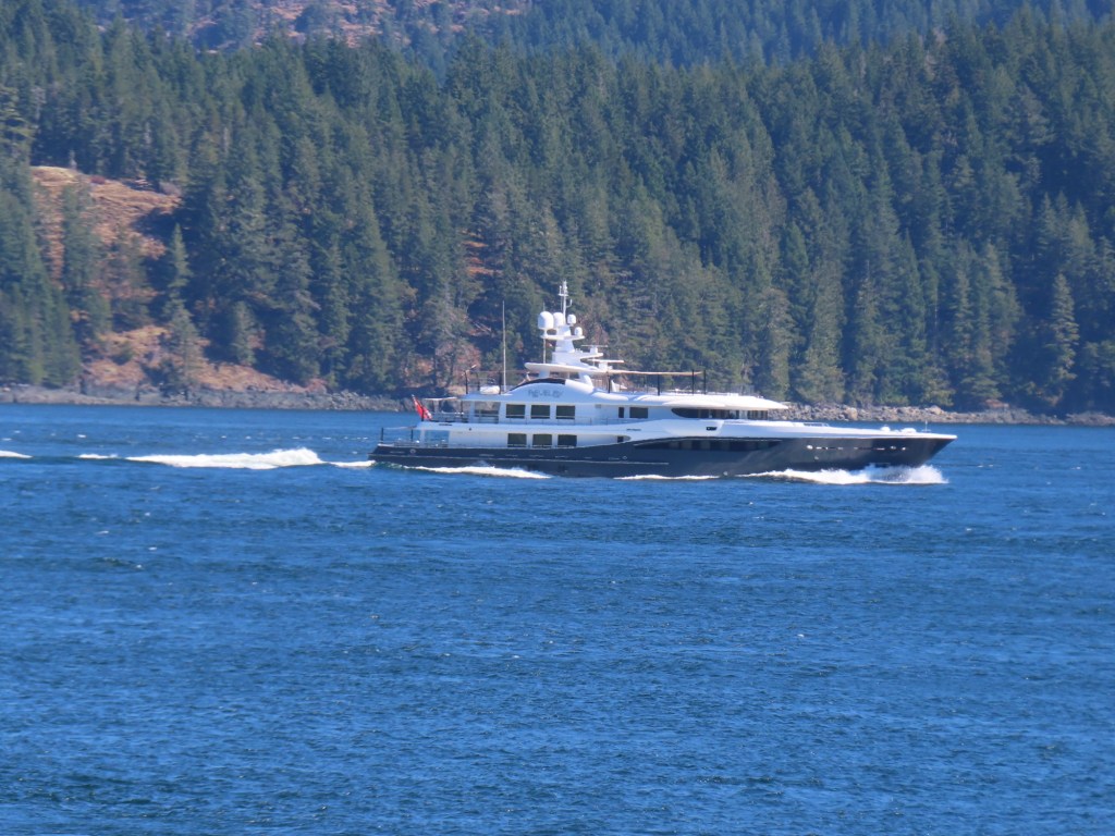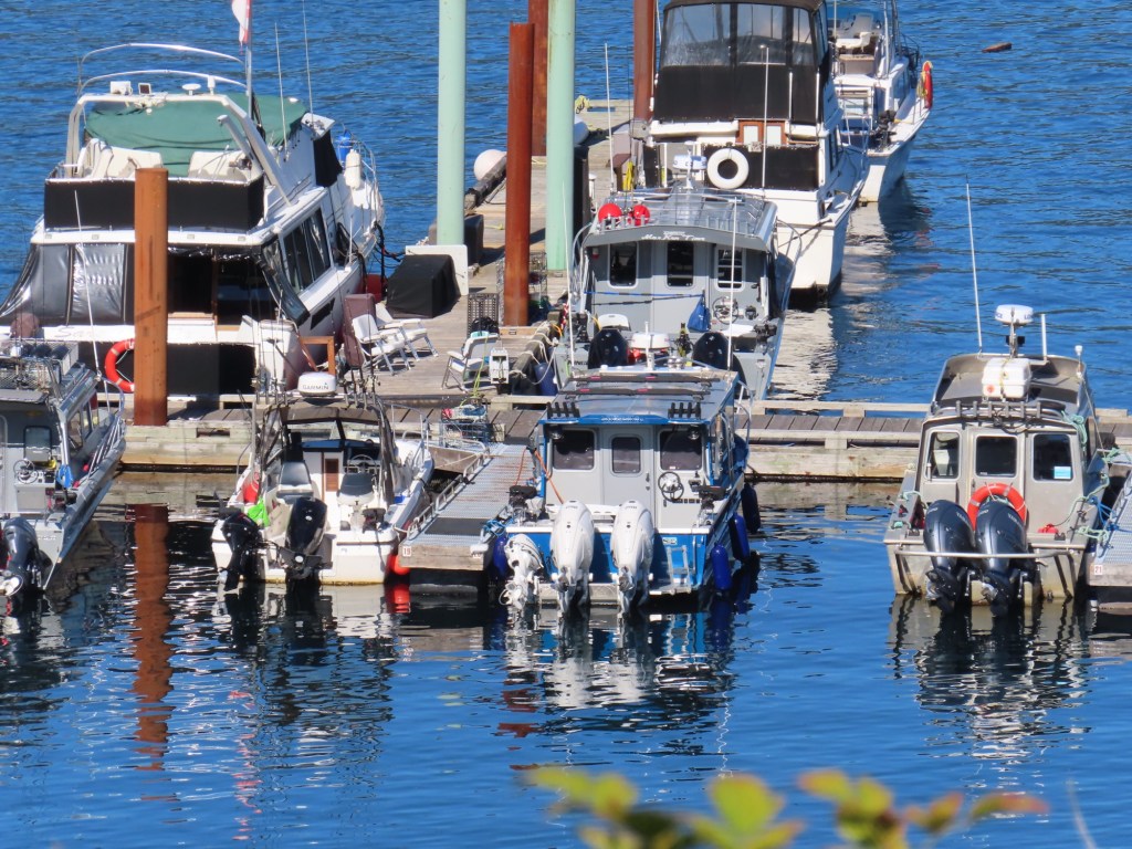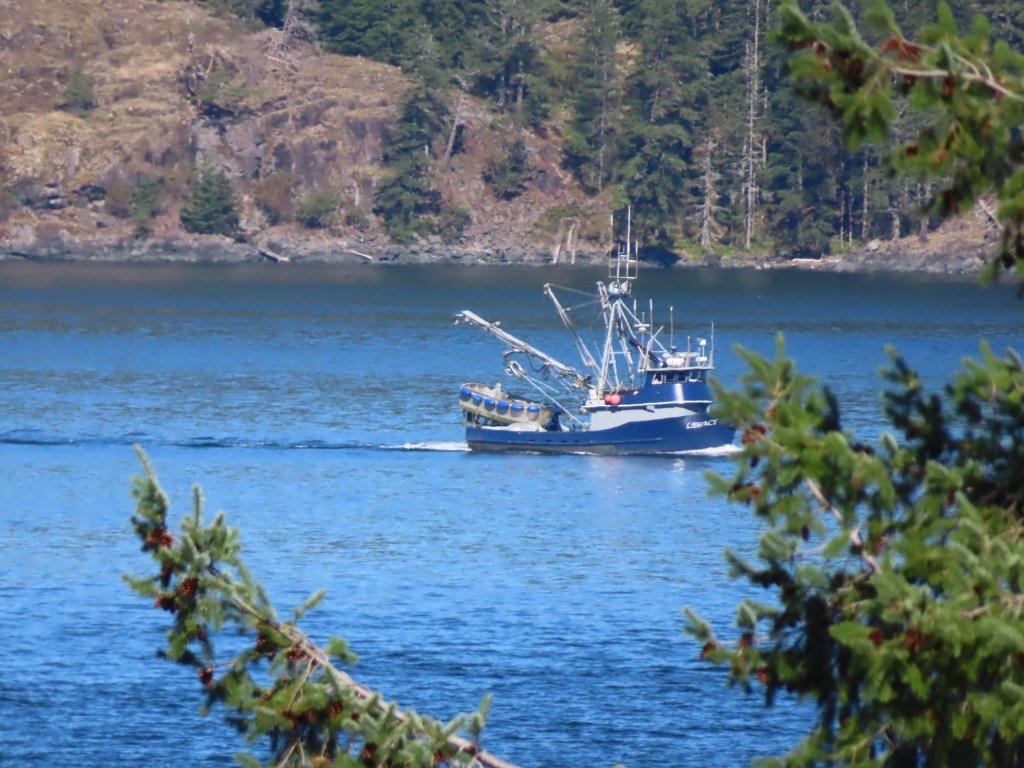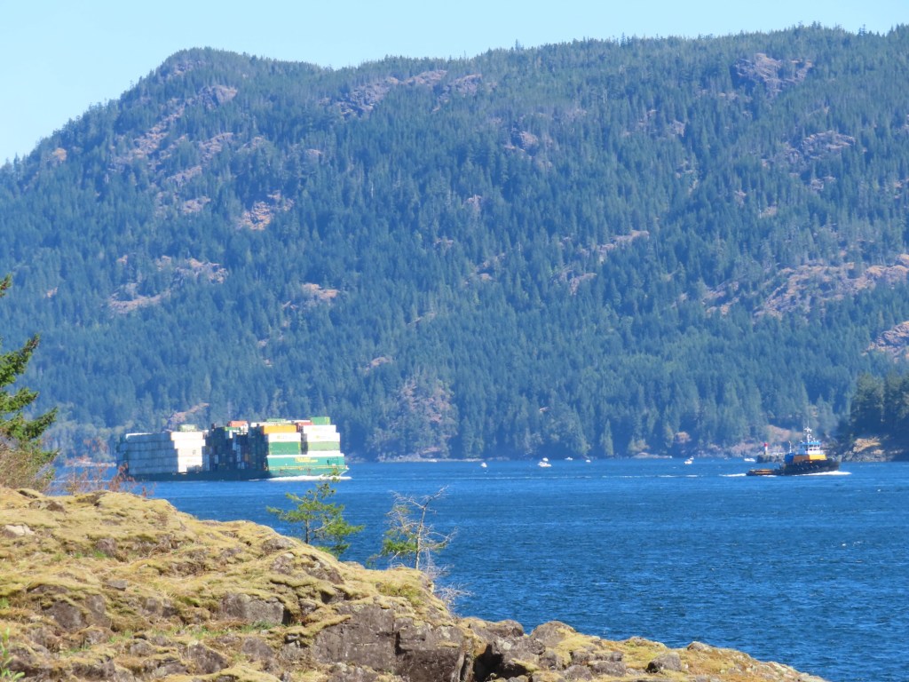This is predominately an RV Park on the waters of Seymour Narrows. It is just north of the site of Ripple Rock where the world’s largest non-nuclear explosion happened in 1958. Because of that explosion and consequently the elimination of the major hazard to navigation, there are many ships of all different size and purposes, that travel up and down the coast using this route. Below are some of the ships that we saw pass through. Also included are scenes in the park including some very cool wood carvings. Besides being a RV park, it also has deep water docks and a very good restaurant (as well as a fish plant).