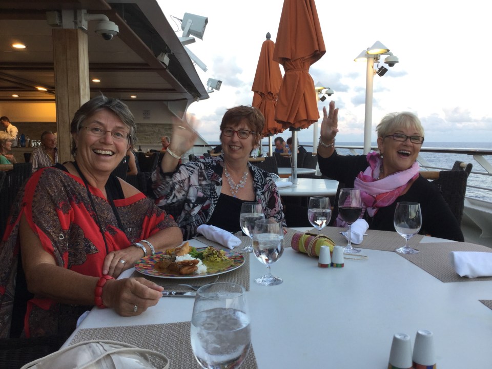 This ship is very lovely. The reception/concierge/destinations area and grand staircase is really exquisite and so much larger than the Regatta. The staterooms are really a whole lot larger as well. Can you believe 100 square feet larger plus the balcony is bonus. Marion and Joyce have the room next to Jeanette and myself so we had the room steward open the door that separates the two on the balcony. We even have a full bathroom with soaker tub and separate shower, granite floors and walls. Gorgeous! Because we all upgraded to concierge, we have access to the private deck at the rear of the ship with a thalassotherapy pool, sauna and steam room. The weight room is huge but I believe it is open to all, upgrade or not. All this quite posh but maybe not as glamorous as in Vegas style as some of the other ship but then we don’t have to contend with huge populations. This ship has a maximum passenger quota of 1250…..twice the size of Regatta.
