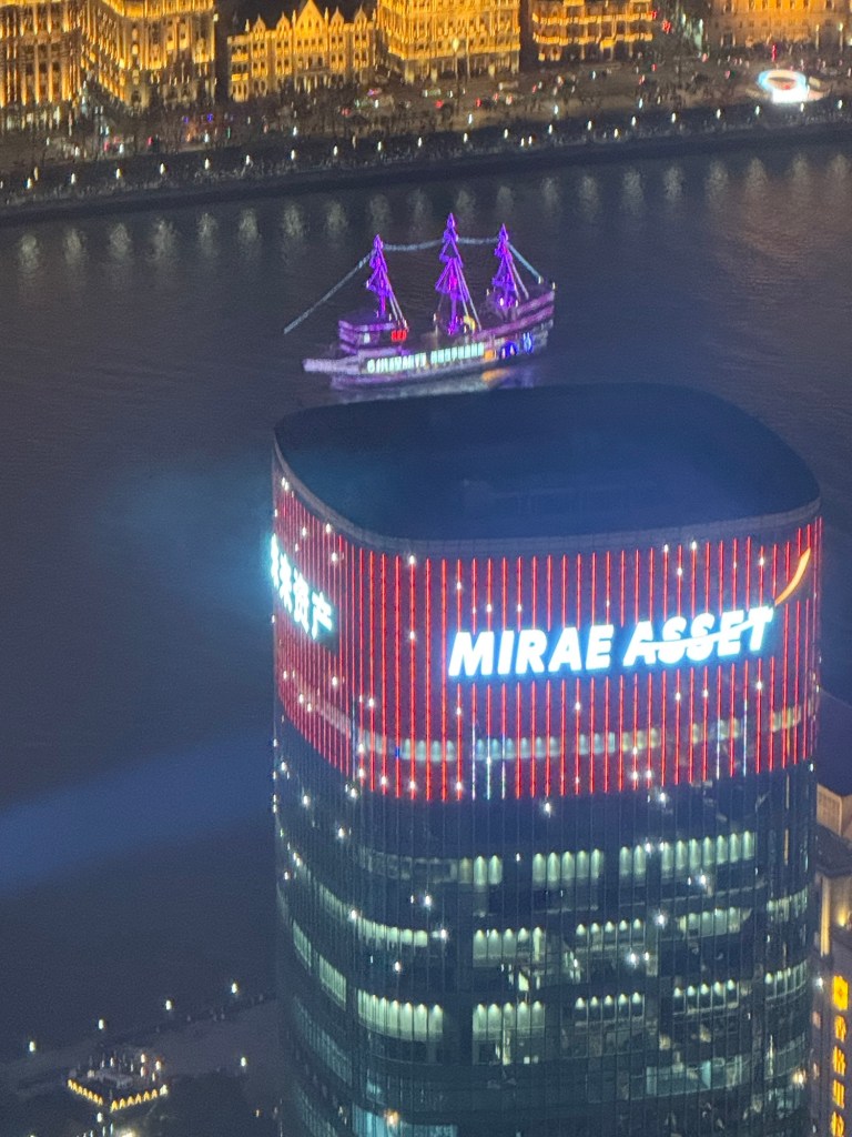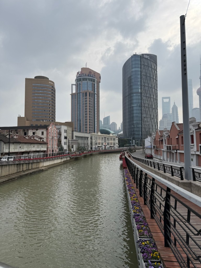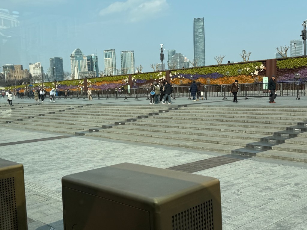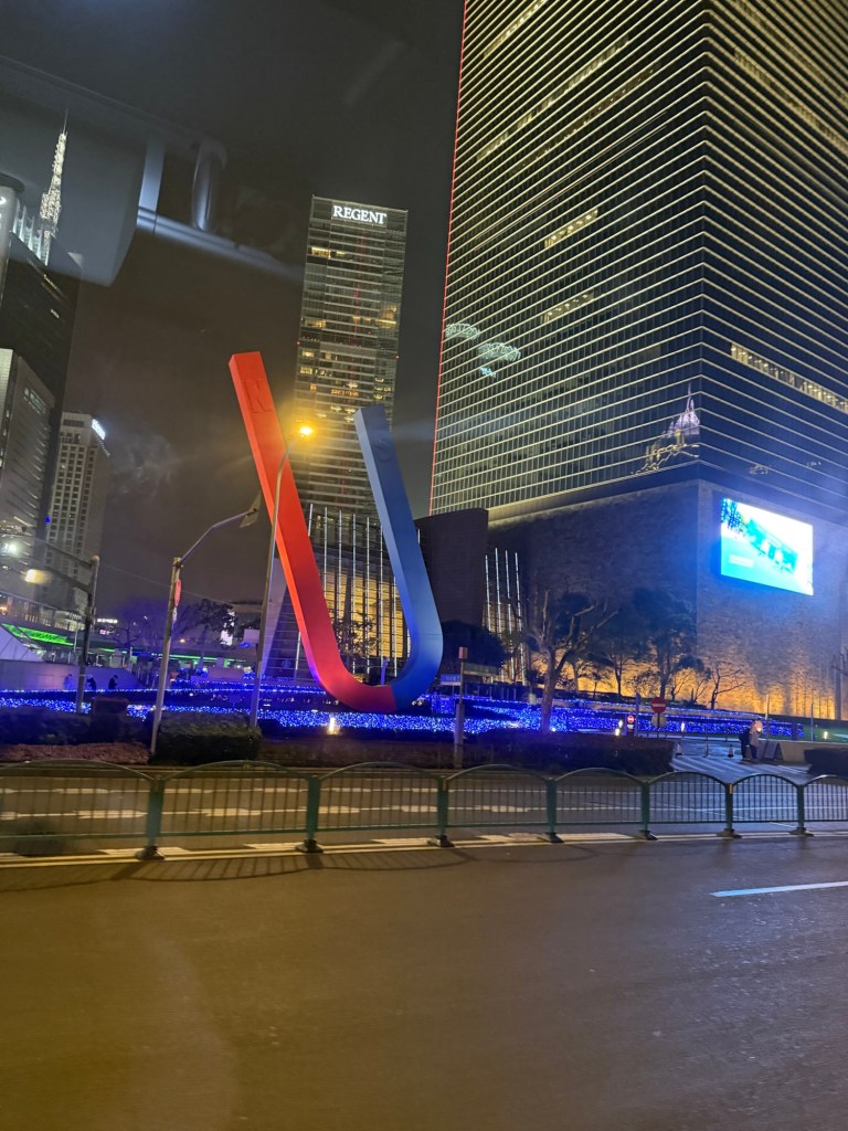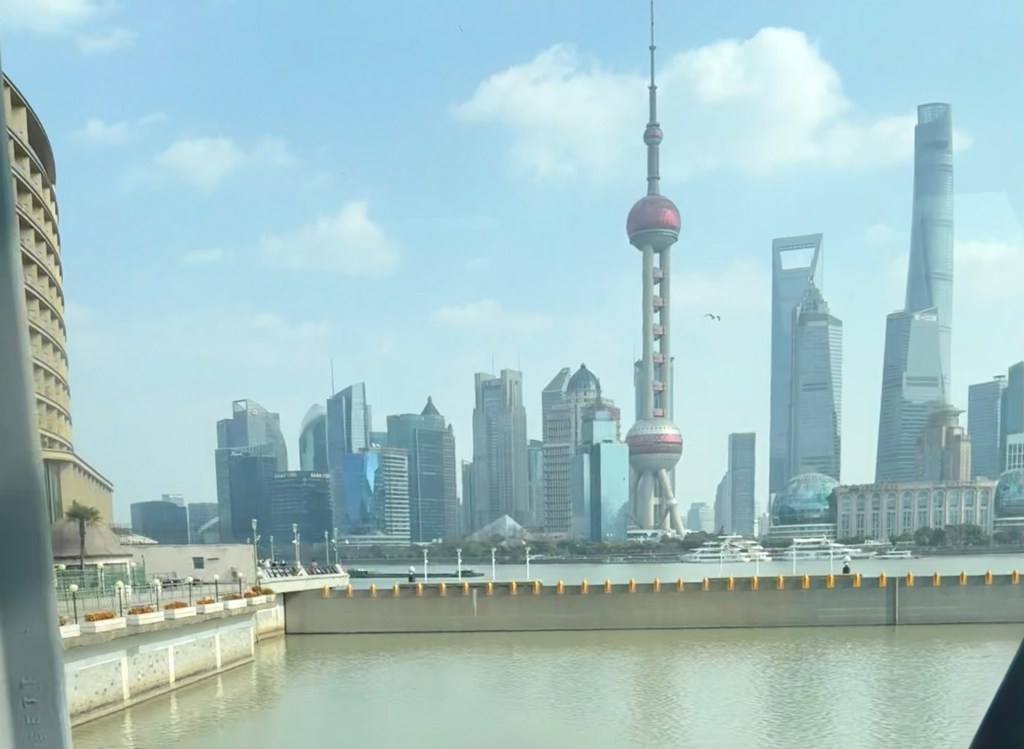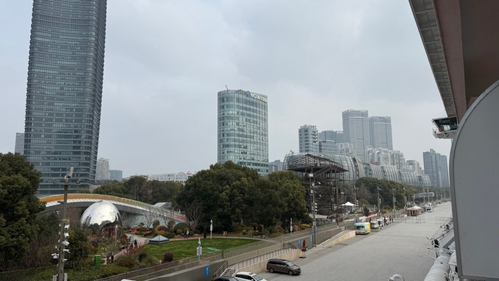 J and I don’t have any excursions booked so we went in search of a mall. It was strange to see hardly any vehicles on the streets…. Big wide empty streets. It’s still part of the New Years time so not much activity this early in the day. The architecture of the buildings both on this side of the Huangpu River and the Pudong, are spectacular. It is absolutely amazing. There are lovely parks and huge jungle Jim type facilities as well as a skating rink for kids outside the mall. When we decided to return to the ship, we couldn’t find the access to return to the ship even if you could almost touch it. We have gotten our quota of steps in already and the day is only partly over. The sun is trying to shine but there is a lot of smog in the skies and it is quite cool…. At most only 8C. today.