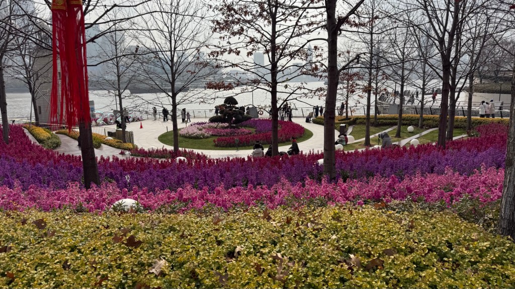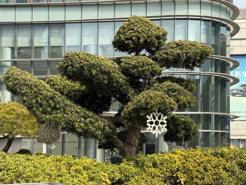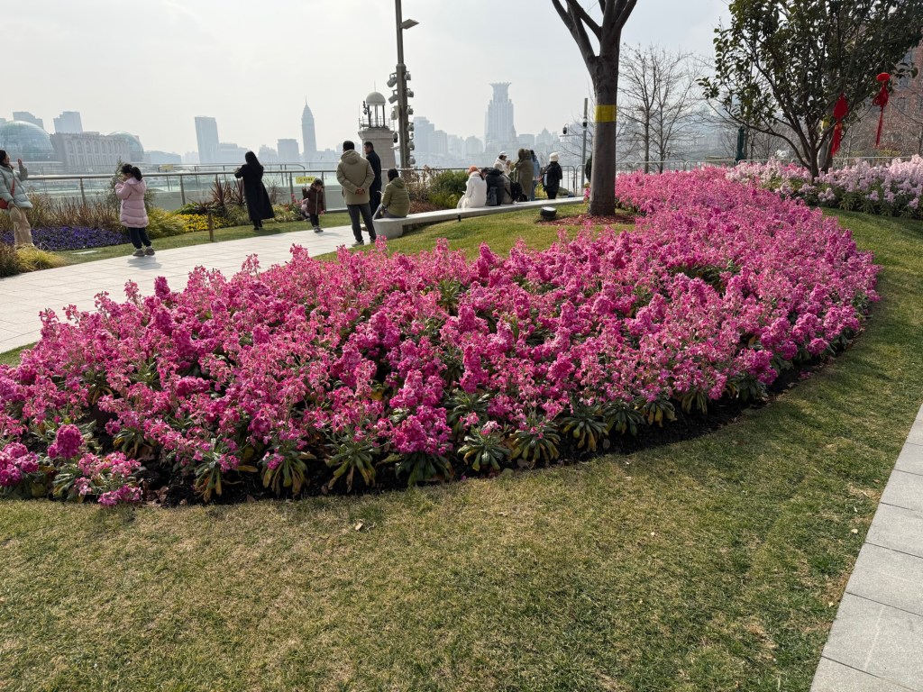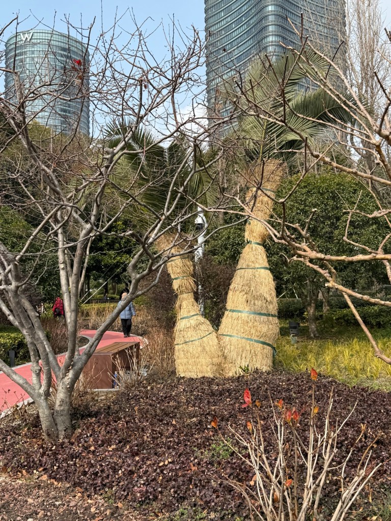 Note the jungle Jim type facilityFlower boxes (with camellia bushes) separating bike lanes Symbols of Chinese New YearsOutside the mallOutside the mallSkating rink at the mallNot sure what kind of trees these are but cool lookingAnother figurine… this one outsideWalkway along the waterfrontCool seat made with wooden layersPalms wrapped in grass for protection from coldBut then stocks are bloomingYear of the snake in blown glass… beautiful.