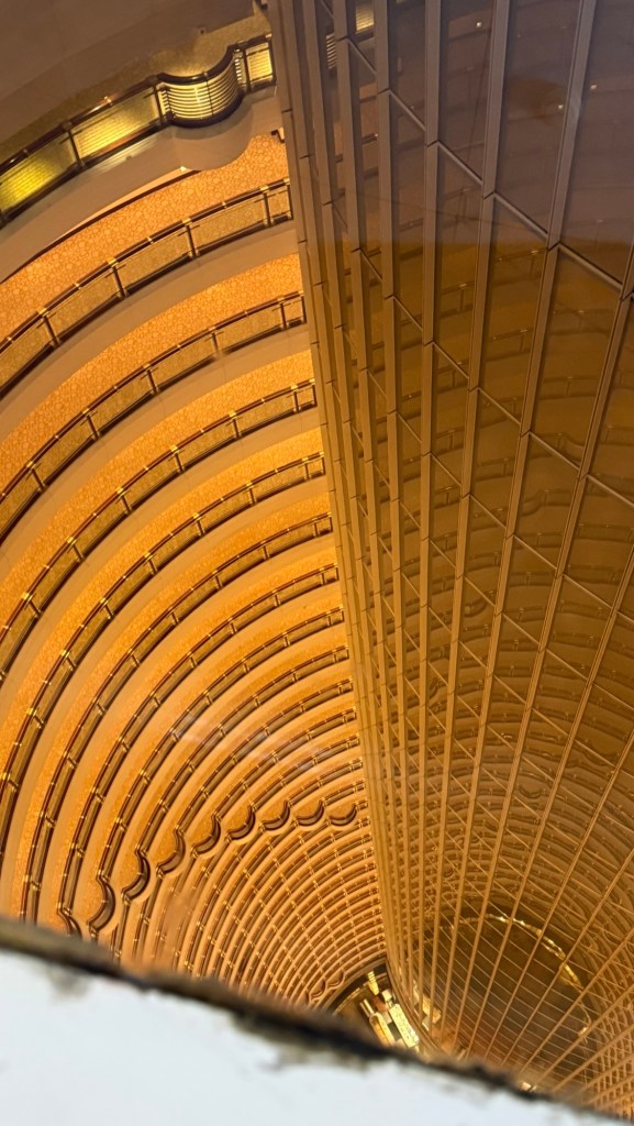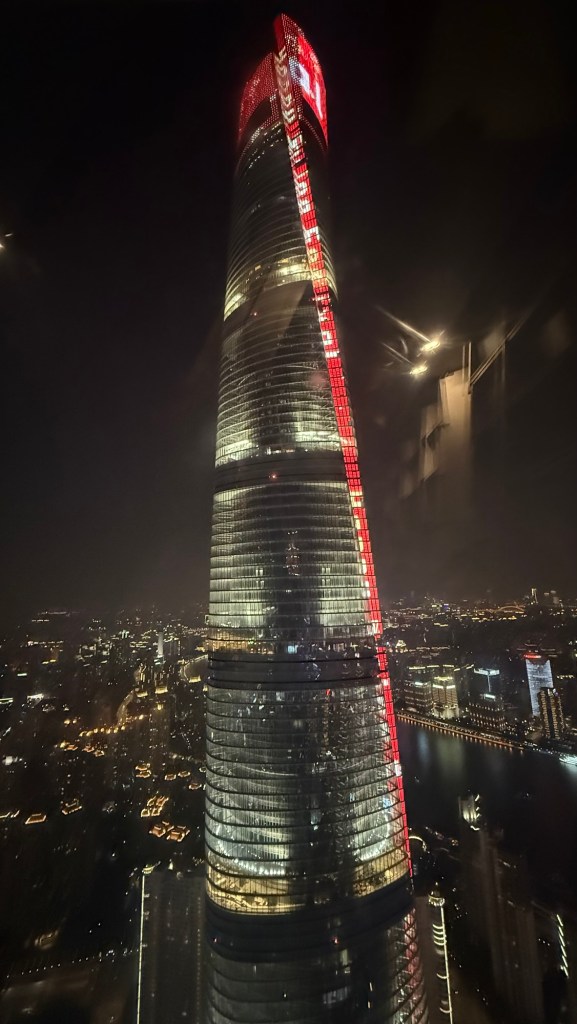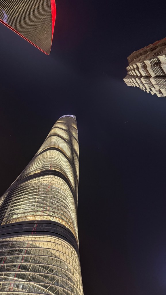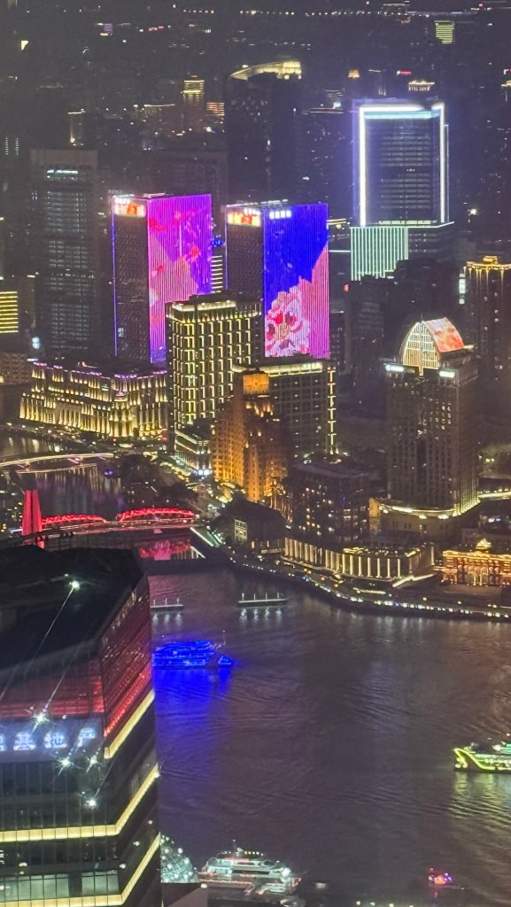 The red building is the Tv station… I think the 1st one built Tourist Boats all light upMoving screens on the building are amazing Shanghai TowerLooking inside the JinMao Tower. It is a hotelThat is the reception areaClick on this picture to see all three towers looking up. You have to be careful you do t fall over while doing that