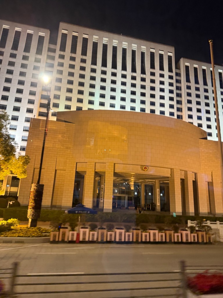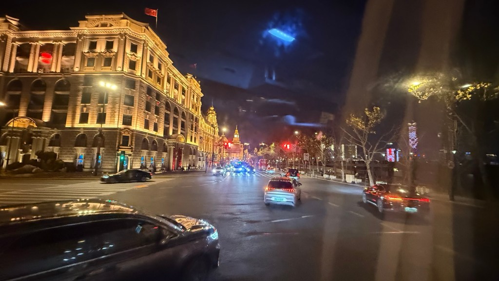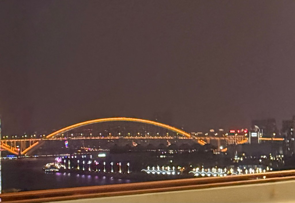 I woke up around 2:30am cuz the ship was not being bounced around any longer. I looked out at that time. I would say that we were probably sailing up the Yangtze. I saw no high buildings but lights all along the banks.
