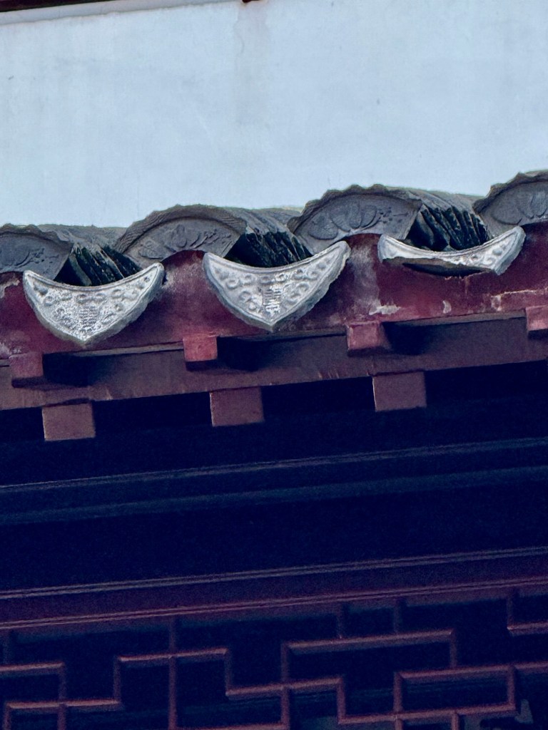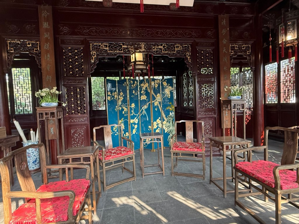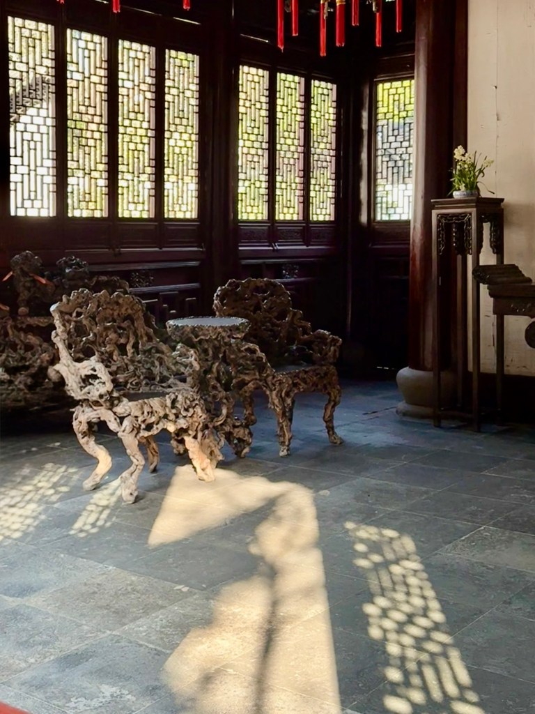 Lots of water and rocksFurniture made from tree rootsFurniture from Ming dynasty (like IKEA…lol)WinterberriesSpecially made for the edge of the roofs to prevent rain from coming into building
