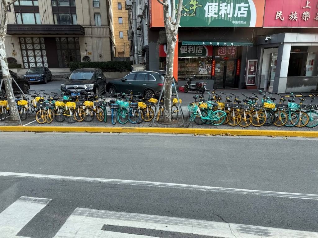 Bicycles for rent using app. Park near Yu gardens Bamboo….a sign of wealthPeople had been evicted out of “affordable housing” and all boarded up+\-5 yrs ago.
