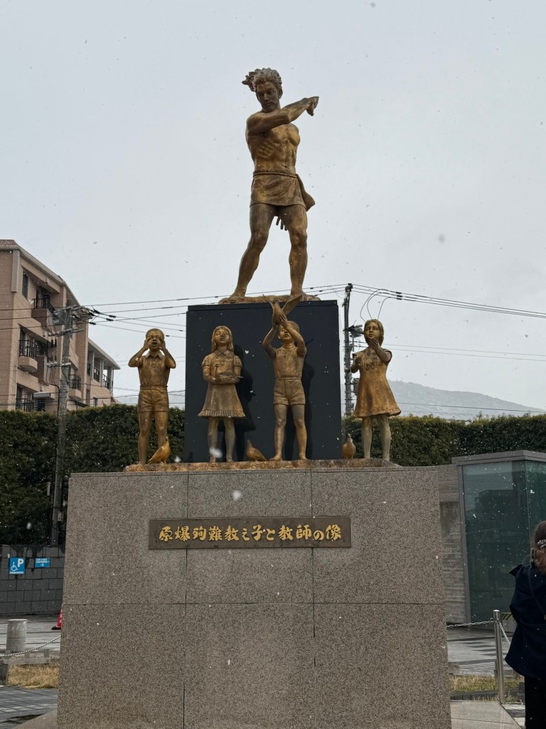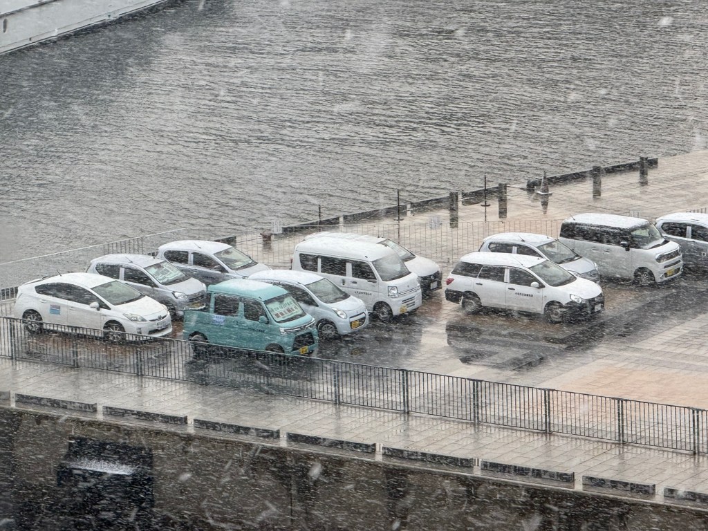 Today we have arrived into the port of Nagasaki. Our excursion that we had booked was cancelled due to inclement weather so we booked another. And guess what….. it is snowing pretty heavy!!! The temperature is only 2C with wind (so even colder)… going to a high of 5C. Funny though that the sun is trying to come out.