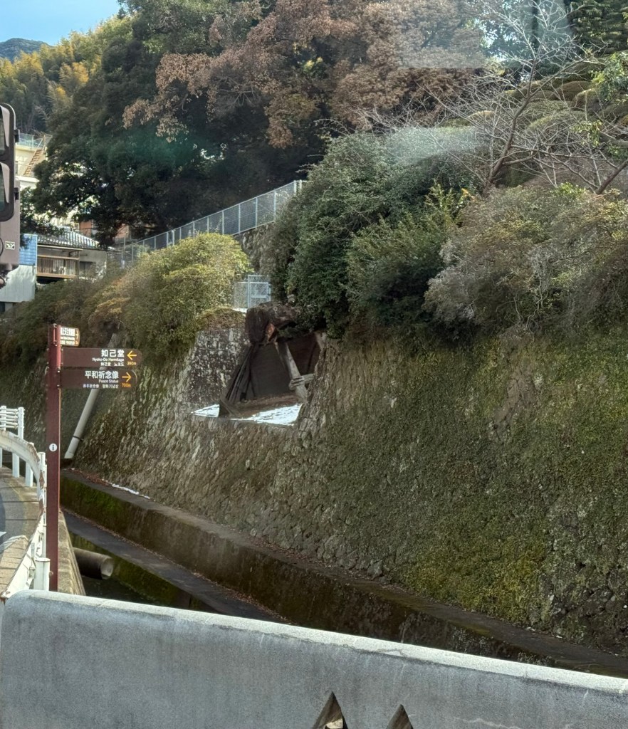 The doctors little houseAt the peace parkThe Christian cathedral replica.. not a good picture but you can see where bell landed Where the bell that was from the tower, landedShinto shrine gate… only half is remaining… temple is behind.Someone made a snowman