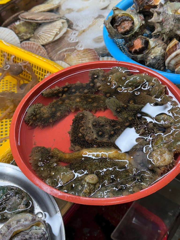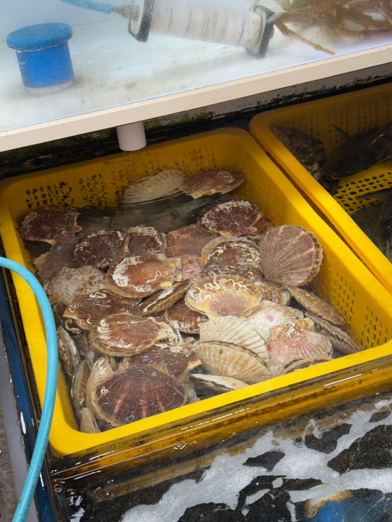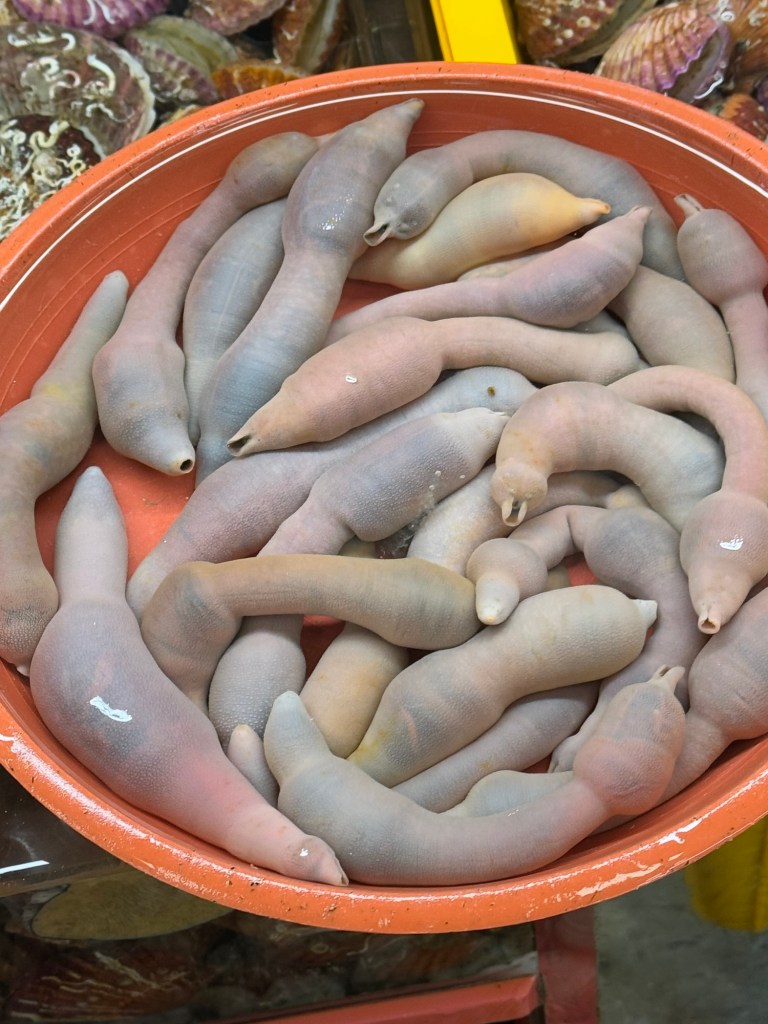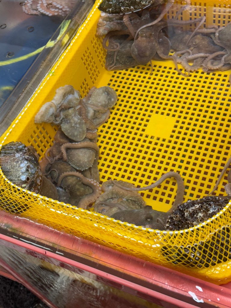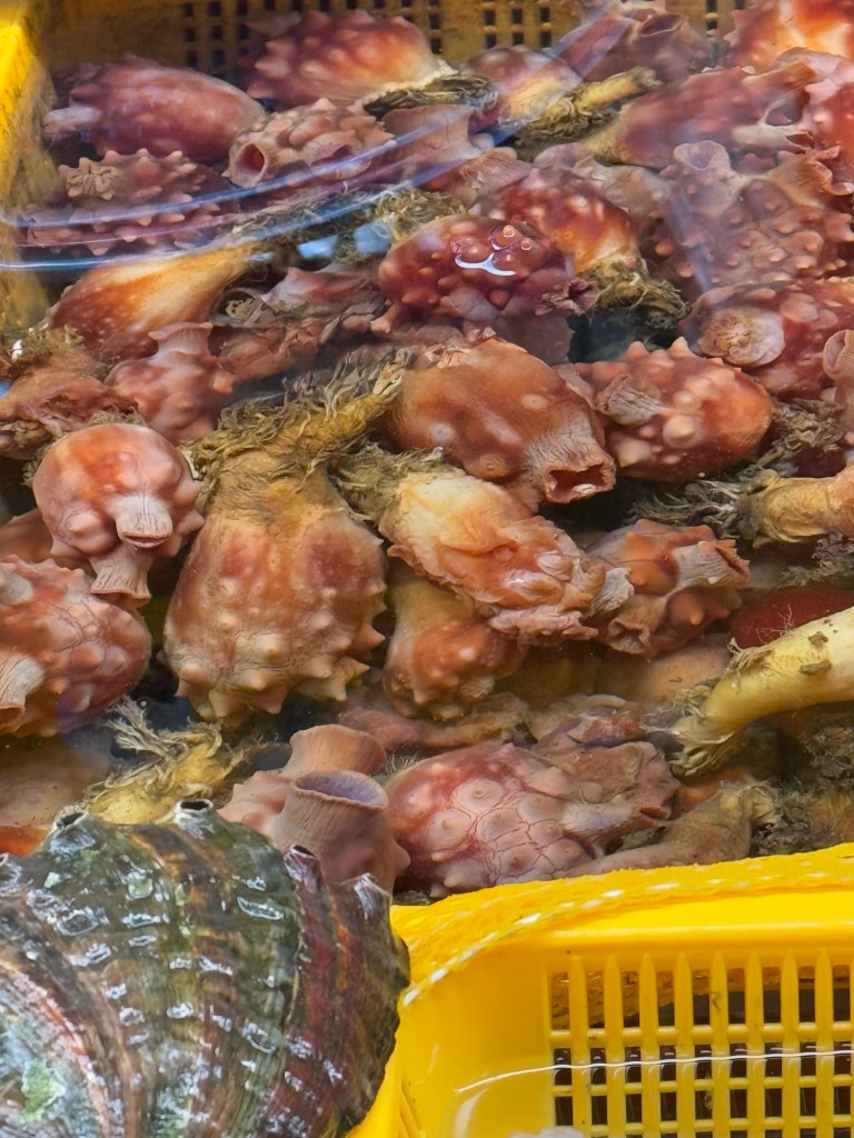 It was soooo coldThis vendor had buffs with ears that popped up… funny!EelScallopsJust outside the entranceTiny octopusAbaloneSea cumber Squirt “Penis fish”Giant crabsSome kind of conch