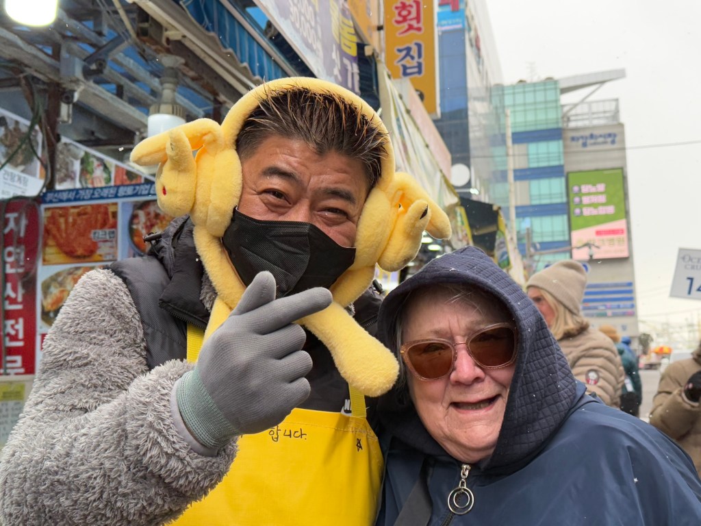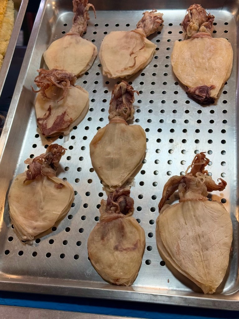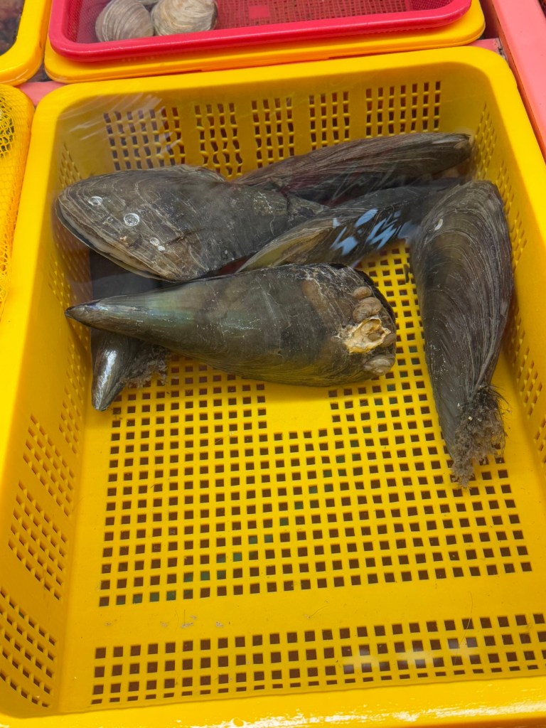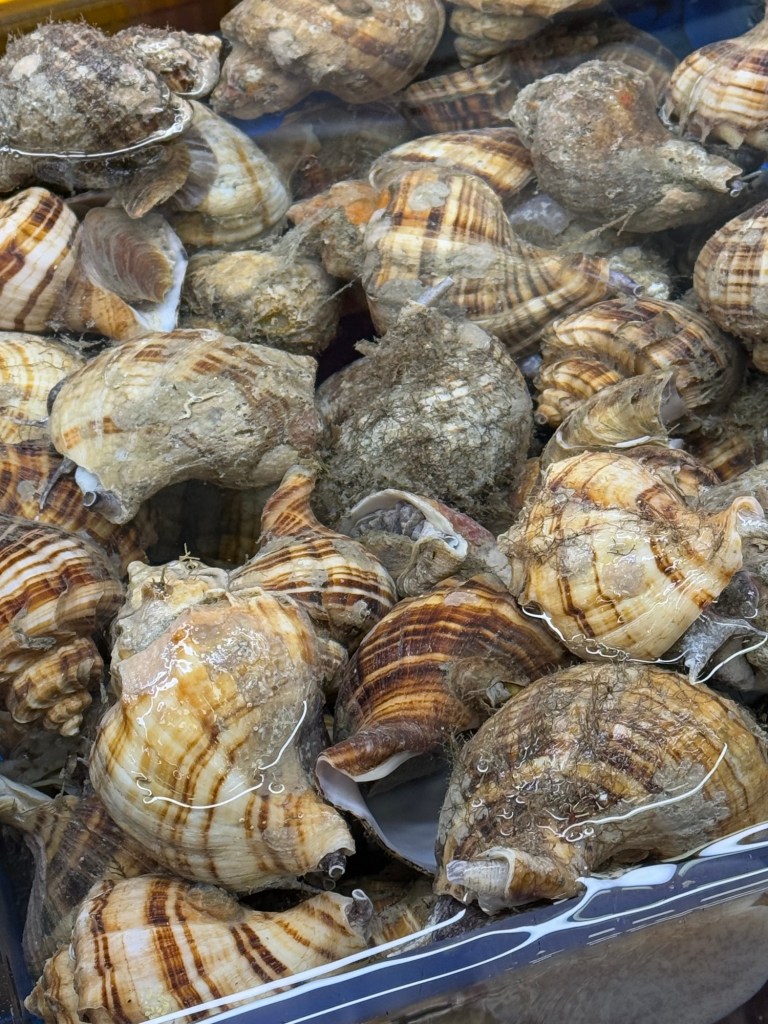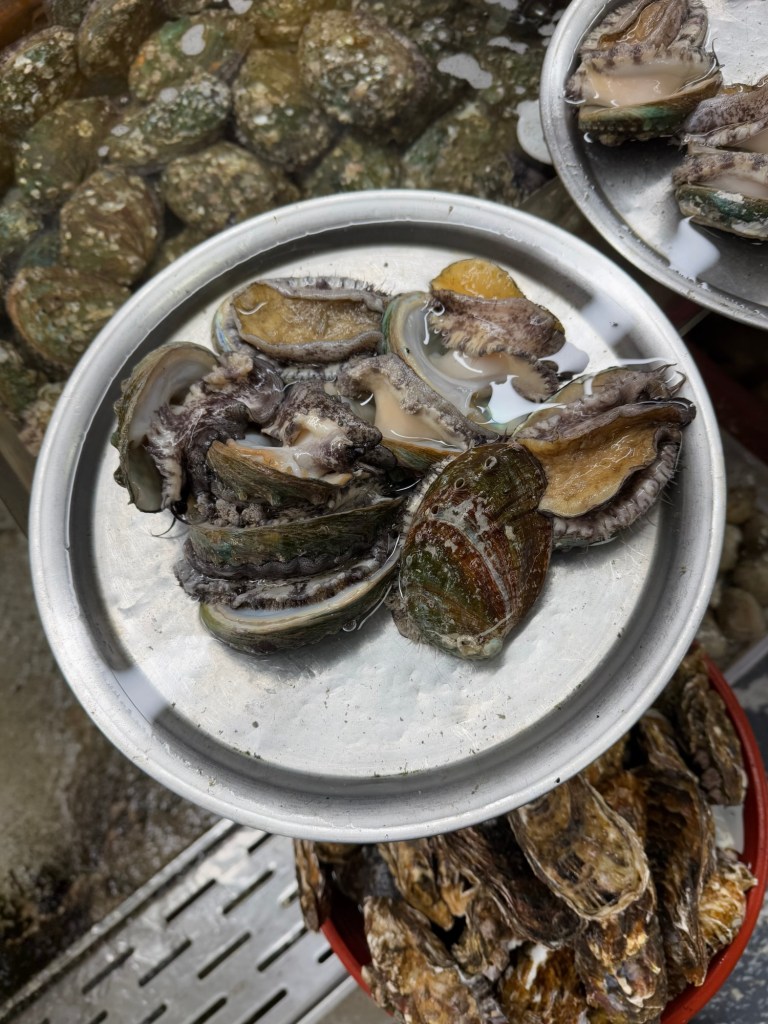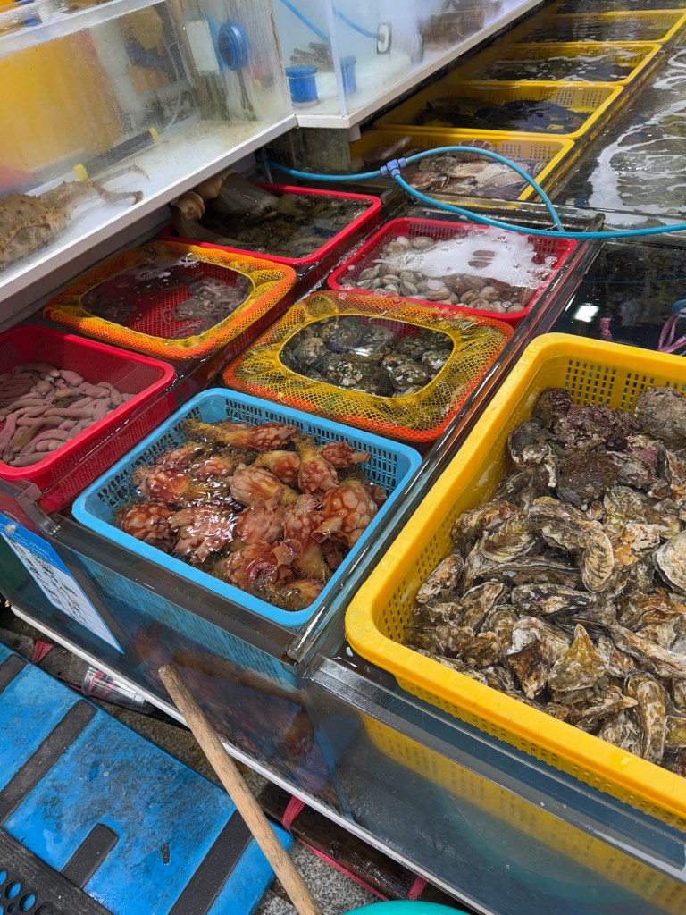 It was soooo coldThis vendor had buffs with ears that popped up… funny!EelScallopsJust outside the entranceTiny octopusAbaloneSea cumber Squirt “Penis fish”Giant crabsSome kind of conch