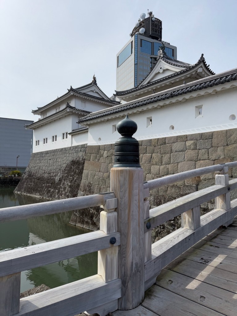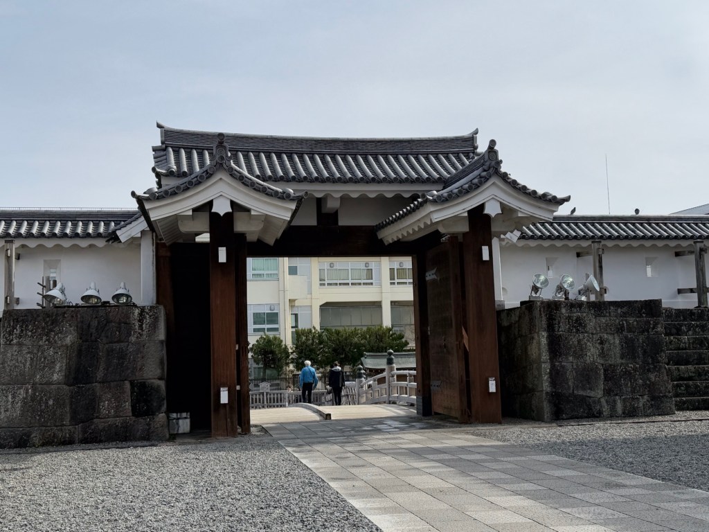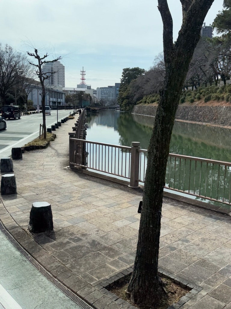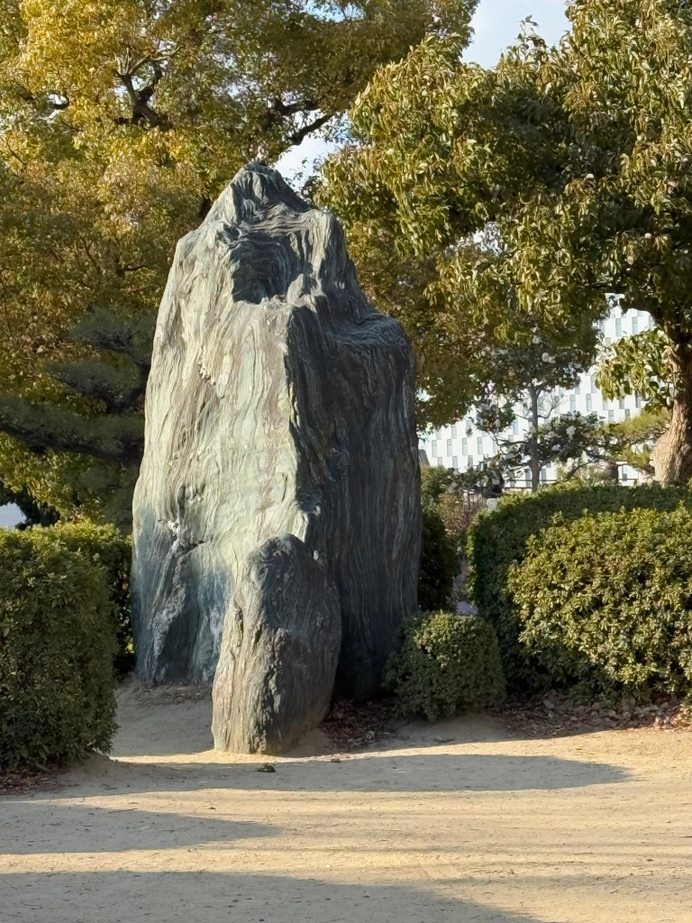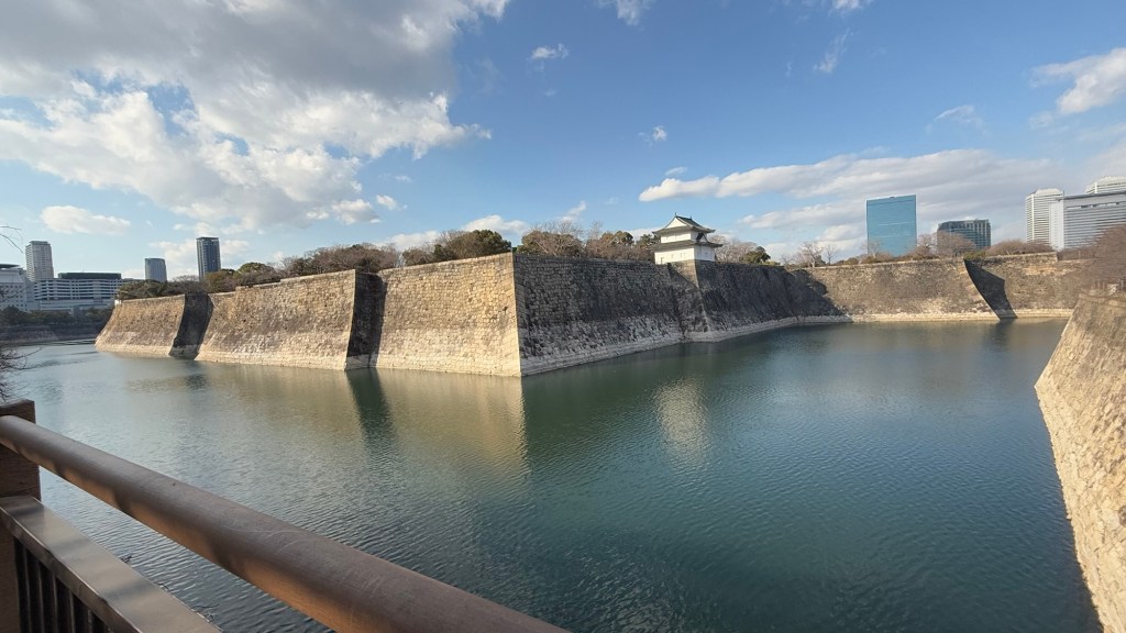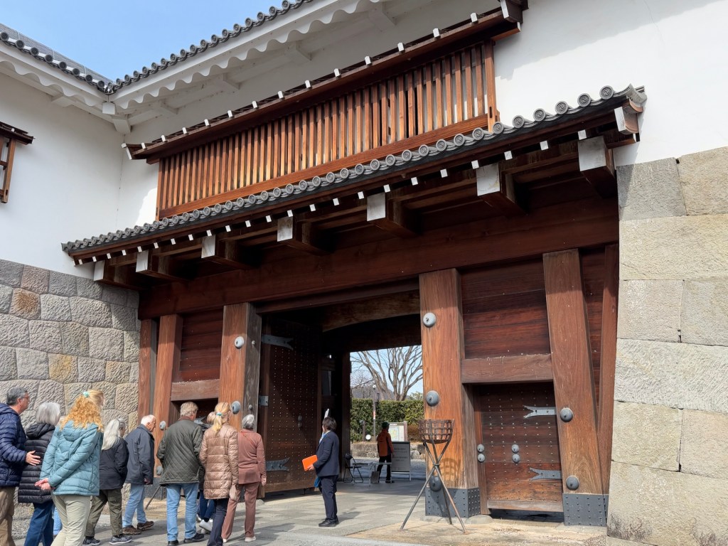 Osaka Castle where we are going today is the highest castle in Japan at 51 metres high … built in 1585. This is the 3rd reconstruction of Osaka castle. It is now concrete. Surrounded by 2 moats, the widest is 75 metres wide. The outside one is totally surrounded water, inner is part water…. Part grass or dry. It is a trap. Rock walls are original.