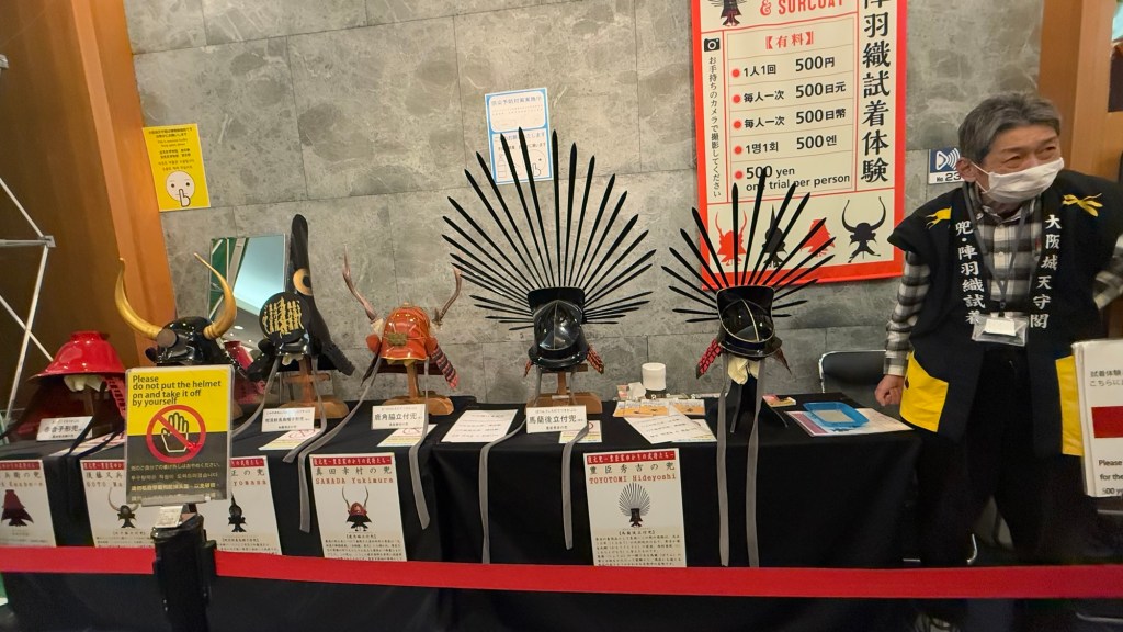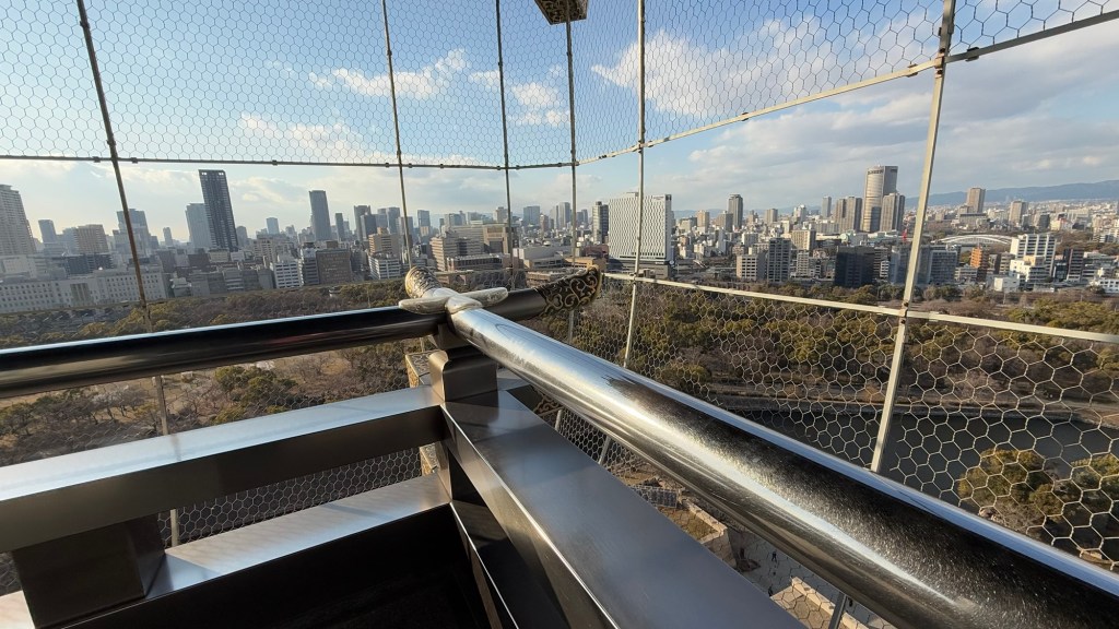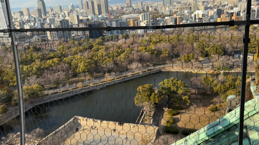 4000 cherry trees in this park. The grounds are magnificent. Before getting to the castleCheck out the optionsOver a million rocks used to make the moat. The castle was rebuilt with donations from Osaka people.They used seaweed between rocks to make it a little easier to slide. Osaka CastleThe moatEven the railings are coolThe view from atop the castle Helmets of warriors