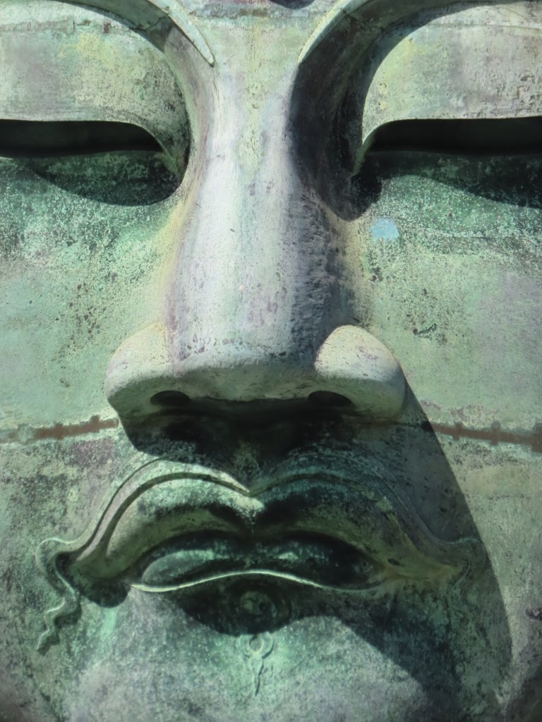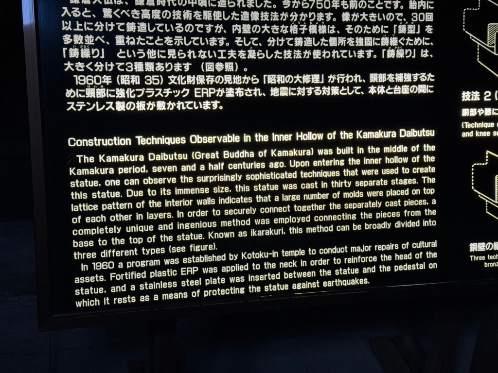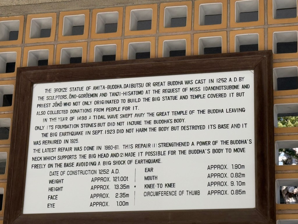 It was erected in bronze in 1252 …and was inside a temple but in 1498 a tidal wave destroyed the temple leaving the statue standing leaving the foundation stones. In sept 1923 an earthquake destroyed the base.